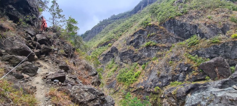 La montée débute au pont sur le Bras Rouge, entre Cilaos et l'Îlet à Cordes. Avant de partir, profiter du spectacle des cascades qui coulent ici de toutes parts (fin de la ravine des Salazes, de la Ravine Pitsa, Bassin des Salazes, etc.). Des canyonistes pendent même parfois au bout de longues cordes fixées au parapet pour rejoindre ces cascades bruyantes. Le spectacle est assuré, surtout pour les craintif du vertige. Revenir à pied vers Cilaos et rejoindre en quelques mètres le départ du sentier qui mène à la Ravine Pitsa à gauche de la route. On se retrouve près du petit torrent au pied d'une paroi oblique de lave (Photo 1). Le rocher est tellement aride qu'on n'y distingue aucun sentier. Pourtant quelques roches ont été détachées pour créer un semblant de marches. Grimper cette courte distance dénudée en cherchant le meilleur passage. Là-haut, en se retournant, on distingue très bien la route de l'Îlet à Cordes et la vallée du Bras Rouge en amont du pont (Photo 3). Le spectacle des toboggans est superbe à droite (Photo 2) mais c'est à gauche qu'il faut repérer un cairn sur un replat du rocher (Photo 4). Si le cairn vient à disparaître, chercher simplement le sentier dans la végétation basse. Un deuxième cairn confirme le bon itinéraire. On se retrouve très vite à la lisière boisée. Le sentier, étroit et de très bonne qualité, bordé de jouvences, serpente sous les bois de couleurs (Photo 5). Puis il grimpe de plus en plus fortement sur les roches et racines dans un univers boisé envahi de toutes sortes d'orchidées et de belles fougères (Photo 7) On marche sur la crête étroite mais sans peur du vide, éloigné et protégé par la végétation (Photo 8). On longe les premières barres rocheuses sur un sentier bien visible (Photo 9). Quand le sentier est étroit et en corniche, les premières cordes font leur apparition (Photo 10). Quelques trouées permettent de photographier les cascades de la Ravine des Salazes sans trop s'approcher du bord (Photo 11). On croise ça et là de beaux troncs de bois de rempart. Certaines portions sableuses et glissantes ne sont pas protégées et demandent plus d'attention (Photo 12). Plus haut c'est un pic rocheux qu'on rencontre au début d'une courte descente (Photo 18) avant de retrouver les bois de couleurs et des tapis d'orchidées ou de fougères tam-tam (Photo 15). On vient de bien s'élever et les panoramas sur la vallée se sont agrandis. On distingue le Nez de Bœuf vers le Col du Taïbit et on domine maintenant les cascades de la Ravine des Salazes (Photo 14). Une longue corde dans les jouvences indique la fin proche de l'itinéraire (Photo 16). On se retrouve rapidement face au cirque du Bras Rouge venant des Salazes, ce formidable effondrement du Gros Morne. Sur la gauche, vers Cap Bouteille, une immense fissure laisse imaginer la cascade en cas de crues. Le spectacle est grandiose et peut très bien se terminer ici pour des familles qui prendraient le risque de venir avec des enfants. Mais de belles cordes fixées à la paroi glissante donnent envie d'aller voir plus loin le spectacle de l'eau qui se précipite beaucoup plus bas (Photo 17). Par temps sec, on peut très bien marcher sans utiliser les cordes mais il est fortement conseillé de ne jamais les lâcher car, même sec, le sol sableux peut très bien partir sous la semelle (Photo 20). Le sol est caillouteux mais suffisamment large pour ne pas hésiter. De plus, les cordes servent de sécurité et de fil d'Ariane (Photo 21). Le plus long tronçon sur terrain rocheux et glissant à 45° doit se franchir prudemment, surtout si on regarde les cascades plutôt que ses pieds (Photo 23). Une fois ce bout de falaise franchi, on se retrouve sur une plateforme rocheuse assez plate d'où l'on peut admirer les chutes, bassins et toboggans du Bras Rouge (Photo 25). Le spectacle vient surtout de la haute cascade que les professionnels rejoignent par de nouveaux circuits glissants et équipés (Photo 26). On ne voit pas la totalité de la cascade mais le spectacle de la rivière vaut à lui seul le déplacement (Photo 27). La dernière corde, qu'on n'utilise sous aucun prétexte, est située près d'une plateforme herbeuse qui peut très bien servir de lieu de repos avant de redescendre. Quel pique-nique rare que de manger en regardant ces paysages uniques ! La descente est très rapide par le même sentier jusqu'au cairn en marquant le début (Photo 28).
