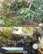 Une reconnaissance récente de ce circuit a permis de constater que plusieurs sentiers avaient été créés à force de petites erreurs d'aiguillage. RAPPEL : A la fin de la ligne domaniale venant du kiosque, on franchit une petite ravine assez profonde. Il faut remonter la pente assez rude et poursuivre sur le sentier qui fait un coude vers la droite en se rapprochant au plus près du rempart. Ne pas chercher à tourner à droite tant qu'on a pas atteint ce gros caillou à l'arête assez vive qui siège au milieu du sentier (Photo 1). Ne pas tourner à droite avant ce caillou (trait rouge) mais remonter pour atteindre le rocher dénudé entouré de branles verts (trait bleu). De ce rocher, on a un panorama de 160° sur Saint-Joseph et Grand Coude (vignette de la photo 2). Tant qu'on n'a pas admiré ce panorama, on ne réfléchit pas. Après le panorama, poursuivre dans la même direction vers le Chemin des Géraniums en longeant, au début, au plus près du rempart.