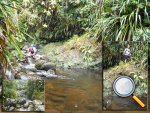 Pour ne pas manquer le départ du sentier acrobatique, poursuivre tout droit jusqu'à l'affluent du Bras Piton qu'il faut remonter sur 25 mètres (Petite vignette et photo 17). En marchant surtout dans l'eau si les galets sont mouillés, on arrive à un bassin (grande image) entouré d'un rempart semblant infranchissable. En amont de ce bassin, en rive gauche, une légère pente (Grande vignette) donne très vite accès au sentier débutant par des sabres. Le reste est difficile à monter mais facile à deviner dans la végétation.