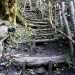 Il est temps, à cet endroit, de se poser la question du retour. La deuxième partie de la boucle étant beaucoup plus banale, il est conseillé de prendre le chemin inverse après un ravitaillement, une baignade ou un peu de repos. Sinon, traverser la Ravine Sèche, remonter un peu dans le sous-bois, marcher jusqu'à l'arbre aux racines apparentes et au tronc blessé par la lame d'une tronçonneuse. Le sentier de gauche part en direction de Moka de Palmas ; ne le prendre sous aucun prétexte. Celui de droite, plus discret, est tout de même facile à voir (Photo 26). La pente est faible sous les acacias et filaos envahis de vigne et goyaviers (Photo 27). Le passage très glissant comporte une rigole étroite creusée par les semelles. Plus bas, à gauche, on rencontre un nouveau sentier qui ressemble au sentier de l'Echelle. Là aussi, ne pas l'emprunter et poursuivre tout droit. Très vite, on rencontre la piste qui descend vers l'Espérance. Les cultures de légumes et de fleurs s'intensifient jusqu'aux premières habitations et l'on retrouve les beaux points de vue sur le chef-lieu et l'océan (Photo 28). Descendre les quelques lacets de la Rue Ravine Rose jusqu'aux chouchous proches du véhicule.