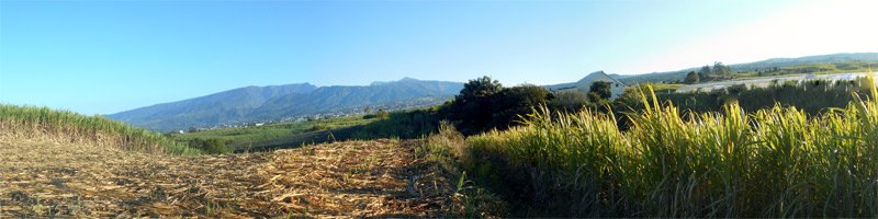 La randonnée débute au stade de Bérive, facile à trouver près de la rue du Paille en Queue qui est aussi la D3. Un grand parking permet de stationner à une cinquantaine de mètres du grillage entourant le terrain de sport. D'autres emplacements peuvent se trouver près de la chapelle et de la mairie annexe. Rejoindre le grillage entourant le stade et le longer sur quelques mètres. Repérer le sentier qui part sur la droite et rejoint ensuite la lisière du bois occupant le Piton Nathalie. On rejoint l'orée du grand bois de filaos où poussent également des troènes et des goyaviers (Photo 1). Le sentier se divise très vite en plusieurs autres indiquant que l'on peut se promener ici à sa guise tout en gardant les autres itinéraires pour la fin de la boucle. Les traces de roues de VTT montrent que l'endroit est également connu des cyclistes qui y ont installé des tremplins. Les roues ont parfois créé des semblants de fossés et on imagine les sportifs penchés pour ne pas déraper. Prendre le sentier le plus à droite avec, parfois, de fortes montées glissantes. Le passage est de bonne qualité entre les grands filaos (Photo 2). Il oblique plus haut vers la gauche et emprunte une petite descente sableuse où il faut éviter de glisser (Photo 3). Marcher vers l'ouest en longeant les installations de saut des vététistes. Guetter le petit sentier partant sur la droite et descendre vers de grands eucalyptus de la lisière nord. Enjamber le gros tronc couché de l'un d'entre eux et arriver en bordure des champs offrant déjà les premiers panoramas sur les plus hauts sommets (Photo 4). Escalader le tronc d'un énorme eucalyptus terrassé par un cyclone (Photo 5). La piste qu'on emprunte par la droite est assez envahie de hautes herbes mais elle se suit tout de même sans hésitation ni colle-colle désagréables venant s'accrocher habituellement aux vêtements (Photo 6). Elle longe et ondule en même temps que la petite ravine, affluent de la Ravine des Roches. On arrive à l'Impasse goudronnée des Tourterelles Pays qu'on suit sur moins de 500 mètres à travers les cannes et quelques habitations. Plus haut, emprunter l'agréable piste qui se dirige vers de grands eucalyptus (Photo 7). On parvient près de magnifiques champs d'ananas tout en profitant de larges panoramas sur les hauts sommets (Photo 8). A l'arrière, c'est sur l'océan que porte le regard ainsi que sur le Piton Nathalie qu'on a quitté il y a peu (Photo 9). L'état des pistes diffère en fonction de l'altitude ou des cultures. Certaines sont larges et très roulantes (Photo 10) tandis que d'autres sont un peu plus envahies (Photo 11). A l'approche des 800 m, plusieurs pistes partent dans tous les sens au milieu des cultures. C'est là qu'il faut dénicher la piste très envahie de grandes herbes qui donnent l'impression que l'endroit est abandonné. Le bouchon n'est long que d'une vingtaine de mètres mais ne doit pas décourager à poursuivre. Une fois cet écueil franchi, on se retrouve sur une piste large et creusée qui se termine au Chemin Léopold Brabant. Partir sur la gauche et marcher en direction de la Ligne d'Equerre. De l'autre côté de la Ravine des Roches, on aperçoit parfois la route qu'on utilisera pour la descente à travers les cannes (Photo 12). Laisser à gauche la Ruelle des Cormorans puis la Route des Pinsons et poursuivre en montée jusqu'à apercevoir les cryptomerias de la Ligne d'Equerre (Photo 13). Marcher jusqu'à l'école proche de ces conifères abritant un boulodrome (Photo 14). Longer l'Impasse des Mandarins et décider ou non de pénétrer dans la petite forêt où le magnifique sentier créé il y a quelques années a hélas été délaissé (Photo 15). Les curieux apprécieront les beaux arbres et tenteront de retrouver le sentier plus ou moins visible en sous-bois (Photo 16). Rejoindre le boulodrome en poursuivant sur l'Impasse au milieu des habitations (Photo 17). Rejoindre le calvaire (Photo 18) et partir à droite sur la route en direction de Bérive par une longue descente constante. Ne pas s'effrayer des épouvantails installés dans une cour par un collectionneur aux goûts originaux (Photo 19). Les détracteurs de la marche sur goudron tenteront de se consoler en cherchant les points d'intérêt de chaque côté de la route. Il n'y a pas que de la canne à sucre et l'on peut rencontrer des troupeaux de bovins et de magnifiques paysages (Photo 20). On longe des habitations isolées entourées de jardins fleuris, de nouvelles cultures diverses ou de grands eucalyptus (Photo 21) tout en profitant des points de vue sur le Piton Mont Vert et le Piton Nathalie (Photo 22). La route est étroite, la circulation faible et les cannes l'emportent largement sur le reste (Photo 23). Après une série de virages, ne pas manquer la piste partant sur la gauche en longeant une prairie (Photo 24). Le Piton Nathalie grossit à vue d'œil. Les pistes sont toujours aussi agréables malgré quelques herbes (Photo 25). La piste se termine à l'Impasse des Tourterelles Pays où l'on retrouve celle empruntée au départ. Reprendre le chemin inverse sur la piste très herbeuse et rejoindre ce qui reste de l'eucalyptus déjà enjambé au départ. Partir immédiatement sur le sentier sous les filaos et les goyaviers puis retrouver le sentier du Piton Nathalie toujours bordé des installations pour vététistes (Photo 26). Délaisser le sentier partant sur la droite à l'approche du stade car des travaux d'urbanisme l'ont détruit. Terminer sous les filaos sur un sol parfois glissant à cause des aiguilles tombées au sol (Photo 27). En repartant vers la gauche, on rencontre le sentier pris au tout départ. Rejoindre le grillage du stade d'où l'on bénéficie d'un beau point de vue sur le village de Bérive (Photo 28) puis terminer vers le parking.