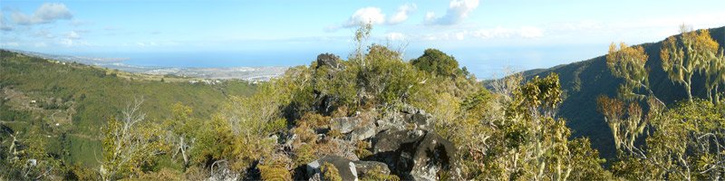 Nous voici aujourd'hui sur le circuit de Dominique qui s'entraîne ici régulièrement pour le plaisir des yeux et garder la forme extraordinaire qui l'anime. De la forme, il en faut pour cette première montée qui rejoint, 900 mètres plus haut le Sentier des Lataniers et débute par une grimpée d'anthologie de 200 mètres à travers d'anciens vergers privés (voir début du profil). A force de passages sur ce trajet de braconniers ou cueilleurs de toutes sortes et après quelques coups de machettes dans les fougères qui couvrent le sommet, Dominique nous donne ainsi la possibilité de varier nos itinéraires et de profiter des magnifiques panoramas sur l'océan depuis la crête. La boucle est d'une longueur raisonnable mais ne s'adresse pourtant pas à tous les randonneurs. Le fort dénivelé impose un entraînement correct et des passages de roches lisses constituant le sommet de la crête peuvent incommoder les personnes sujettes au vertige. Certaines portions du Sentier Joncourt, qu'on emprunte en descente, sont difficiles à suivre tant le sentier est discret mais heureusement, des rubalises et tâches de peinture, régulièrement espacées, empêchent de s'égarer.