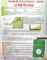 Voici détaillé le parcours qui relie Hell Bourg au Gîte de Bélouve bien que plusieurs fois décrit dans les randonnées montant au Gîte du Piton des Neiges ou au Cap Anglais. L'importante fréquentation de ce sentier de moins de 4 km méritait bien une fiche spéciale afin de rajouter images, détails et explications pour les nombreux touristes venant à Hell Bourg pour marcher ou se reposer. La montée se divise en trois parties à peu près de la même longueur mais de difficultés très différentes. Le début est peu pentu et très souvent bétonné. On poursuit par une pente un peu plus forte faite de cailloux nombreux et de marches en pierre dont certaines sont assez hautes, pour terminer par une pente beaucoup plus importante mais la plupart du temps sur de nouvelles marches bétonnées rendant l'itinéraire presque ludique. Cette montée est intégrée dans le programme de la Station de trail la Réunion-Salazie qui fournit quelques explications en début de montée sur le kilomètre vertical (Voir § ci-dessous). Le but n'est pas d'approcher les mille points en courant pour mettre 30 minutes et faire appel au PGHM au gîte de Bélouve. En revanche, la distance étant très courte, pourquoi ne pas presser le pas un peu plus que de coutume et lire son résultat au retour, sur la pancarte en fin de descente.