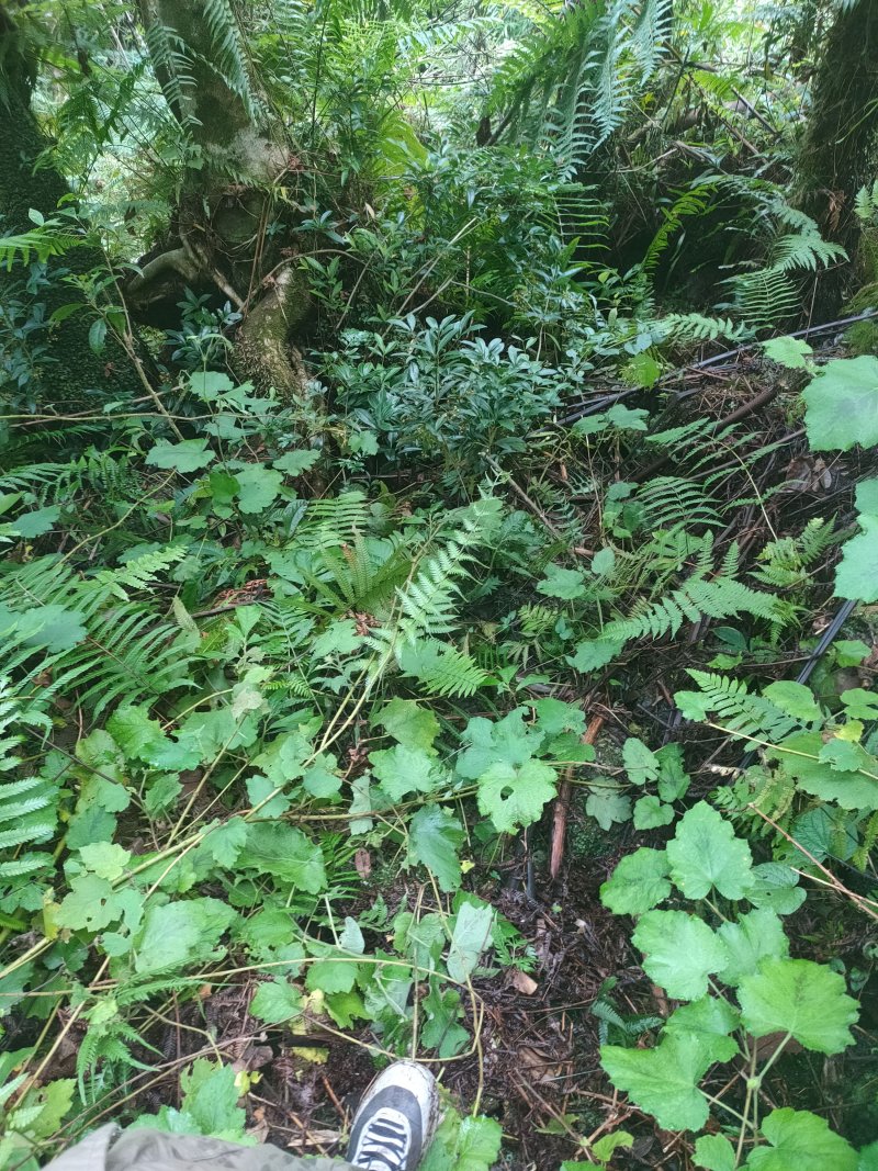La randonnée débute au parking classique du tour du Grand Etang. Longer les eucalyptus qui bordent l'aire de loisirs puis marcher sur la piste caillouteuse qui rejoint la belle étendue d'eau (Photo 1). La piste monte doucement sur des cailloux dont beaucoup ont été arrachés par les sabots des chevaux. On trouve plus facilement à poser les semelles sur le côté plus herbeux. On s'approche rapidement des berges de l'étang (Photo 2). Les alentours du Puy de l'Etang sont entourés de zones marécageuses. Poursuivre par le large sentier qui contourne l'étang par le nord (Photo 3) et repérer le départ du très discret sentier partant sur la droite, juste en face d'un rein sur l'autre rive de l'étendue d'eau (Photo 4). Le début de la montée s'effectue dans les fougères près d'un pied biscornu de jamrosats (Photo 5). On marche à plat sur une vingtaine de mètres puis le ton est immédiatement donné par la première pente à plus de 75% qui chemine entre les bois de couleurs (Photo 6). Le sentier ne servant qu'aux braconniers, il est assez difficile à suivre mais, avec un peu d'habitude, on le devine instinctivement malgré le nombre des pieds de sabres (Photo 7). Les racines constituent souvent l'essentiel du sentier (Photo 8). Les trouées sont rares et la végétation touffue (Photo 9). L'ancien sentier est encore en bon état par endroits mais sur de courtes distances (Photo 10). La végétation est extrêmement touffue, ce qui permet de mieux repérer le passage (Photo 11). Les épiphytes, orchidées et fougères poussent à même les troncs comme dans toutes les contrées humides (Photo 12). On trouve quelques zones rocheuses qu'il faut contourner (Photo 13). Après une forte montée, on se retrouve près d'une très vieille échelle (Photo 14) qui confirme le bon itinéraire. Elle est rouillée et doit se monter avec attention en fixant bien les mains sur les côtés. Les sabres marrons sont de plus en plus nombreux et on rencontre assez souvent de beaux pieds de palmistes dont il ne faut surtout pas saisir les branches épineuses (Photo 15). La montée continue jusqu'à l'arête d'où l'on bénéficie des premiers points de vue sur les pitons qui dominent l'étang (Photo 17). Mais c'est surtout le magnifique panorama sur l'étang qui fait immédiatement oublier l'effort de la montée (Photo 18). On devine la vallée de la Rivière des Marsouins à travers la végétation (Photo 19). On aperçoit dans une trouée le pylône qui domine l'étang (Photo 20). Poursuivre sur la crête vers ce pylône. A un moment, la végétation est trop touffue ou envahie de fougères et il faut obliquer sur la gauche et redescendre un peu, où se trouvent encore de belles portions de sentier encore en bon état (Photo 21). Le contournement est plat mais il faut immédiatement remonter fortement. Une fois les pylônes atteints, on bénéficie des mêmes points de vue que plus bas (Photo 22). On voit la presque totalité du lac et le regard porte même jusqu'à la côte (Photo 23). De l'autre côté, on distingue correctement la forme caractéristique en tour de contrôle de l'usine de Takamaka (Photo 25). Derrière, à l'horizon, les Deux Mamelles dépassent de l'immense forêt entourant quelques anciens îlets abandonnés (Photo 27). Rien à voir avec les Deux ou Trois Mamelles de Maurice qui se voient de très loin ; celles-ci sont plutôt des mamelons ! Inutile de chercher à poursuivre car la végétation est trop dense à cette altitude et aucun sentier n'y a jamais été tracé. Le retour s'effectue donc par le même itinéraire en prenant garde à ne pas pousser des pierres moussues et instables sur le randonneur qui se trouve en-dessous.