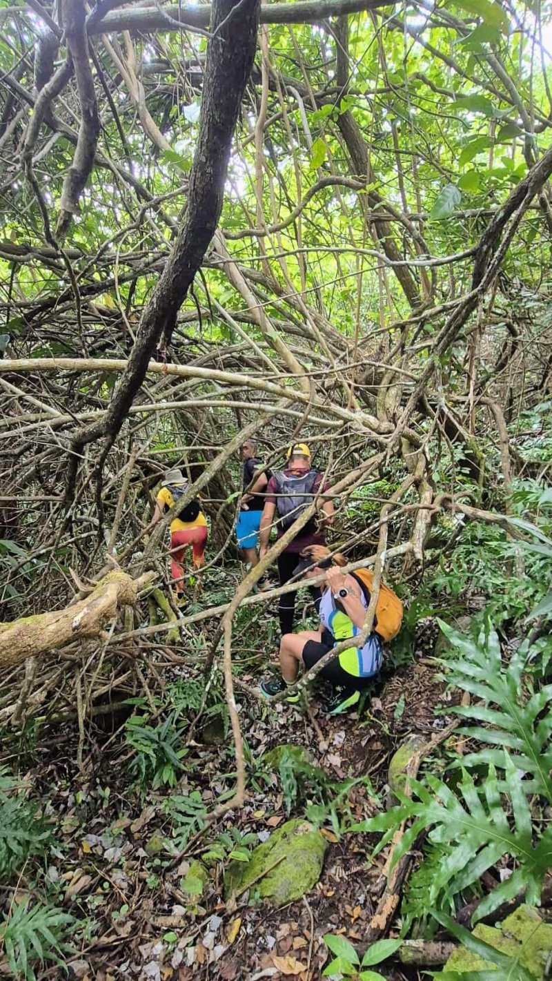 Une trace remarquée lors de la boucle utilisant une partie de la Crête des Lataniers a été le facteur déclenchant de recherche de cette nouvelle sortie dans la région du Verger Rosthon. L'équipe d'entretien des sentiers de la région, interrogée au sujet de cet itinéraire a précisé qu'il est prévu de le réhabiliter au même titre que ceux présentés sur d'autres circuits partant du verger. Le problème actuel semblerait provenir d'une personne vivant dans les hauts de la Petite Ravine des Lataniers. L'intéressé, rencontré lors de cette boucle semble un peu singulier, parle seul, très fort, et donne de loin l'impression que trois ou quatre personnes dialoguent en même temps dans sa case en tôle où il vaut mieux ne pas le rencontrer. Il faut absolument l'éviter car ses réactions semblent totalement imprévisibles et la meilleure solution consiste à passer son chemin sans chercher seulement à l'apercevoir. Pour cela, tourner immédiatement à gauche sous les filaos (voir § suivant) et ne remonter vers la droite sous aucun prétexte. Les randonneurs à l'esprit un peu aventurier effectueront cette boucle avec plaisir. Les autres attendront le nettoyage complet du sentier qui donne l'occasion de magnifiques panoramas sur les hauts des Ravines des Lataniers, sur le Port et la région de Saint-Paul. Le retour emprunte une assez longue portion de route mais traverse de très agréables lotissements par de longues descentes reposantes.