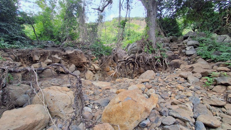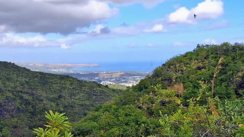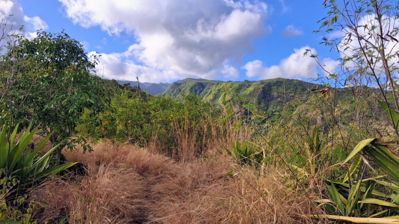 La randonnée débute à ce verger lontan appelé Rostonne et affiché un peu partout Rosthon (Photo 1). Cheminement à plat le long de la ravine, traversée de celle-ci, arrivée dans le verger ombragé sont déjà décrits dans la Randonnée familiale ou dans la Boucle un peu plus longue. Suivre la belle allée qui débute au panneau facile à trouver près du pont de la Grande Ravine des Lataniers à la fin de la Rue Evariste de Parny. Traverser à ravine au fond caillouteux et rejoindre les premiers manguiers qui envahissent le parc Rosthon (Photo 2). Prendre à droite et traverser le verger pour longer la Petite Ravine des Lataniers sur une piste herbeuse et agréable. Laisser à droite celle menant aux Lataniers (panneau) car elle a été défoncée après la construction de logements. Poursuivre jusqu'à la première piste à droite menant aux carrières. Traverser la totalité de l'ancien chantier (Photo 3), ne pas prendre la crête au pylône électrique mais bifurquer à gauche, suivre le bord du rempart artificiel et redescendre vers la Petite Ravine des Lataniers. Ne pas franchir le gué mais tourner à droite à un arbre aux branches écartées semblant donner la direction. Une forte pente très caillouteuse débute rapidement (Photo 4), suivie d'une autre encore plus forte (Photo 5) où il est très difficile de trouver de la terre entre les hautes marches constituées de roches. Après ces difficultés, on parvient à la crête à la rencontre du sentier venant des carrières. Prendre vers la gauche et poursuivre cette belle montée en pente douce qui rejoint plus haut les pylônes de la ligne haute tension. De beaux rochers à travers les tamarins décorent la crête. On retrouve à gauche le croisement du sentier de la boucle venant de la Petite Ravine. Poursuivre tout droit. Moins utilisé que les précédents, il devient plus étroit, plus herbeux et se rapproche de la vallée de la Grande Ravine des Lataniers (Photo 6). Les paysages sont très agréables, tant sur les pitons que vers la mer malgré le caractère très industrialisé du Port. Un sentier part sur la droite en direction du village qu'on aperçoit au fond de la vallée (Photo 7). Les randonneurs tentés par la descente se retrouveront assez vite devant une cabane rustique (Photo 8) en employant un sentier assez facile malgré la descente caillouteuse et les racines (Photo 9). Inutile de chercher à poursuivre sans danger car ce sentier engorgé ne sert plus et impose un demi-tour vers la crête. A partir du précédent croisement, c'est de l'aventure sans l'être vraiment car on ne perd jamais la trace de quelques chasseurs de guêpes passant toujours au même endroit (Photo 11). Suivre ce sentier sans jamais réfléchir car la crête ne dépasse pas les 10 mètres de largeur et on chemine toujours au sommet, bénéficiant ainsi de quelques vues sur la vallée de la Grande Ravine des Lataniers (Photo 12). La végétation est surtout composée de grandes herbes, d'arbustes rachitiques ou de chocas traversés par l'étroit sentier (Photo 13). Le sentier reste cependant visible dans ces zones plus touffues qui dominent la crête (Photo 14). Il frôle quelques roches plus grosses que les autres pour de nouvelles vues du la vallée (Photo 15) et se poursuit toujours sans difficulté (Photo 16). Il ne faut commencer à se poser des questions qu'à partir d'un gros manguier cancéreux couvert de fougères (Photo 18). Partir vers la gauche, écraser quelques fougères qui envahissent vite la trace et se retrouver dans un bois de goyaviers où les chocas ont presque envahi tout le sol (Photo 19). C'est la seule difficulté de la boucle de 10 km car il faut traverser une centaine de mètres, presque à plat, dans la végétation touffue. Suivre pour plus de sérénité les traces de coupe-coupe données aux chocas barrant le passage. On se retrouve ainsi sur un beau sentier dans le bois de filaos aperçu depuis le début de la crête (Photo 21). Ne prendre à droite sous aucun prétexte et bifurquer à gauche sur les aiguilles de filaos (Photo 20). Descendre vers la ravine, passer une rudimentaire barrière de branches posée là par la personne vivant plus haut, franchir le gué et poursuivre sur le sentier jusqu'à une ancienne piste bordée de fougères (Photo 23). A partir de ce point, c'en est fini de toutes les difficultés car il suffit de suivre les pistes étroites car envahies (Photo 24), larges avec beaux point de vue sur la Port (Photo 25), petites routes proches de propriétés agricoles ou maraîchères (Photo 26), route principale de la RD 41 (Photo 27) ou les raccourcis entre ses lacets bordés de superbes villas entourées de non moins jolis jardins. On parvient, après une douzaine de lacets en descente, à l'aire de loisirs de la Corniche. A partir de ce point dominant la vallée, plusieurs manières de rejoindre le point de départ sont possibles (voir les deux autres randonnées). L'itinéraire proposé descend par les citernes rouillées, la piste longeant la Petite Ravine, le gué (Photo 28) et le trajet pris à l'aller mais bien d'autres solutions sont possibles pour raccourcir ou rallonger ce retour au parking.