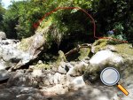 Un cassé de la montée qui ne paye pas de mine est pourtant plus délicat à franchir que les autres de la sortie. La hauteur est faible mais la chute de moins de deux mètres est constituée de basalte lisse qui laisse peu de prise aux mains et aux semelles. Repérer sur la droite en montant un tronc de bois maigre apporté par les eaux (attention, il disparaîtra au prochain cyclone). Se rapprocher de ce tronc puis de la falaise derrière lui et repérer une racine qui dépasse. Elle servira à mettre les mains et ainsi poursuivre vers l'amont par un passage un peu vertigineux, étroit et très vertical mais peu dangereux si on prend bien soin de maintenir fermement le tronc. Ne pas chercher à monter ailleurs car la falaise est verticale et assez longue. On marche moins de 10 mètres sous les arbres assez espacés pour ne pas gêner.