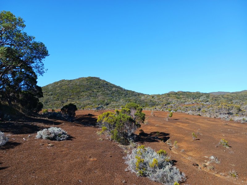 La randonnée débute au Piton de Sable dont le fond recouvert d'eau donne de beaux clichés de jour lorsque le Piton des Neiges s'y reflète. Le matin, très tôt, ce sont les nuages et le pylône du Piton Textor qui miroitent (Photo 1). Attention, il n'y a pas d'eau toute l'année mais on est assuré d'en voir après les forts épisodes pluvieux. Après cette balade semi-aquatique, rejoindre la route forestière du Volcan par n'importe quel itinéraire, comme sur la carte ci-dessous, pour bien débuter ce hors sentier de près de 10 km. Prendre la direction du Piton de Caille en filant plein nord sur des sentiers existants ou déjà en traversant la savane entourant le Piton Textor. Le centre du cratère du Piton de Caille, déjà escaladé lors d'une autre randonnée, s'atteint par un petit sentier de vaches rencontré en marchant sur le Sentier du Piton Textor. La pente est faible et le cheminement s'effectue un peu penché en raison des branches basses. La prairie qui en couvre le fond incite au bivouac malgré l'absence d'eau (Photo 2). Poursuivre vers le nord et cherchant le meilleur passage entre les plantes (Photo 3) et en repérant au plus vite la petite ravine qui grandit au fur et à mesure de la descente vers le cassé du Grand Bras Piton. On randonne sans difficulté en longeant la ravine ou ses abords dans les zones dénudées ou couvertes de petites plantes, principalement les branles verts (Photo 4). Les panoramas sur la Plaine des Palmistes et les grands massifs de la Réunion deviennent de plus en plus larges, du Piton des Neiges jusqu'au Mazerin (Photo 5). Plus on approche du cassé, plus il faut suivre le fond étroit de la petite ravine où les amateurs de natures mortes se régaleront des belles trouvailles (Photo 6). On parvient ainsi à une profonde vallée de 300 mètres de profondeur où l'on aperçoit le lit chaotique du Grand Bras Piton. Attention à la chute car la falaise est vertigineuse mais la vallée est magnifique (Photo 7). Pour rejoindre le Grand Bras Piton, rivière principale de la zone, il faut revenir sur ses pas et obliquer sur la gauche dès que le sol dénudé revient. Ne pas hésiter à descendre cette ravine basaltique offrant tous les 10 mètres une petite merveille de la nature. Attention tout de même lors des franchissements de plus en plus difficiles vers le cassé qui ne sont pas obligatoires. Le sentier, ou plutôt le passage, s'effectue par moments sur de belles plaques de lave jaunies par les oxydes (Photo 9). Repartir en remontant la ravine, le plus souvent dans le fond (Photo 10). On remarque sur la gauche des poteaux et une clôture barbelée qui semble sortie de nulle part (Photo 12). Rejoindre cette longue enfilade de poteaux réguliers et la suivre au plus près. Il faut parfois s'en éloigner d'une dizaine de mètres pour contourner une touffe de plantes, mais on la retrouve très vite. On arrive près d'une petite case en tôle (Photo 14) entourée de beaux tamarins (Photo 13) avant de rejoindre à nouveau le fond de la ravine (Photo 16). Remonter un peu sur le basalte puis obliquer sur la gauche pour entamer une rude montée vers le sommet du Piton des Treize Cantons. Il y a partout des sentiers de vaches et le but consiste à atteindre le haut par le chemin le plus court pour les sportifs ou le plus sinueux si la fatigue se fait. Le fond se trouve facilement après cette petite grimpette. On retrouve une nouvelle prairie qui tapisse le fond du cratère, fort heureusement délaissée de toute plante invasive (Photo 17). On a de ce bord de piton de magnifiques vues sur la Plaine des Palmistes (Photo 18). Le cheminement reprend dans les branles (Photo 19) pour se retrouver nez à nez avec cette longue clôture barbelée. Reprendre donc le chemin en longeant toujours au plus près sur une forte descente (Photo 20) bordée de magnifiques tamarins des Hauts aussi biscornus les uns que les autres (Photo 21). Même les arbres morts sont superbes. La clôture fait de nombreux zigzags et il suffit de la suivre sans réfléchir. Elle se termine à la Route Forestière du Piton de l'Eau. Traverser la RF, retrouver le sentier du Piton de l'Eau et le franchir pour garder à l'esprit le hors sentier total. Viser le petit piton, bien visible dans la végétation (Photo 22. Comme précédemment, chercher les meilleurs passages pour franchir le col entre deux nouveaux pitons. On retrouve sans surprise le Grand Bras Piton dont un affluent propose un petit coin très sauvage près d'un cassé de cascade (Photo 23). Ne pas hésiter à l'atteindre. On devine même une grotte en partie cachée par des tamarins maigrichons et de grands branles verts (Photo 24). A partir de là, on aperçoit certains virages de la route du volcan et des véhicules qui servent de repères. Marcher sur les meilleurs passages, souvent recouverts de lapillis (Photo 25) entre la route et le sentier du Piton de l'Eau. De minuscules ravines creusées dans le tuf orangé créent ce beaux paysages (Photo 26). Le pylône du Textor sert également de repère s'il n'y a pas de brouillard (Photo 27). Les balises rouges et blanches rencontrées en fin de ce long hors sentier indiquent qu'on a retrouvé le GRR2 qui remonte à l'Oratoire Sainte-Thérèse. Suivre le GR jusqu'à la route et au parking du Piton de Sable.