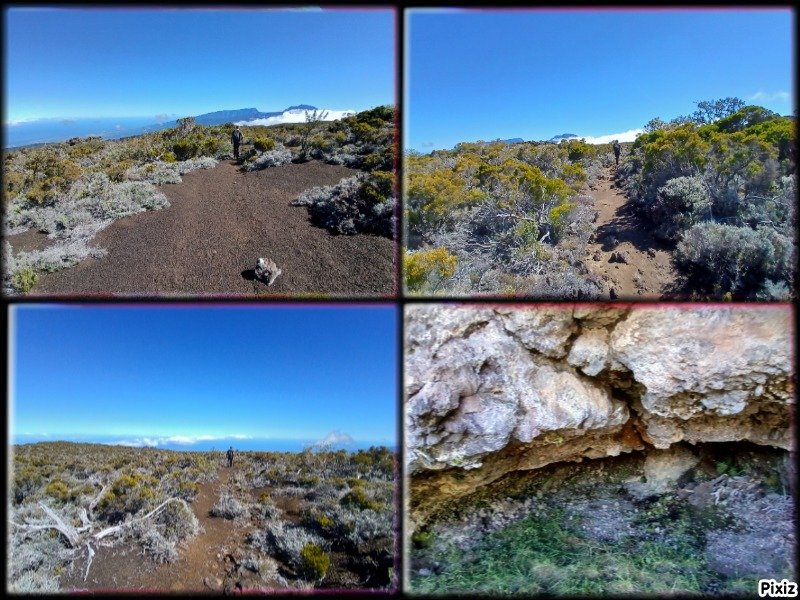 La randonnée débute au Pas des Sables où un parking attend les visiteurs qui s'empressent de monter au petit belvédère afin de photographier la Plaine des Sables sous toutes ses coutures. Ne pas hésiter à s'y rendre, mieux, emprunter sur moins de 100 m le sentier de l'Oratoire Ste-Thérèse pour une vue d'ensemble beaucoup plus profonde. Partir calmement sur les plaques de lave puis sur le sentier de bord qui chemine, tantôt sur des petits lapillis glissants ou sur des cailloux de lave (Photo 1). Certains arbres morts créent déjà de belles natures mortes (Photo 2). On domine la Plaine des Sables pour une bonne heure et on se régale déjà de la vue du Chisny qui cache à peine le Piton de la Fournaise (Photo 3). Le sentier ne s'éloigne jamais de plus de 30 mètres du bord. Dans l'ensemble, les obstacles et les hautes marches sont rares et la randonnée est agréable, surtout que la pente est insignifiante. La végétation est la plus haute de toute celle qu'on traversera au long de la matinée. Elle est constituée presque exclusivement de branles, petits tamarins des hauts, ambavilles et fleurs jaunes (Photo 4). Au pied du morne, commence le grand cassé minéral créé par une coulée spectaculaire qui s'est figée jusqu'à la prochaine éruption (Photo 5). En cherchant bien, on devine le sentier qui redescend vers Grand Pays et Grand Galet. Ne pas manquer l'arche naturelle et la première grotte à gauche du sentier avant d'arriver à la grande grotte, marquée sur la carte d'un point noir, pouvant abriter plusieurs personnes (Photo 7). Plus loin, le sentier commence à descendre en direction des antennes qu'on aperçoit au loin. Au point de vue, les paysages sont impressionnants vers Grand Pays, Grand Coude, Grand Galet et la côte (Photo 9). La première partie, la plus facile est terminée.