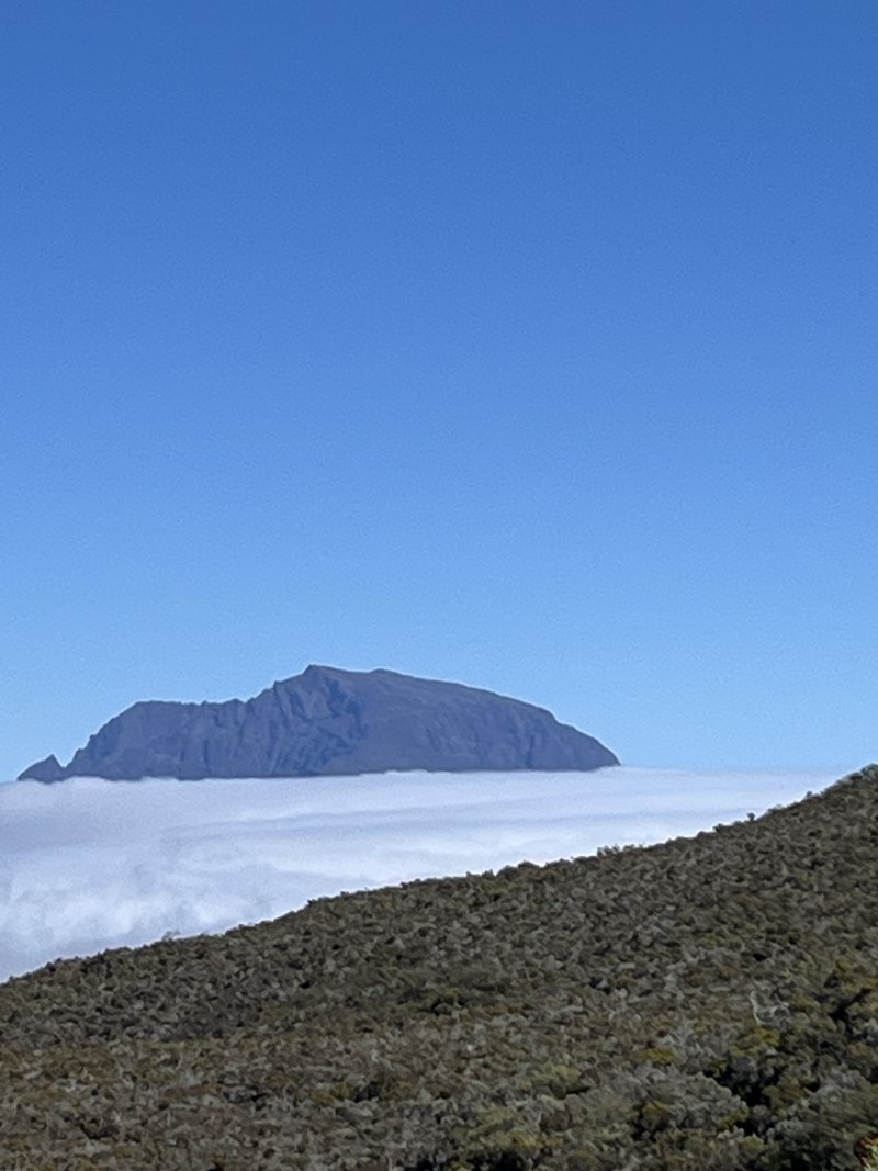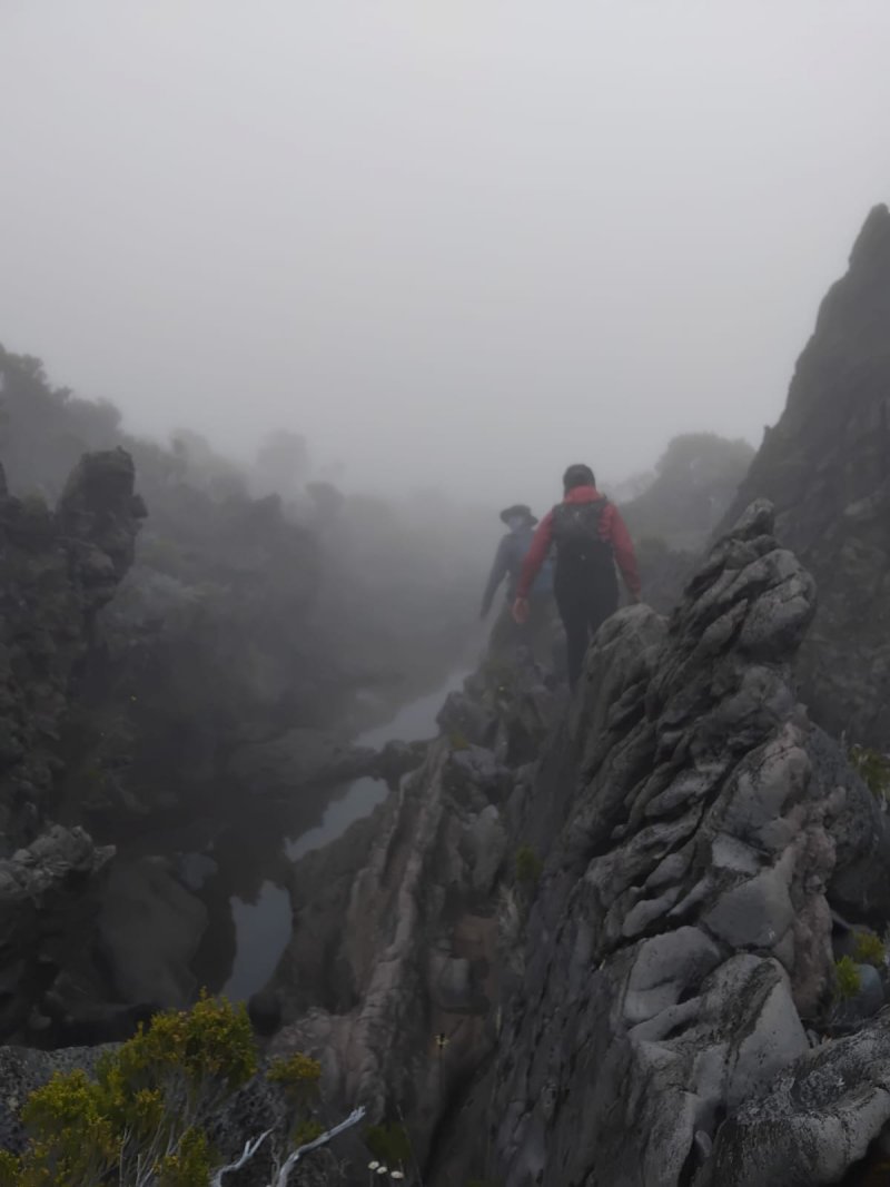 Voici un nouveau hors sentier pour visiter les alentours du Morne Langevin jusqu'au Piton Rouge des Remparts. La sortie du Morne Langevin permet de suivre un agréable sentier au nord pour rejoindre le point de Vue sur le Sud et la vallée de Grand Pays. Un autre sentier traverse le morne du Sud au Nord pour rejoindre la Caverne de Cotte. Mais ce sentier est fermé officiellement par arrêté et n'est plus emprunté depuis longtemps. C'est dommage car les paysages traversés sont très agréables ; l'éboulis de Mahavel a laissé de grosses séquelles et le sentier qui borde la falaise emportée passe près de fissures importantes donnant à penser que des roches continueront à tomber 1300 mètres plus bas. Comme il a déjà été maintes fois écrit sur ces pages, cette fiche n'est en rien une incitation à parcourir l'itinéraire proposé et chacun prendra ses responsabilités. L'ancien sentier est encore bien visible, le hors sentier est sans danger et les paysages traversés comportent peu de végétation. La meilleure solution pour éviter tout danger près de l'éboulis est d'en contourner les bords en s'éloignant d'une cinquantaine de mètres dans les terres. Passé cet écueil, ce sera un vrai plaisir de fouler des terres où même les braconniers ne viennent pas puisque aucun gibier ne vit à ces altitudes, excepté quelques lièvres. Il faut s'abstenir de grimper le Piton Rouge des Remparts en venant de cette direction en raison des grandes plaques tombées au sol qui rendraient l'escalade dangereuse. Le Puy du Pas des Sables n'a pas toujours de l'eau sinon les photos prises du haut du petit piton seraient plus attrayantes.