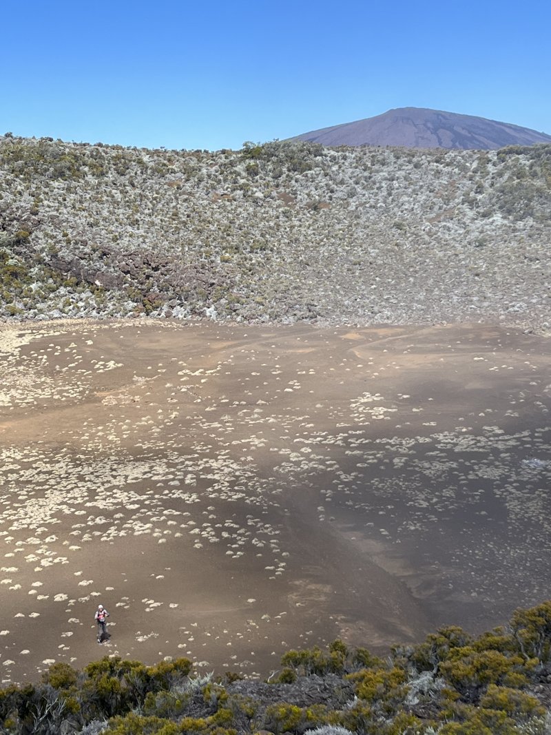 C'est le début du hors sentier, qui, paradoxalement, va s'avérer le plus agréable de la boucle. La végétation est parfois rabougrie (Photo 18), parfois inexistante et rarement touffue (Photo 19). Comme toujours dans ce type de marche, prendre au hasard du sol en se fixant des objectifs visuels. Ici, c'est le Piton Rouge des Remparts qui sert de repère et de cible. La trace ci-dessous semble zigzaguer dans plusieurs directions. Elle reflète simplement les dizaines de petits détours pour éviter des plantes. En suivant à la lettre cette trace, testée pour l'occasion, on est certain de revenir au véhicule sans une égratignure, donc en préservant les plantes. Le rempart qui domine le Piton de Colignet et le Bras Caron n'est pas dangereux et offre de magnifiques points de vue sur la vallée (Photo 17). On peut donc le frôler sans danger. Prendre son temps à la traversée de la Ravine Germeuil pour la visiter et dénicher des petites merveilles de la nature rarement observées ailleurs comme ce dolmen naturel (Photo 20) ou ces plaques empilées dans le fond. Il faut faire un détour par la droite pour descendre dans le lit mais il permet de se balader dans des zones totalement vierges (Photo 21). A partir du dolmen, filer tout droit vers le Piton Rouge des Remparts (Photo 22). La végétation grandit un peu mais les espaces vides sont toujours là. Au pied du piton, remarquer cet empilement de larges plaques tombées au cours des siècles (Photo 23) et ne pas chercher à remonter vers le sommet. On serait de toute façon bloqué au rempart infranchissable. Contourner le piton et viser désormais le Puy du Pas des Sables qui sert de nouvelle cible même s'il dépasse peu de la végétation (Photo 24). On peut passer n'importe où en évitant les branches. Des vieilles bombes volcaniques gisent parfois au sol (Photo 25). L'escalade s'effectue en deux étapes et on arrive au sommet en moins de 20 minutes pour apercevoir la route forestière et les véhicules allant au Pas de Bellecombe. S'il y a de l'eau dans le cratère, c'est mieux mais en son absence, le spectacle est aussi agréable (Photo 27). Faire le tour par la droite et rejoindre le Pas des sables en cherchant le meilleur passage dans le même type de végétation que précédemment.