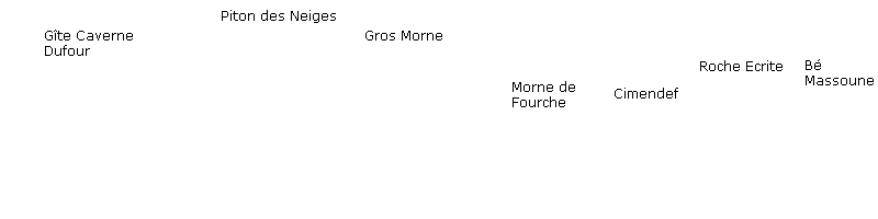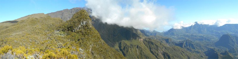 Cette troisième étape du tour du Piton des Neiges est la plus difficile en raison de la montée constante vers le Gîte de la Caverne Dufour sur un sentier le plus souvent boueux. La grimpée n'en finit jamais mais on longe heureusement le rempart par moments pour profiter de panoramas sur le Cirque de Salazie et plus haut vers la Fournaise et la Plaine des Cafres. Il faut compter une quinzaine d'échelles en aluminium qui aident au franchissement des parties les plus verticales. L'arrivée au gîte est un soulagement mais il faut tout de même songer à la descente qui est également interminable. L'aller-retour au sommet n'a pas été intégré à cette boucle qui est censée ne jamais s'écarter du GRR1. Et ce n'en est pas terminé du GR en arrivant au Bloc car il repart allègrement vers le Plateau des Chênes. Comme la boucle est presque terminée au sentier de découverte, prendre un peu de temps pour admirer les panoramas sur Cilaos depuis le haut de la Roche Merveilleuse ou effectuer quelques écarts sur le sentier botanique.