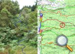 En fin de boucle, pour voir de plus près la piste qui remonte entre les kiosques et en la suivant jusqu'à la fin, on se retrouve sur une ligne domaniale. En partant sur la gauche vers la Ligne de la Grande Ravine, on est obligé de traverser deux ravines. Si la première est aisée et ne pose aucun problème, la seconde est impressionnante (point rouge). Il faut descendre d'une trentaine de mètres en lacets dans les jouvences qui ont recouvert le sentier. Cette descente passe encore en prenant garde. La traversée de la ravine est étroite et assez facile, toujours sur les jouvences qui cachent le sol. En revanche, on utilise un acacia noir tombé au sol sur les trois premiers mètres de la remontée. Il faut faire TRES attention à la chute car le tronc est glissant. En cas de doute en haut de la butte, faire demi-tour et retraverser la forêt de cryptomerias. Si on décide de ne pas effectuer cet écart, ne pas partir entre les kiosques et filer tout droit sur la route (itinéraire bleu).