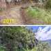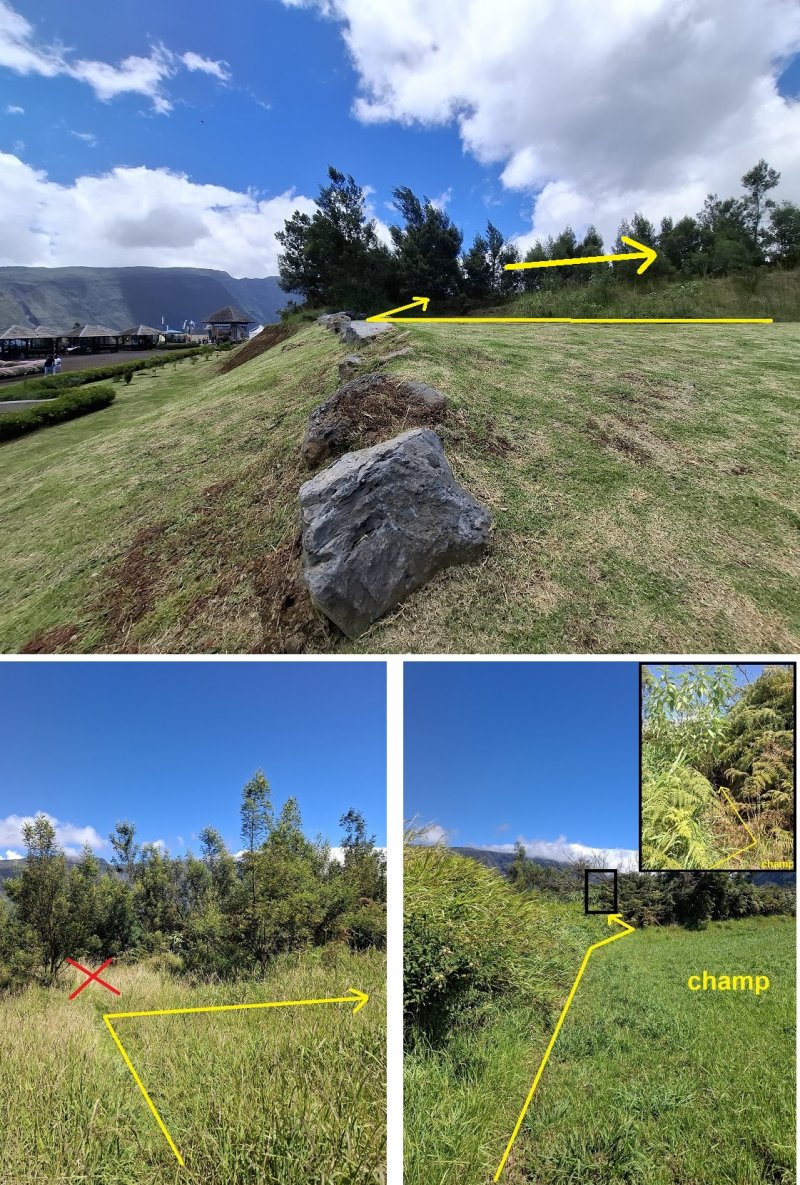 Pour trouver le début du sentier facilement, ne pas marcher trop près du bord en quittant le parking. Partir dans la prairie constituée de hautes herbes coupées régulièrement par zones pour nourrir les animaux et poursuivre entre deux grosses touffes d'acacias (flèche rouge) avant de rejoindre enfin ceux poussant plus au bord. Un sentier grossier débute en sous-bois (vignette) sans qu'on puisse apercevoir les arbres couchés. Ce sentier effectue quelques virages au gré des obstacles du terrain ou de la végétation. On ne peut alors manquer ces arbres couchés au sol dépourvu se végétation. Ramper sur deux mètres sur cette terre rouge avant de trouver un véritable sentier utilisé par les braconniers, les chasseurs de guêpes ou les agents de l'eau venant nettoyer les crépines ou réparer les fuites.