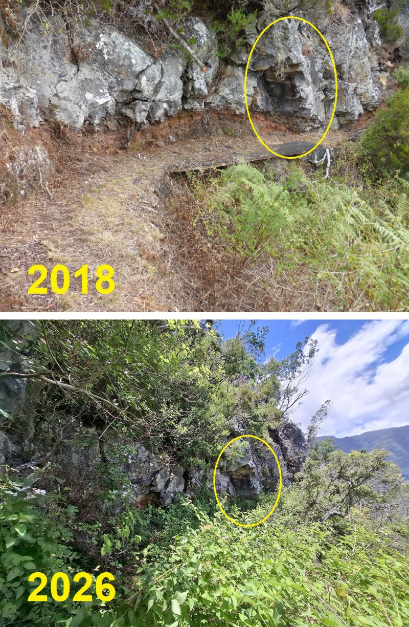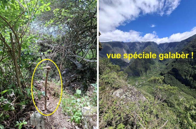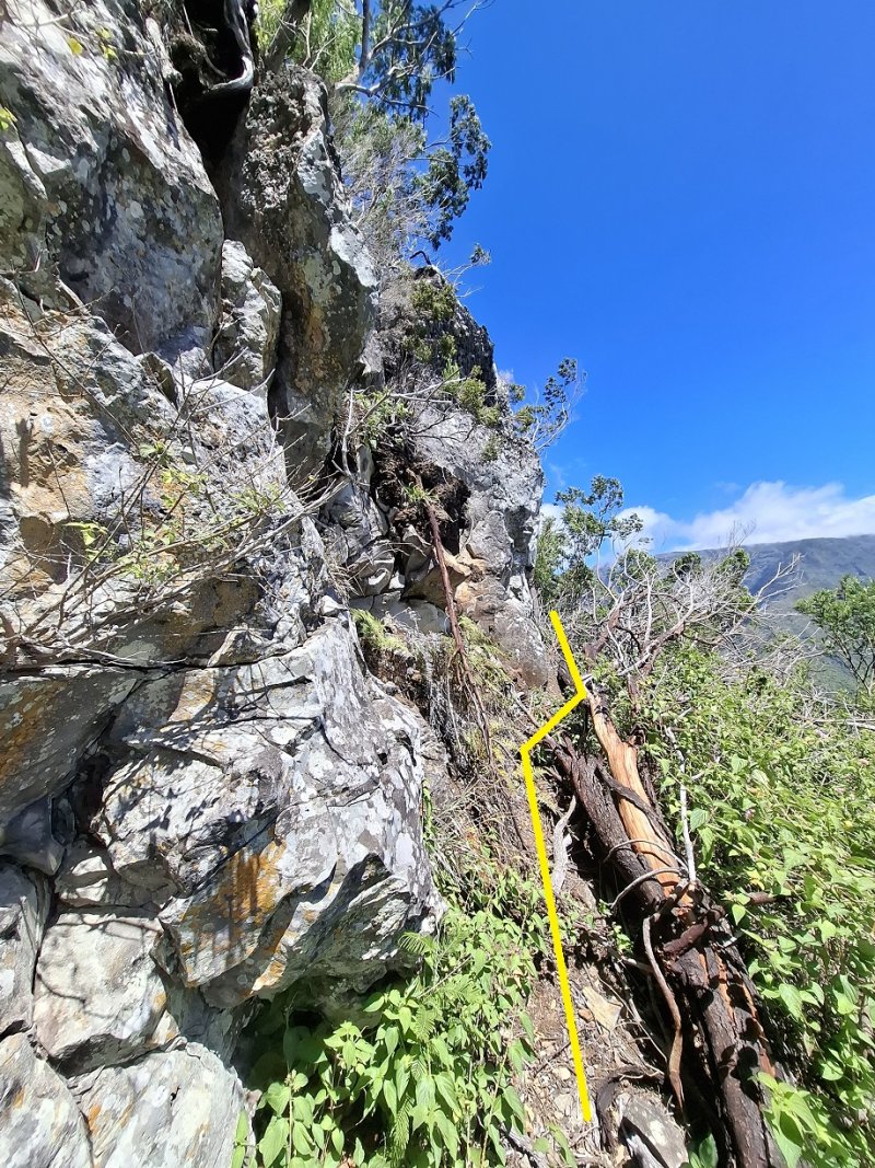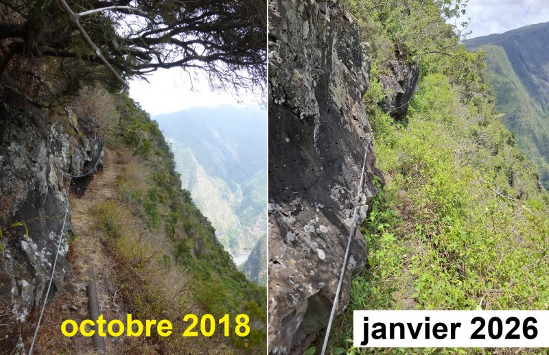 La randonnée débute au parking qui entoure la citerne couverte de graffitis, au plus près de l'Horloge à Eau de Bois Court. Rejoindre le départ du sentier à travers la prairie et les acacias (voir § ci-dessous). L'un d'entre eux est tombé au sol et il faut un peu ramper sur deux mètres pour gagner le bord. La descente est immédiate et parfois abrupte (Photo 1). Tout est utilisé pour cette courte descente : les jambes, les mains, les fesses. Heureusement quelques branches sont situées au bon endroit. On arrive en dix minutes sur un magnifique sentier, large et propre (Photo 3) pour les premières vues sur la vallée du Bras Sec (Photo 4) et sur le village de Grand Bassin (Photo 5). Le cheminement est très facile, presque totalement à plat en longeant le plus souvent de hautes barres rocheuses (Photo 6). Le tuyau affleure par moments quand il n'est pas totalement recouvert de la terre du sentier (Photo 8). La végétation est parfois haute sur les bords et doit très vite envahir le sentier sans entretien fréquent (Photo 10). Un premier passage étroit et dangereux, très bien équipé d'un câble d'acier domine un vide impressionnant (Photo 11). Il suffit de tenir fermement ces mains courantes et le danger est moindre. Il en sera ainsi sur une cinquantaine de mètres le long de la haute falaise (Photo 12). A certains moments, on peut apprécier les anciens travaux en voyant les tuyaux courir le long de la paroi (Photo 13). Le circuit effectue parfois de courtes montées suivies de remontées faciles, sur un sentier toujours large et propre offrant le plus souvent de magnifiques panoramas sur la vallée du Bras Sec. On aperçoit depuis longtemps une passerelle qui traverse l'amont de la vallée étroite. En arrivant au plus près (Photo 14), on constate qu'il s'agit de la canalisation tendue entre deux câbles de soutien (Photo 15). En voyant la falaise de 200 m de haut, nue et abrupte, on comprend pourquoi il n'a pas été possible d'y faire passer le tuyau. La première véritable descente du trajet débute à la passerelle et rejoint le fond de la ravine. Les cailloux du pierrier constituent de très hautes marches humides recouvertes de renouées (zerbe corail) glissantes. Le fond de la ravine, comme son nom l'indique, est sec hormis quelques gouttes tombant de la haute falaise (Photo 18). Le fond caillouteux d'un bassin indique que l'eau y arrive parfois violemment. Le fond du Bras Sec peut représenter la fin de l'étape pour les marcheurs du dimanche voulant vivre un semblant d'aventure. Un sentier difficile et raide reprend en rive droite pour rejoindre le haut de la passerelle (Photo 17). Lorsque c'est trop raide, utiliser la solide main courante souvent détériorée par une chute de rocher (Photo 19). Au sommet, on retrouve le tuyau qui fait un coude avant de plonger au-dessus de la vallée, soutenu par ses câbles. Le paysage semi-aride de la première partie fait place à une forêt primaire envahie de mousses et fougères (Photo 21). Le tuyau est de plus en plus visible entre les magnifiques arbres centenaires (Photo 22). Le sentier, toujours correct, devient plus étroit et le tuyau est bien utile pour passer des reliefs glissants (Photo 23). On rencontre ainsi quatre ouvrages de recueil de l'eau où le courant n'est jamais fort mais régulier. Certains ouvrages de recueil des sources sont en béton formant une rigole recouverte de plaques mais ce sont les tuyaux qui sont le plus souvent utilisés. On remarque que le diamètre de ces tuyaux diminue au fur et à mesure de l'avancée, signe que le débit de l'eau est faible. Au dernier recueil des sources Samary, tant que le sentier est encore correct, on peut décider de revenir sur ses pas. Pourtant, le tuyau se poursuit, encore plus fin et très rouillé, partant en direction du Parc National. Le sentier disparaît petit à petit et les branches sont de plus en plus nombreuses (Photo 27). La marche, qui s'apparente alors à de l'aventure, est plus aléatoire, obligeant à se pencher ou escalader roches ou troncs sans perdre de vue les bribes de tuyaux encore visibles épisodiquement. Lorsque celui-ci s'enfonce dans une végétation dense mais surtout en bordure d'un ravin insondable et vertical (Photo 28), le plus sage consiste à faire demi-tour. Le retour s'effectue sur le même sentier, il n'y a donc plus de surprise jusqu'à l'Horloge à Eau.