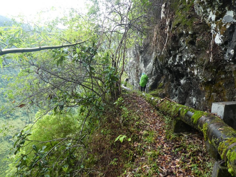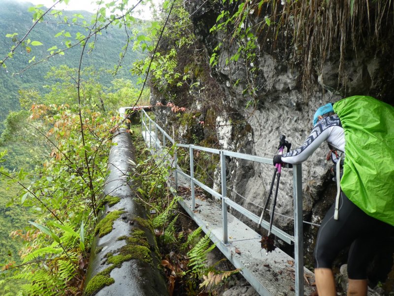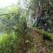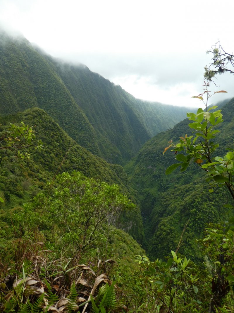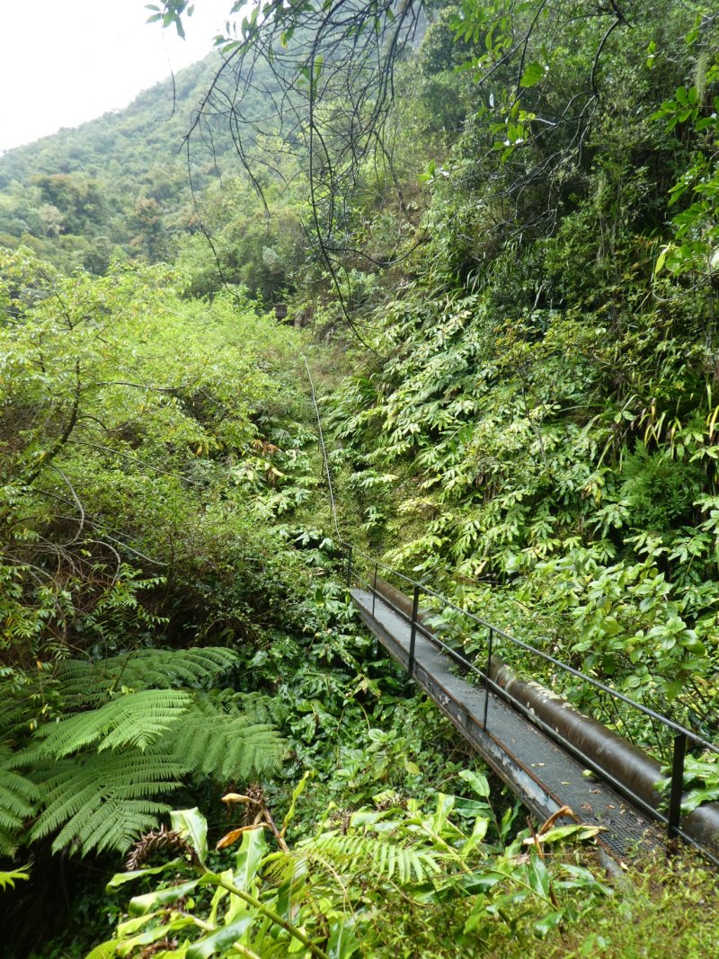 La randonnée débute à la route de Saint-Bernard où il est facile de stationner. Le sentier qui remonte à la Fenêtre est facile à suivre sur une montée régulière pouvant être glissante par endroits. Quelques marches facilitent la courte ascension (Photo 1). Il est sombre toute la journée tant les jamrosas poussent ici serrés les uns contre les autres (Photo 2). La montée est directe dès le départ et les muscles ne sont chauds. Des sentiers partent dans plusieurs directions vers le Domaine Telmard, le Colorado ou la RF de la Plaine d'Affouches par le sentier des Goyaviers. Un quatrième sentier débute près du rempart et file en direction de l'Îlet à Guillaume (Photo 3). Lorsqu'il n'y a pas d'éboulis (Photo 4), c'est une formalité que de descendre vers le Bras Guillaume. Le sentier qui longe la tuyauterie est toujours large (Photo 5), en faible pente et offre souvent de beaux points de vue sur la vallée sur la gauche. Le sentier longe constamment la tuyauterie (Photo 6). Comme tous les circuits longeant des canalisations il est en général assez plat (Photo 7). Lorsqu'elle plonge dans le vide, le sentier effectue un écart pour la rejoindre à nouveau un peu plus bas (Photo 8). La falaise est impressionnante mais quelques câbles aident aux passages délicats (Photo 10). La végétation diminue beaucoup les sensations de vertige. Elle n'est cependant pas suffisante à certains endroits pour les acrophobes confirmés (Photo 11). D'autres passages ont été carrément creusés dans la roche et sont parfois à l'origine de quelques chutes de pierres (Photo 12). La canalisation plonge à nouveau dans le ravin et le sentier effectue quelques lacets pour la retrouver (Photo 13). On parvient ainsi en moins d'une heure à la passerelle qu'il n'est plus recommandé d'utiliser pour le franchissement. Un sentier a été aménagé spécialement et ceux qui veulent emprunter la passerelle prennent leurs responsabilités. Pour cela, prendre le sentier qui descend à gauche avant la cuve, passer sous le tuyau blanc et longer l'ouvrage en pierre sèche qui soutient la passerelle. Suivre un sentier en lacets qui rejoint le Bras Guillaume (Photo 14). Remonter le Bras jusqu'à un petit bassin puis retrouver l'itinéraire officiel. Le sentier en rive droite du Bras Guillaume monte parfois très fortement et passe sous d'énormes eucalyptus au tronc spongieux (Photo 15). Plus loin, débutent les premiers vestiges d’occupation de la zone avec, ça et là, des murets en bordure de sentier (Photo 16). La liane papillon est de plus en plus présente et étouffe inexorablement les arbres endémiques ou créent des tunnels sombres (Photo 17). Une dernière montée plus rectiligne sous les eucalyptus amène à l'emplacement de l'ancien pénitencier dont il ne reste qu'une case vieillissante démontée jour après jour pour faire un peu de feu lors des bivouacs des marcheurs de passage. Profiter d'une halte pour contourner la case et s'approcher du rempart. Poursuivre par une piste bordée de cryptomerias qui se dirige vers l'ancien cimetière. Le sentier de la Roche Écrite part sur la gauche au cimetière et entame une longue montée de plusieurs heures vers le gîte de la Plaine des Chicots. Entamer la montée à l'ombre des gros camphriers (Photo 19). Une petite sente sur la gauche rejoint une grande cavité entourée de pierres sèches qui devait certainement servir de réserve d'eau. Des pierres taillées occupent encore le fond dont certaines en forme de boite aux lettres. Heureusement, le sentier est long, la pente forte ce qui a évité à ces vestiges de disparaitre ! Poursuivre, toujours en montée le long de la tuyauterie jusqu'au panneau indiquant la Roche Écrite. Partir sur la gauche et longer simplement le tuyau métallique sans chercher à s'éloigner de la canalisation (Photo 20). Les passages alternent larges parties plates herbeuses (Photo 23) ou étroits sentiers entre tuyau et roche. Franchir calmement les deux passages plus délicats (Photo 21) qui représentent moins de 30 mètres. Profiter de la vue en enfilade de toute la vallée de la Rivière Saint-Denis (Photo 22). Après quelques virages, on parvient à une source contenant sans doute un peu d'oxyde de fer colorant la roche (Photo 24) et l'on aperçoit déjà les installations construites à la fin du tunnel. Pour les rejoindre, passer deux petites passerelles (Photo 25) puis grimper un haut escalier bétonné. Une grille ferme l'accès au tunnel qui domine les ravines du Bras Citron. Ne rien rajouter aux lamentables vestiges de boissons et emballages de gâteaux jetés là puis repartir en sens inverse pour regagner le point de départ par le même itinéraire en profitant cette fois des panoramas sur l'Îlet à Guillaume (Photo 26). En arrivant au Bras Guillaume, les plus courageux ne craignant pas de mouiller les chaussures remonteront le torrent sur une bonne centaine de mètres en sautant de caillou en caillou, en pataugeant dans la rivière ou en escaladant les berges. Un bassin et sa cascade (Photo 27) rendent plus difficile et aléatoire une remontée plus en amont.