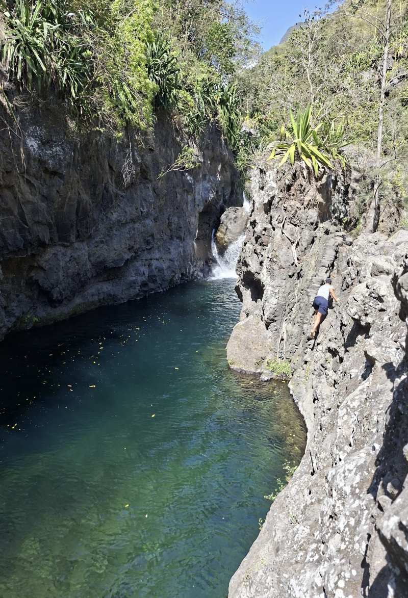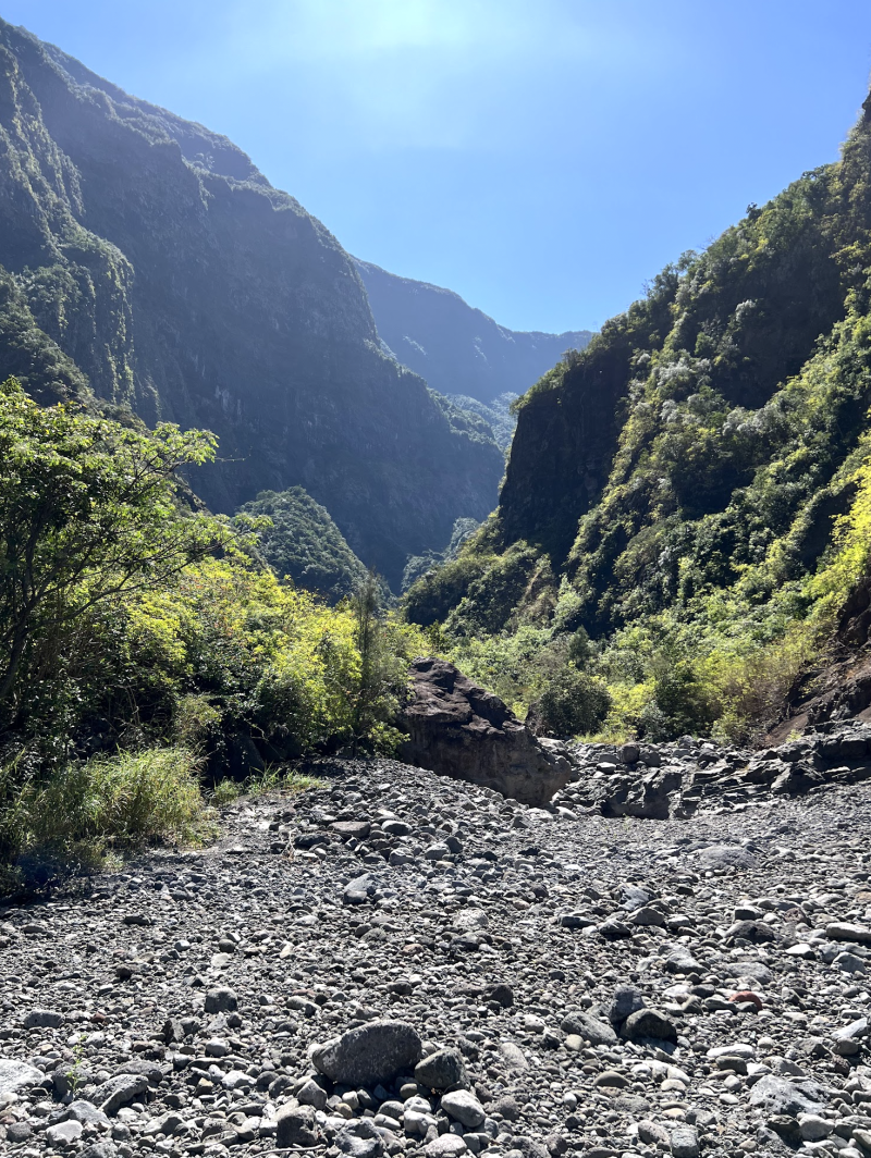 Parti sans la trace GPS, on loupe après la confluence bras des merles certains passages pour retrouver le sentier. Si on rate un caillou posé sur un rocher (ébauche de cairn) ou une flèche verte peinte sur les rochers patinée par le temps, on reste dans le lit à sec en cette saison sur certaines portions et l'allure est ralentie à escalader les rochers si on a loupé la sente. Si vous avez envie de ne croiser personne ou presque sur un sentier, c'est l'endroit rêvé. On a juste croisé les habitants de l'ilet qui recherchaient leurs deux chiens perdus depuis 48 h ... si jamais vous les voyez.... Pas le temps d'aller jusque là haut sachant notre heure de départ tardive et la remontée qui nous attendait sur dos d'ane à effectuer avec nos chiens (et le passage de la petite échelle à porter le berger et le cane corso sur le dos est physique après la balade et la remontée) donc on reviendra mais l'option 4x4 est la bonne je pense quand on ne connait pas le sentier et du coup avoir un risque de perdre du temps à chercher la sente si on a pour option de le faire en 1 jour. Donc à refaire pour aller au bout.