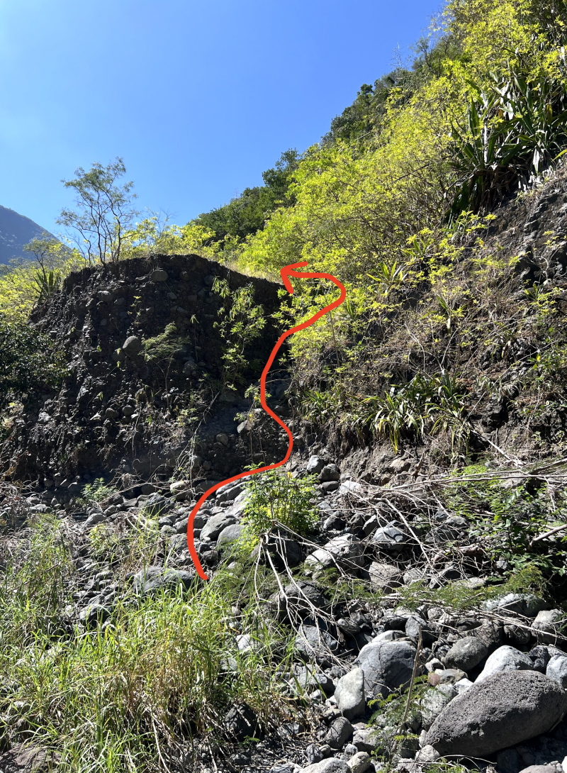 - Rester dans la ravine jusqu'au départ de sentier éboulé (ci-après).