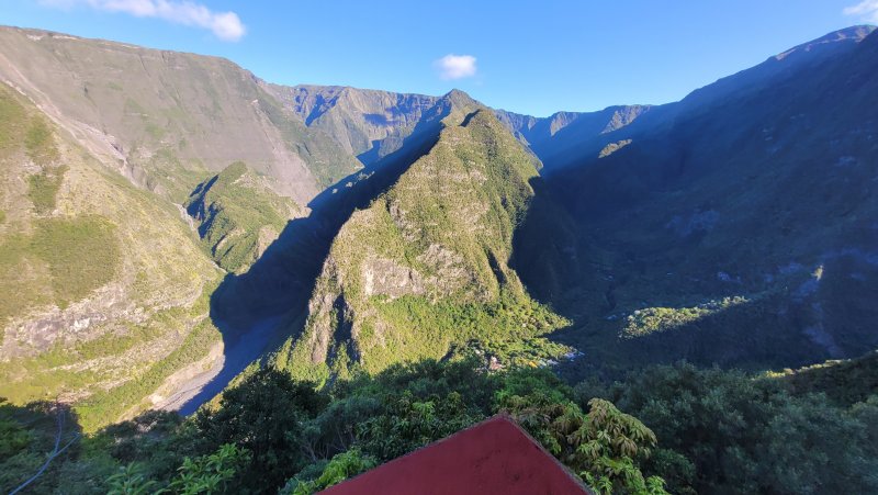La randonnée débute à deux pas de l'ancienne horloge à eau désormais remplacée par un monument à la mémoire d'Edgar Avril et du Captage. Un belvédère au-dessus du vide permet de contempler le village 700 m plus bas et d'apercevoir le bassin du Voile de la Mariée (Photo 1). Tout près, le téléphérique sert au ravitaillement et l'on peut voir la petite nacelle qui attend les marchandises. On pourra même visiter l'autre extrémité du câble une fois à Grand Bassin. Le sentier débute près du téléphérique et longe le rempart protégé du vide par la végétation. Goyaviers, bringeliers et lantanas constituent une grande part de la végétation empêchant de profiter du spectaculaire panorama. Après un petit kilomètre d'une marche facile, le sentier se met à plonger sans transition. Les marches en béton du début sont remplacées par celles en pierre, plus nombreuses et souvent très hautes. Cette descente qui semble ne jamais finir se poursuivra jusqu'au Bras Sec avec seulement une partie plate longeant une haute falaise basaltique (Photo 2). On passe près de l'oratoire dédié à Ste-Rita le long de cette falaise, après avoir franchi l'éboulis qui vaut au sentier d'être régulièrement fermé durant les longues remises en état. La descente se poursuit, sans grande difficulté hormis de hautes marches. Si elles paraissent faciles lors de la descente,au retour il en sera tout autrement (Photo 3). Les vues sur les différentes vallées sont de plus en plus belles au fur et à mesure que le soleil s'élève. On devine souvent le bassin et sa cascade sur la gauche du village qu'on domine encore pour longtemps. On rencontre à mi-parcours les nouvelles installations de transport d'eau. De récentes canalisations posées sur les anciennes laissent imaginer un vertigineux chantier. Cela ne rajoute rien à l’esthétique du lieu mais doit gagner en efficacité. De nombreuses passerelles et de hauts escaliers permettent de franchir les ouvrages sans danger de glissade sur les tuyaux humides. Une DZ domine les installations de pompage. Elle s'atteint facilement pour mieux profiter du paysage (Photo 4). A partir des dernières canalisations, la descente est plus facile et l'on aperçoit très bien la vallée du Bras Sec ou le rempart séparant de Cilaos vers le Rond des Chevrons (Photo 5). Les derniers hectomètres comportent encore de hautes marches sur un sol rocheux (Photo 6). La passerelle franchissant le Bras Sec marque la fin de la descente et le début de Grand Bassin (Photo 7). Un coup d'œil sur le chemin parcouru permet d'apprécier la pente et de deviner le belvédère du départ (Photo 8). On se retrouve vite dans ce petit village sans rues mais parcouru de larges sentiers bordés de murets en pierres sèches (Photo 9). Les gîtes rivalisent de beauté par les couleurs de leurs façades ou les jardins fleuris qui les bordent. De belles treilles de vigne créent de l'ombre pour le repos des randonneurs restés dans les gîtes (Photo 10). Au premier croisement de ces sentiers, prendre à gauche et descendre vers le Bras de Sainte-Suzanne qu'on entend depuis les habitations. La visite de la chapelle, en partant à droite, ne prend que 5 minutes (Photo 11). Dans la descente, repérer le petit sentier de gauche, non renseigné, menant en moins de 100 m aux installations du monte-charge pour de nouvelles vues en direction de Bois Court (Photo 12). Reprendre la descente jusqu'au gué, facile à franchir en sautant de roche en roche si le niveau de l'eau est assez faible. Une beauté de la nature constituée d'une cascade tombant dans un bassin surmonté d'une arche basaltique se visite à 150 m du gué sans se mouiller les pieds. Partir vers l'amont en cherchant le meilleur passage, principalement en rive gauche (Photo 13). Le torrent est toujours vif et ne se prête pas du tout à la baignade (Photo 14). Quand un bassin semble empêcher la remontée, repérer dans la falaise le sentier étroit qui grimpe assez fortement, passe près d'une échelle et se termine au pied du bassin (Photo 15). L'accès à la grotte s'effectue sur les basaltes lisses où les prises sont assez rares (Photo 16). Il faut donc prendre toutes ses précautions pour l'atteindre, renoncer si les roches sont mouillées et ne pas l'effectuer avec un enfant. Une fois atteint le haut de la grotte, le spectacle est au rendez-vous (Photo 17). L'eau de la petite cascade se jette dans un bassin profond entouré de grottes (Photo 18). Ne pas laisser de déchets en ce lieu magique. Reprendre la descente du cours d'eau en empruntant le même itinéraire et repartir sur la droite au gué en direction de la cascade. Les plus aventureux voudront tenter les quelques cordes permettant de rejoindre le Bras des Roches Noires. L'aventure est de courte durée mais peut s'avérer ludique en prenant garde cependant aux passages étroits en corniche ou aux pierres qui s'effritent et peuvent blesser "les premiers de cordée" (Photo 19). Le départ se situe 50 m avant le haut de la cascade. Grimper quelques mètres le long de la ravine caillouteuse à sec en visant la première corde, discrète, une dizaine de mètres en amont. Le sentier monte fortement jusqu'au balcon d'où l'on bénéficie de superbes vues sur le bassin et la vallée du Bras de La Plaine. Il traverse un sous-bois et longe ensuite le bras après les longues descentes encordées (Photo 20). Descendre dans le lit de la rivière, très large et couvert de galets pour se balader à l'envie (Photo 21). La remontée du Bras des Roches Noires nécessite une journée spéciale. Entamer la descente du bras en passant au pied de l'Îlet Cicielle désormais abandonné mais toujours en propriété privée. On aperçoit la canalisation des Hirondelles sur le rempart d'en face (Photo 22). Le Bras des Roches Noires est rarement à sec mais se traverse assez facilement sans se mouiller les pieds. On parvient très vite au confluent avec le Bras de La Plaine en sauta