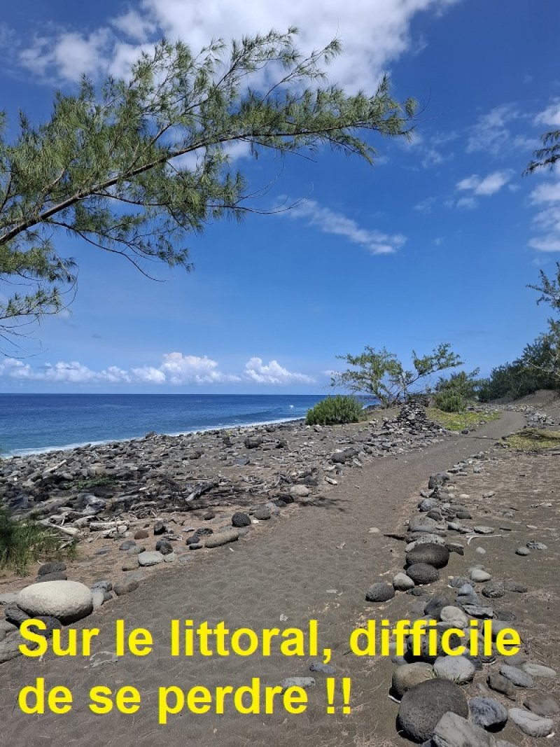 Voici une randonnée à réserver pour la période hivernale. Effectuée durant l'été austral par 32° à l'ombre, on marche au soleil avec des températures avoisinant les 40°C. Autant dire qu'il faut prévoir de l'eau car on ne pourra compter sur aucune cascade ou source pour s'alimenter. Le sol est constamment plat mais l'effort est soutenu car plus de la moitié de la boucle s'effectue sur, ou plutôt dans le sable très fin. Le pied s'enfonce allègrement et les chaussures se remplissent doucement. L'océan est toujours proche et si on ne le voit pas, on entend toujours rouler les galets. Ce bruit permet d'expliquer facilement à des enfants comment la mer arrive à créer un galet rond en quelques semaines. Inutile de tenter d'éviter ces zones sableuses car toute la région, de Saint-Louis jusqu'à l'Etang Salé est constituée de hauteurs parfois impressionnantes de ce sable gris, très instable. Les arbres, principalement des filaos et des épineux ont envahi les dunes et les maintiennent en place. Ne pas manquer les tâches d'eau au sol au petit matin (grand matin à la Réunion). Les filaos, qui ont profité de la fraîcheur de la nuit et des embruns venant de la mer, se sont recouverts d'une fine pellicule d'eau qui coule aux premiers rayons. Aucune crainte de s'égarer car la boucle est située entre la RN2 et les vagues. Des dizaines de sentiers partant dans tous les sens permettent de se créer une randonnée à la carte. La fiche propose de rallier l'Etang Salé en marchant au plus près de la mer et de revenir en suivant la voie rapide. On rencontre, tout au long du parcours, des étendues importantes de bois flottés, des sculptures mêlées aux ordures parfois ramassées et entreposées, un champ de cairns, des bassins et des ports naturels où viennent se briser les vagues. La balade dans le village permet de s'approcher de l'étang puis d'emprunter un circuit qui revient vers la route en traversant le Domaine de la Roche Carangue. En cas de fatigue il est possible d'effectuer un long parcours sur la piste cyclable mais le goudron surchauffé a vite fait de décourager et incite à prendre les sentiers un peu plus ombragés.