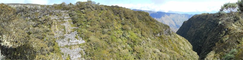 La randonnée débute à la toute fin de la route du Brûlé. Un grand kiosque très bien aménagé attend les pique-niqueurs du dimanche avec un foyer où l'on peut allègrement rôtir un mouton. Le sentier débute sur les racines de cryptomerias et emprunte un tracé bordé de planches pour traverser sous le couvert des conifères (Photo 1). Cent mètres plus haut débute le parc national indiqué par son poteau en bois. Tout près un grand panneau attire l'attention du randonneur sur le domaine du tuit-tuit, un oiseau endémique dont la population est parmi la plus faible au monde. Attention pour les non résidents car le point "Vous êtes ici" situe le départ à 5200 mètres à vol de tuit-tuit du point réel (Photo 2). Le sentier, toujours bien entretenu, montera constamment jusqu'à la Roche Ecrite avec seulement une demi douzaine de faux-plats de moins de 100 m. L'effort est donc à fournir durant les trois premières heures, sans échauffement depuis le parking. Jusqu'au gîte, on rencontre tous les types de végétation allant des branles, sabres et fougères du départ aux forêts de calumets, bois de tamarins et de bois de couleurs plus en hauteur. Le sol est tantôt terreux et glissant par temps humide, tantôt envahi de racines ou de boue sur de courtes distances. Les portions marécageuses se franchissent sur des planchers plus ou moins sophistiqués isolant de la gadoue (Photo 4). Des trouées sur la droite permettent parfois de voir la vallée de quelques Bras Sec ou Grand Bras ou de vastes clairières exploitées par l'ONF pour en débarrasser les bois morts (Photo 3). Plus on monte et plus les tamarins des Hauts sont nombreux (Photo 7). On parvient au gîte en moins de deux heures de marche (Photo 8). L'endroit est calme et reposant et sa position à près de 1900 m d'altitude procure de la fraîcheur. Si tous les autres sentiers de la forêt n'ont pas été repérés en montant, débute alors une exploration de la planèze dominant le gîte. Partir vers la gauche en suivant le petit panneau "Bâtiment Bois de Nèfles, 100 m". On passe près de la station météo, d'une réserve d'eau, d'une zone de posé des hélicoptères de secours avant de tourner à angle droit sur un large sentier herbeux pour une progression facile vers le sud (Photo 9). 500 mètres plus loin, partir sur la droite pour 20 mètres de zone dégagée et emprunter le sentier officiel de la Roche Ecrite. La première partie s'effectue sur un terrain terreux parsemé de petits cailloux (Photo 12) ou sur des planches pour les portions humides (Photo 11). Plus haut, on retrouve les larges plaques de lave où la marche est très facile. Les repères de peinture blanche sont si nombreux qu'il est impossible de s'égarer même avec un fort brouillard. On ne décrit plus les paysages sur les deux cirques quand les nuages ne sont pas trop installés (Photo 13). Une fois lues toutes les inscriptions présentant un intérêt littéraire, c'est à dire 5 secondes plus tard, reprendre le chemin inverse jusqu'au premier croisement. Poursuivre tout droit sur les plaques de lave et à travers les brandes réussissant à pousser jusqu'à la Caverne Soldats. Cette vaste cavité peut abriter plusieurs personnes en cas de forte pluie (Photo 14). Il arrive parfois qu'une petite chute d'eau coule de son toit pour la douche du soir en cas de bivouac ! Cette chute modeste est l'une des nombreuses sources de la Rivière des Pluies dont on aperçoit la vallée en repartant sur le sentier vers le gîte. Il est beaucoup plus étroit que celui de la descente et mérite de l'attention (Photo 15). Plus loin, laisser sur la droite le sentier menant à la Bretagne puis obliquer à gauche sur les larges plaques menant à la Mare aux Cerfs (Photo 16). Repérer dans la boue les traces de sabots des cervidés venant boire paisiblement si on ne leur tire pas dessus. La mare est minuscule au milieu des joncs et ses abords marécageux sont couverts de sphaignes (Photo 17). Un petit sentier part sur la droite vers un point de vue sur Mafate (Photo 18). Cet aller-retour ne prend que 5 minutes. Reprendre ensuite la descente vers la Caverne Dufour sur un sentier en pente assez forte à travers les branles (Photo 19). Profiter de la hauteur pour repérer les Pitons Plats qui dépassent à peine de la Plaine des Chicots. Après la traversée de larges prairies entourées de branles, on s'approche de la Caverne et de sa petite mare situées à la jonction des sentiers (Photo 20). La caverne est aussi vaste que la précédente mais elle est moins accueillante en raison de la hauteur de son plafond. On retrouve les plaques de lave usées par les semelles (Photo 21) jusqu'à un petit marécage à sec traversé par le sentier en planches. Chercher à ce moment le nouveau petit sentier qui file vers le rempart du Bras Détour dont on aperçoit la haute cascade à sec (Photo 22). Moins de 300 m plus loin, dans une clairière coupée en deux par une rigole profonde, essayer de trouver le début du sentier qui reliait celui de Dos d'Ane (Photo 23). Il a beaucoup souffert des cyclones et les arbres abattus empêchent de suivre sereinement son tracé. En revanche, les 100 premiers mètres sont aisés à suivre (Photo 24). Traverser une profonde ravine rocheuse et profiter d'un nouveau point de vue sur le Bras Détour et la Crête d'Aurère (Photo 25). L'endroit est prisé des cerfs comme le prouve les nombreuses fumées laissées au sol. Rebrousser encore chemin et reprendre la direction du gîte. Aux premières habitations, s'il n'est pas encore l'heure de revenir vers Mamode Camp, oser un détour de 500 m en partant sur la gauche vers Dos d'Ane. On frôle la Caverne Basse, modernisée en son temps par un mur mais qui décourage désormais tout candidat à un bivouac (Photo 26). Le sentier est très agréable dans les bois de couleurs et les tamarins au sol (Photo 27). Le sentier menant au point de vue est beaucoup plus étroit et permet d'admirer pour l