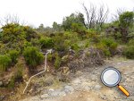 La deuxième partie, plus sportive et plus compliquée pour la remontée vers le Grand Bord, emprunte la PF des 1800 vers la droite pour une nouvelle séance de repos. Elle est large, sèche, caillouteuse, bordée de beaucoup d'ajoncs d'Europe, de fougères et de carcasses d'arbres calcinés (Photo 14). Après avoir franchi une demi-douzaine de ravines, guetter particulièrement la Ravine Saint-Gilles, insignifiante à cette altitude mais très importante comme repère. C'est à moins de 10 mètres de la traversée que débute l'ancien sentier matérialisé par une très discrète flèche blanche peinte au sol (voir § ci-dessous). Le GPS est recommandé pour éviter de perdre la trace des pointillés de la carte IGN dont on ne s'éloigne jamais de plus de 10 mètres sur le terrain en raison de certains obstacles créés par les incendies. Des rubalises très rares au départ, des traces de peinture qui diminuent également dans la montée ou de rares cairns viennent régulièrement rassurer sur la direction empruntée. Garder en mémoire qu'on longe la rive gauche de la Ravine Saint-Gilles sur les trois quarts de la montée. Le sentier est fréquemment présent (Photo 15) puis disparaît pour quelques mètres avant de resurgir entre des fougères, des branles verts (Photo 16) ou des bois calcinés qui laissent des traces noires sur les vêtements (Photo 17). A mi-parcours, on remarque un cratère qui dépasse de la planèze (Photo 20). Il ne s'agit pas du Piton de la Ravine Saint-Gilles marqué sur les cartes sur le bord du rempart de Mafate. Il faut d'abord partir à gauche, traverser la Ravine Saint-Gilles, le rejoindre et le grimper par la gauche en rejoignant tout d'abord un gros bloc de basalte érodé (Photo 21). Près du bloc, un cairn indique l'ancien passage mais il est assez difficile à discerner en raison des fougères qui l'obstruent. Ne pas hésiter à franchir ces dix mètres qui griffent un peu pour parvenir au sommet d'un plateau bien dégagé. De la lèvre du cratère on a de belles vues sur le fond infranchissable. La fin de la montée s'effectue toujours au plus près de la ravine, dans le fond même ou dans les petits branles verts qui la bordent. On se retrouve enfin, après 80 minutes de montée sportive, sur le sentier de la Glacière bordé à cet endroit de nombreuses clairières invitant au bivouac (Photo 23). Pas de conseil particulier pour se rendre au Piton Bernica. Les sentiers et pistes, très nombreux et maintes fois décrits, partent tous vers le Maïdo. La reconnaissance effectuée a suivi le sentier de bord du Piton de la Ravine Saint-Gilles jusqu'au point 2263 pour obliquer à gauche vers l'Observatoire de l'Air. Après une très courte portion de béton, partir à gauche vers le Piton Bernica reconnaissable à son mirador que l'on n'a guère quitté des yeux depuis le départ de la boucle. Un sentier débute au pied du mirador et plonge rapidement vers la route du Maïdo. Il est étroit, en bon état mais rendu difficile par la quantité de pierres qui l'encombrent (Photo 25). Ne pas emprunter la route mais partir légèrement sur la gauche et suivre longuement une piste couverte de laves aux couleurs chaudes parcourue par les cyclistes et les randonneurs (Photos 26 et 27). Cette piste en descente constante se termine à la PF des 1800 qu'on emprunte sur une courte distance en partant vers la droite. Très vite, la PF Bolon se présente sur la gauche, très proche d'un sentier de vététistes. Ce sentier est très agréable entre de beaux tamarins (Photo 28). Le quitter au premier croisement et emprunter la piste Bolon qui effectue plusieurs virages également en descente constante vers la RF des Tamarins et le parking laissé au départ.