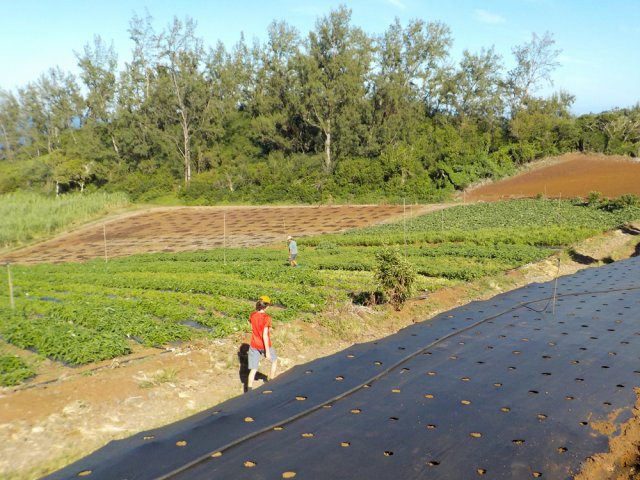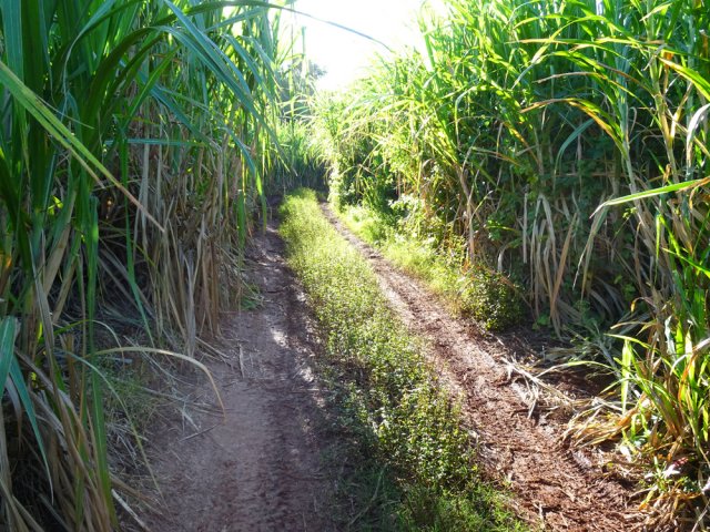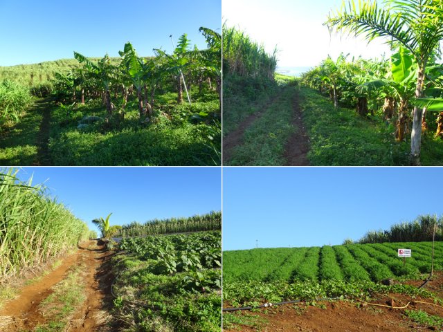 Randonnée familiale : Marcher vers Saint-Joseph jusqu'à la première piste partant sur la droite. On traverse tout d'abord quelques champs offrant de beaux points de vue sur l'océan (Photo 1). Après les maraîchages, on se retrouve à marcher le long des champs de canne et d'une petite forêt de filaos (Photo 2). Plus loin, ce sera le long de la profonde saignée de la Ravine de Petite Île. On aperçoit parfois quelques roches de la Petite île qui dépassent des filaos et, sur la droite, le Cap Auguste et le Piton de Grande Anse qui avancent dans la mer. La piste descend plus fortement pour parvenir à un endroit un peu plus large. Il faut partir sur la droite et marcher quelques mètres sous les filaos pour arriver au point de vue principal d'où l'on a un large panorama qui englobe tout le rocher (Photo 3). Il est possible après cette pause de revenir par le même chemin mais pourquoi ne pas partir de l'autre côté pour profiter de la nature sur une pente beaucoup plus faible entre poivriers et beaucoup de canne à sucre (Photo 26). Peu d'ombre durant cette remontée même lorsque la canne est haute ou lors de la traversée des fourrés de poivriers (Photo 27). Les pistes sont variées, usées par les pneus ou envahis par les plantes qui seront arrachées en période de coupe. Les 500 derniers mètres s'effectuent en montée régulière en longeant une grande bananeraie et se terminent au niveau de grands maraichages (Photo 28).