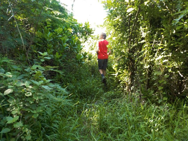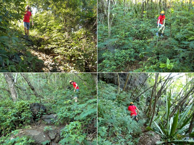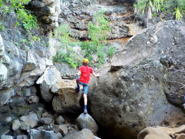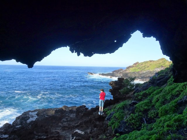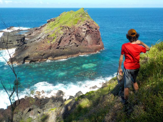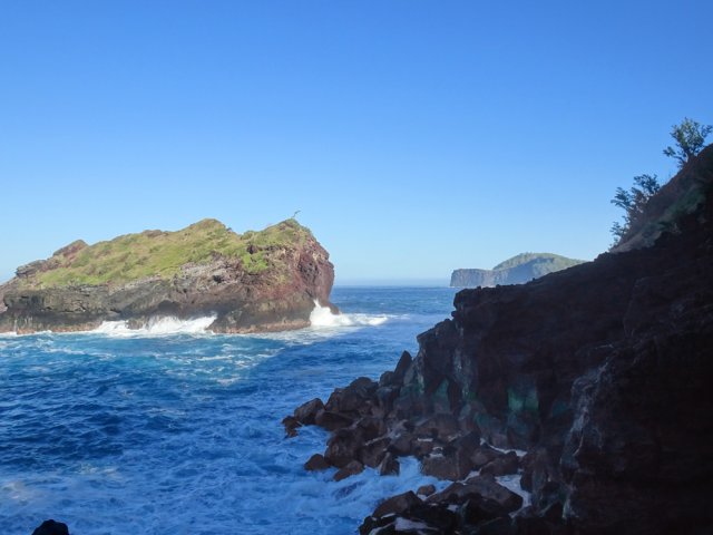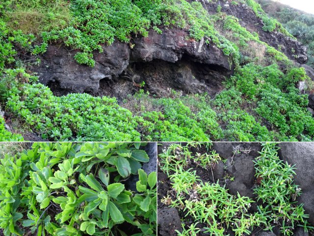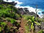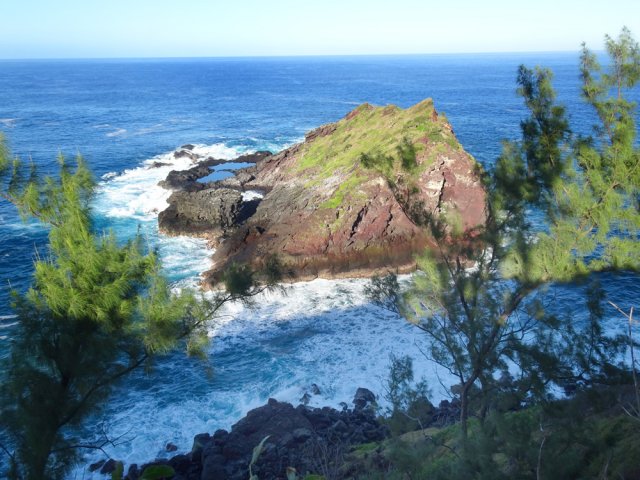 Randonnée sportive et plus aventureuse : Le point de départ se situe dans la descente avant un virage à gauche de la piste. La trouée, souvent à demi-bouchée par les herbes, est tout de même facile à trouver (Photo 4). Le sentier descend dans le bois puis plonge littéralement vers la mer pour une descente de 100 m. Il faut prendre son temps pour éviter branches, racines et pierres en travers (Photo 5). Le sentier se termine au gros filao et aux énormes rochers du littoral. Avant de partir vers les points de vue, il est possible de visiter la Ravine de Petite Île. Descendre les gros rochers en profitant des points de vue sur le Cap à Noël et le Piton de Grande Anse (Photo 6). La remontée de la ravine impose quelques petites escalades entre les énormes blocs (Photo 7). Le premier cassé rencontré se franchit aisément en choisissant les bonnes marches en basalte (Photo 8). Le second, moins haut, semble cependant difficile à passer (Photo 9G). Escalader les rochers en rive droite sous les arbres en prenant garde à la glissade. On parvient très vite à un 3ème cassé, très haut et moussu où du matériel est indispensable pour poursuivre vers l'amont (Photo 9D). Faire demi-tour et revenir au gros filao. Laisser le sentier pris en descente et partir à droite le long de la falaise verticale par endroits (Photo 10). On bénéficie alors des vues sur la façade ouest de l'îlot (Photo 11). Le plus dangereux à cet endroit est de glisser sur les déchets laissés par les pêcheurs ou de se prendre le pied dans les fils nylon coincés entre les roches ! Trouver le sentier qui remonte le long du rempart à partir d'un autre filao (Photo 11). Après une forte montée, on peut repartir à droite pour se rapprocher du bord. Plusieurs sentiers se rejoignent et peuvent prêter à confusion (Photo 13). L'un d'entre eux redescend de nouveau assez fortement en direction de la mer. Il n'y a pas d'arbuste pour se retenir et le cheminement doit s'effectuer prudemment (Photo 14). On se retrouve au point de vue sur la face nord (Photo 15). Avec prudence, il est possible de faire comme les pêcheurs et de se rapprocher du bord si les vagues ne sont pas trop fortes (Photo 16). Si les roches ne sont trop glissantes, chercher les différentes espèces de crabes, les oursins tortue ou les blennies sautant au moment où les vagues arrivent (Photo 17). En revenant et en prenant un autre sentier pour remonter, on est aidé par une longue corde qui facilite l'ascension (Photo 18). Quelques minutes plus tard, on passe au belvédère décrit au §1. Un sentier se remarque dans le bois. Même peu entretenue, on distingue très bien la trace nettoyée régulièrement par les pêcheurs (Photo 19). Seules les feuilles de pandanus peuvent griffer au passage. Repérer le croisement de trois petits sentiers discrets. Partir à droite pour se retrouver à nouveau face à une forte descente étroite souvent en corniche (Photo 20). Comme on s'est éloigné un peu, l'île paraît plus petite et montre sa face est (Photo 21). L'étroit sentier glissant passe près d'un rocher déchiqueté caractéristique doté d'une superbe cheminée gazeuse circulaire (Photo 22). Là également, si la mer est calme, on peut s'approcher du bord à la recherche de bassins et de la faune littorale. On traverse ainsi de magnifiques rochers usés par l'érosion, le vent et les vagues (Photo 23). On remarque une grotte dans la falaise entourée de verdure. Les saliettes (Psiadia retusa) et lavangères (Delosperma napiforme), toutes deux endémiques, semblent en protéger l'entrée (Photo 24). En prenant garde de ne piétiner aucune plante, on peut se rapprocher de la cavité pour un dernier point de vue original (Photo 25). Une trace discrète remonte à partir de la grotte mais il vaut mieux revenir sur ses pas, soit jusqu'au belvédère, soit en partant à droite au croisement aperçu en descente. Dans ce cas, après une nouvelle montée, on finira le long du champ de canne à sucre. Voir le §1 pour le retour au parking.