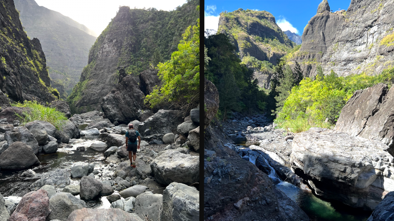 La randonnée débute au grand parking des hélicoptères de Deux Bras. La meilleure façon de s'y rendre est de prendre le 4x4 à la Rivière des Galets car la journée sera assez sportive sans y rajouter la jonction à pied, même venant de Dos d'Ane. Le sentier, large et de bonne qualité longe la rivière ou la traverse par des gués très bien aménagés de grosses pierres (Photo 1). On parvient rapidement et facilement à la Porte après avoir franchi une demi-douzaine de ces gués. A la Porte, reconnaissable à l'ouvrage béton situé dans la falaise en rive gauche, délaisser le sentier longeant la rivière et obliquer à gauche pour entamer une forte montée caillouteuse ou sur des marches en pierre (Photo 2). Le sentier s'assagit sur le haut des falaises longeant la rivière (Photo 3) avant de repartir en montée. Poursuivre vers la Passerelle du Bras d'Oussy par quelques dents de scie permettant d'échauffer les muscles. On laisse un premier embranchement vers Bord Bazar, puis un deuxième à l'approche de la passerelle qu'on distingue déjà, tout comme le barrage sur la Rivière des Galets (Photo 4). Ne pas manquer, avant de descendre vers le torrent, de rejoindre la passerelle pour admirer les bassins 50 mètres plus bas ou, mieux, la vallée vers l'amont que l'on remontera durant plus de trois heures avant de faire demi-tour (Photo 5). Pour trouver le sentier qui va littéralement plonger vers les bassins, faire demi-tour vers Deux Bras et repérer une fenêtre sur la gauche donnant un beau point de vue sur l'aval de la Rivière des Galets. En face, entre arbustes et chocas, on devine une trace à peine visible (Photo 6). S'engager sans hésiter, d'autant qu'il y a peu d'autres possibilités pour cette descente très abrupte. Après avoir rejoint un pied de jamblon, vert et un arbre couché par le vent, entamer la descente sur un sentier assez facile à suivre des yeux mais beaucoup plus délicat pour la marche. La pente, comme on a pu le voir de la passerelle, est très forte et le corps a tendance à être attiré vers le bas. Les pieds du marcheur sont souvent à la hauteur de la tête de celui qui précède (Photo 7). Les arbres sont très utiles pour freiner la descente qui s'effectue cependant sans danger. On se retrouve au bas du canyon vu depuis l'ouvrage qui domine et sur lequel on aperçoit des randonneurs nous observer dans cette vallée verdoyante. Le canyon est de toute beauté avec de petits bassins reliés par des toboggans (Photo 8). Il est également impressionnant de par son étroitesse (Photo 9). A partir de ce canyon, les explications deviennent inutiles car elles peuvent changer en fonction de la saison, de l'état de la végétation ou des préférences de marche de chacun. Une bonne partie, au départ, s'effectue en rive droite où l'on retrouve quelques traces de passages. Quand on se retrouve face à des murs infranchissables de végétation ou de roches, traverser simplement la rivière pour trouver en face un meilleur passage (Photo 10). Dès que possible, privilégier les rives pour gagner en vitesse (Photo 11). La marche est fatigante mais les paysages verdoyants et aquatiques sont le plus souvent agréables (Photo 12). Prendre garde aux roches et galets mouillés qui sont souvent glissants (Photo 13). Le minéral l'emporte parfois sur le végétal et l'on rencontre de plus en plus d'énormes rochers et des bassins profonds qu'il faut éviter (Photo 14). C'est sur la roche de la rive qu'il faut alors trouver son chemin (Photo 15). La pente est de plus en plus forte et le torrent tombe souvent en toboggans qui pourraient être ludiques si l'on disposait de suffisamment de temps (Photo 16). La vallée n'est jamais large et ne comporte pas de canyon (Photo 17). On rencontre de plus en plus de jolies petites chutes (Photo 18). Lorsqu'il fait chaud, les bassins offrent une agréable récréation qui rafraîchira le randonneur (Photo 19). Outre ces chutes, on rencontre un peu partout des curiosités qui méritent quelques secondes d'attention comme des grottes connues sans doute des braconniers, des roches colorées ou incrustées de quartz blanc, des coulées de laves ou plissements de laves dans les falaises, etc. (Photo 20). La dernière partie comporte de plus en plus de rochers qui demandent parfois quelques acrobaties pour les franchir (Photo 21). Il faut toujours rester attentif car la chute pourrait s'avérer très douloureuse. On marche sur les roches, entre elles si elles sont assez espacées ou même dessous quand il est impossible de faire autrement (Photo 22). Ces centaines de marches de plus d'un mètre ont tôt fait de rajouter du dénivelé à la remontée (Photo 23). Plus haut, le sol au pied de la falaise est assez facile mais il faut aussi se méfier des pierres qui viendraient à tomber (Photo 25). Pour avoir assisté à un petit éboulis durant la randonnée, éviter de stationner au pied des falaises. On arrive après trois bonnes heures d'effort à l'approche du Grand Benjoin près duquel est implanté l'Îlet à Bourse (Photo 26). La dernière centaine de mètres s'effectue assez facilement (Photo 27). Le Bras Bémale, un autre torrent du cirque, arrive du nord-est et termine sa course dans le Bras d'Oussy, annonçant la fin de cette remontée. Le niveau d'eau diminue, le sol est couvert de glaise glissante et humide (Photo 28). Le reste de la remontée sera sans doute possible dans les mois qui suivront un cyclone, mais pour le moment ce sont à nouveau les filaos et les cannes fourragères qui bouchent le passage. La pente s'intensifie et il vaut mieux faire demi-tour. Le trajet du retour s'effectue près de deux fois plus vite, d'autant plus qu'il est en descente. Une fois sous la passerelle, attaquer la courte montée extrêmement glissante et regagner le sentier officiel pour un retour au 4x4 en véritable balade d'agrément.