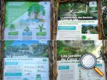 La randonnée débute à deux pas du Chemin du Bœuf Mort par une allée paysagère rejoignant un jardin d'enfant et une aire plantée de grands banians (Photo 1). Ce départ symbolique rallonge à peine par rapport à celui, plus classique, du sentier de la Kalla mais il permet de connaître une initiative intéressante sur ce que pourrait devenir l'habitat de demain (voir § ci-dessous). Les arbres sont moins hauts et larges que ceux du Rond Point de la Glacière à quelques kilomètres de là, mais ils en imposent tout de même par leurs longues racines tombant au sol (Photo 2). Partir à droite en arrivant au MailUn mail est une allée ou une promenade bordée d'arbres dans certaines villes Tropical qui traversera in fine l'ensemble des habitations, toutes déjà très bien intégrées dans la végétation (Photo 3). La verdure et les fleurs l'emportent souvent sur le béton (Photo 5). Le mail se termine au Chemin du Bœuf Mort. Le remonter sur une courte distance et emprunter la première route à gauche puis la première à droite pour traverser le lotissement de la Grande Montagne, une zone résidentielle de qualité comportant de belles demeures dans un cadre également très verdoyant. Le sentier de la Kalla débute à la fin du lotissement en remontant un peu à travers les derniers travaux de voirie. Le départ est large et caillouteux mais le cheminement facile (Photo 6). La pente est faible et l'on s'élève graduellement dans cette forêt pauvre des bas. Les trouées permettent quelques points de vue sur La Possession, Saint-Paul ou Le Port (Photo 7). 600 m après le début de la piste, délaisser le raccourci qui débute en sautant une minuscule ravine et filer sur la gauche pour s'approcher du château d'eau situé au bout d'un long lacet. De là, on profite de beaux panoramas sur la vallée de la Grande Ravine des Lataniers et du village. Le sentier monte de plus en plus, devient très pierreux par endroits. Plus haut, il comporte de longues portions pavées qui commencent à être envahies de chocas (Photo 8). Le sentier est parfois étroit mais le nombre important de passages l'empêche de se boucher complètement (Photo 9). Il zigzague dans la forêt, le plus souvent en montée sans panoramas (Photo 10). On parvient à un croisement de sentiers, l'un vers la Kalla, l'autre en direction du Joncourt et le troisième part à angle droit sur la gauche. L'emprunter et slalomer entre les chocas et les nombreuses pierres pendant 5 minutes pour rejoindre le rempart (Photo 11). De grosses roches marquent le bord du rempart pour un beau point de vue sur la Grande Ravine des Lataniers. Sur la gauche de l'amoncellement de roches, se devine un départ de sentier assez discret dans la végétation (Photo 12). C'est là que débute le sentier historique permettant de rejoindre le village au pied du versant. Le ton est très vite donné avec les blocs qu'il faut enjamber et la forte pente facilement imaginable en regardant le profil ci-dessous (Photo 13). Le sentier est bien marqué, que ce soit dans ses parties minérales comme dans les portions végétales (Photo 14). Quelques rares replats permettent de profiter des points de vue sur la vallée verdoyante et de reposer les jambes mises à rude épreuve (Photo 15). La pente ne faiblit pas, les roches ne diminuent pas non plus et doivent parfois se passer avec le maximum d'attention en se cramponnant souvent aux longues feuilles de chocas (Photo 16). Des vestiges de passages aménagés demandent également de l'attention car le bois a vieilli mais des cordes fixées à la roche rassurent (Photo 17). Plusieurs passages se font sur les fesses, par sécurité, afin de ne pas dévaler trop vite la pente (Photo 18). Le bruit des coqs et des chiens devient grandissant, cependant, il reste encore quelques obstacles à franchir à l'aide de nouvelles cordes salutaires (Photo 19). Le sentier est toujours aussi bien marqué (Photo 20). Il ne peut pas se perdre des yeux et les traces de peinture violette sont de plus en plus nombreuses jusqu'au village. Certaines roches glissantes viennent encore ralentir la descente (Photo 21). Plus bas, la végétation comportant beaucoup d'acacias et de poivriers est plus haute qu'au sommet (Photo 22). Plus on descend et plus les rochers sont gros (Photo 23). On les retrouvera d'ailleurs dans les cours et jardins entourant les cases construites à même les énormes éboulis. Un grand panneau demandant d'arrêter de jeter des ordures sur le sentier marque la fin de la descente après 45 minutes à toujours chercher la meilleure prise (Photo 24). La route bétonnée repart vers la droite en direction du fond de la vallée encore habitée sur un kilomètre. Prendre à gauche et poursuivre la descente sur le béton parfois glissant s'il est recouvert de mousse. L'école abandonnée est recouverte de longues lianes et le mur d'enceinte sert sans doute de tableau blanc à certaines personnes venues ici inscrire leurs insultes. (Photo 25). Les randonneurs n'appréciant guère les portions bétonnées ou goudronnées reporteront leur attention sur les constructions de cases sur des amoncellements de roches. On se doit d'avoir la forme ici pour grimper les escaliers menant à la porte d'entrée ! Des cases originales permettent même d'agréables rencontres avec des gramounes aimant discuter (Photo 26). Plus on marche vers La Possession et plus l'habitat évolue pour passer de la case modeste à la maison chic entourée de verdure. La route bétonnée traverse d'immenses vergers de manguiers n'ayant rien à envier aux plantations du verger Rosthon  (Photo 27). Le dernier kilomètre s'effectue en zone plus urbanisée et le regard porte sur la vallée où l'on vient de randonner (Photo 28). La pente du sentier du rempart paraît même facile vue d'ici. Les grues et immeubles en construction annoncent le Mail Tropical qu'on emprunte en partant sur la gauche. Déjà très fleuri, espérons qu'il restera intact avec le