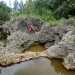 La randonnée débute à la passerelle du Chemin de Pétréas qui permet le franchissement à pied de la rivière en cas de crue. Près du gué, on retrouve le sentier des Petits Tamponnais Ruraux, association disparue en même temps que le sentier, excepté le tronçon décrit ici. Débuter sur cet agréable sentier comportant peu de fortes montées (Photo 1). Une première arche est présente dans le fond de la rivière mais elle est difficilement accessible. Un hors sentier est nécessaire pour s'en approcher entre les arbres et longoses (Photo 2). Petite acrobatie pour s'approcher de l'eau et trouver l'arche au-dessus de son bassin (Photo 3). Remonter un peu la rivière sur les roches de la rive droite puis traverser une belle étendue de renouées du chinois dépassant la hauteur d'un homme par endroits. Ne pas manquer une nouvelle arche sur la gauche (Photo 4). On peut passer dessous pour rejoindre une grande grotte en rive droite. Les bassins se succèdent, imposant quelques courtes escalades sans danger (Photo 5). Cette remontée de rivière amène à un énorme bassin que l'on peut visiter s'il est à sec. Descendre et remonter, également par l'escalade de quelques roches lisses (Photo 6). 5 minutes plus tard, on rencontre un autre endroit, magnifique, très sauvage, destiné aux amateurs de photos de nature (Photo 7). Cet ensemble de bassin-grotte-falaise est un des plus beaux endroits de la boucle. Comme la remontée est rendue impossible sans matériel, faire demi-tour mais délaisser le fond de la ravine pour chercher un passage dans la falaise en rive droite. L'échappatoire se situe derrière un arbre qui aide à l'escalade (Photo 8). Une fois l'étroit passage franchi, remonter en direction du champ de canne à sucre en traversant facilement le bois (Photo 9). Suivre les cannes jusqu'au sentier. Avant de poursuivre vers l'amont, rejoindre le gué et entamer une descente de la rivière en rive gauche pour rejoindre le dernier bassin délaissé il y a quelques minutes. Là aussi, sans danger, descendre vers les bassins dans lesquels il est déconseillé de se baigner (Photo 10). Deux d'entre eux sont séparés par une troisième arche basaltique qui ne se voit pas si le bassin est trop rempli (Photo 11). Remonter au gué puis entamer la suite en empruntant le sentier très fréquenté des marcheurs et coureurs. On y rencontre une racine d'une quinzaine de mètres assez caractéristique (Photo 12). Marcher sous les énormes camphriers bordant le sentier (Photo 13). Le Bassin Samuel se remarque sur la droite mais il n'est pas facile de s'y rendre sans se griffer. Plus loin, repérer le sentier plus discret obliquant sur la droite en direction du Bassin Michel (Photo 14). Le plus souvent à sec, il demande un peu d'attention pour atteindre le fond. Les minuscules marches de basalte facilitent la descente (Photo 15). Lorsque le bassin est plein, c'est une autre affaire que de remonter la rivière (voir ci-dessous la vignette 1 de la photo du § après les pluies). De l'autre côté, l'escalade est identique et facile (Photo 16). Le bassin, un peu envahi de plantes est suivi d'un très long toboggan creusé d'une profonde marmite d'où il serait impossible de sortir sans aide en cas de chute (Photo 17). Plus haut, c'est un gruyère de basalte qui doit être très impressionnant lors de crues importantes. Il se traverse par quelques escalades sans grand danger (Photo 18). Une ferme en rive gauche se repère avec les cris, aboiements, meuglements, cacabements de pintades et odeurs de lisier ! Les pigeons s'envolent par dizaines des anfractuosités où ils viennent pondre. On domine plusieurs bassins plus ou moins importants. Celui situé le plus en amont est alimenté par un petit pisse en l'air après la pluie. On remarque vers l'aval une arche discrète mais qui semble pourtant imposante. Pour s'en approcher au plus près, rejoindre le sentier et marcher vers l'aval jusqu'aux belles racines moussues. Descendre vers le lit puis remonter sur l'îlot basaltique créé par deux bras de la rivière en s'aidant ou non d'une sangle (Photo 19). En remontant l'îlot, on parvient au-dessus de l'arche. Il vaut mieux éviter de monter sur l'arche ou alors le faire prudemment (Photo 20). Cinq mètres d'une corde passée autour d'un arbre peuvent rassurer et éviter la chute dans l'eau sale. Revenir au sentier. En cherchant bien, on devine une arche plus en aval qui se rejoint également avec prudence. De retour sur le sentier, marcher à nouveau vers l'amont jusqu'au prochain embranchement (Photo 21). Partir à droite jusqu'à la rivière. Traverser à nouveau les longues renouées du chinois jusqu'au Bassin Capillaire, reconnaissable à sa grotte tapissée de cette petite fougère de dentelle (Photo 22). N-ième retour au sentier en remontant cette fois la petite falaise basaltique pour rejoindre le gué une centaine de mètres plus haut. Au gué, remonter la rivière à sec jusqu'au confluent du Bras Creux qui finit par une petite cascade souvent à sec. Tout près se trouve un grand bassin profond dont on peut rejoindre le fond sans difficulté. De l'autre côté, attention à l'escalade du bord du bassin si le basalte est humide (Photo 23). Cette fiche termine ici la remontée spectaculaire de la Rivière d'Abord. Trois solutions permettent alors de retrouver la passerelle des Pétréas.