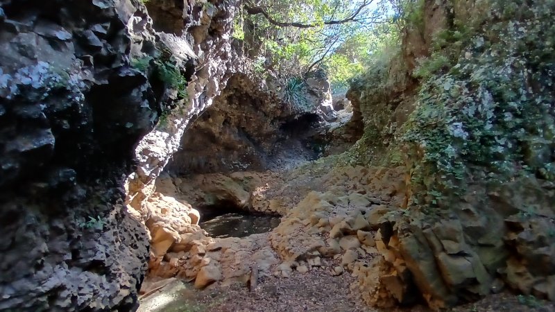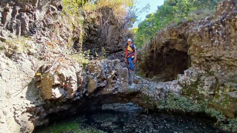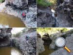 La randonnée débute à la passerelle du Chemin de Pétréas qui permet le franchissement à pied de la rivière en cas de crue. Près du gué, on retrouve le sentier des Petits Tamponnais Ruraux, association disparue en même temps que le sentier, excepté le tronçon décrit ici. Débuter sur cet agréable sentier comportant peu de fortes montées (Photo 1). Une première arche est présente dans le fond de la rivière mais elle est difficilement accessible. Un hors sentier est nécessaire pour s'en approcher entre les arbres et longoses (Photo 2). Petite acrobatie pour s'approcher de l'eau et trouver l'arche au-dessus de son bassin (Photo 3). Remonter un peu la rivière sur les roches de la rive droite puis traverser une belle étendue de renouées du chinois dépassant la hauteur d'un homme par endroits. Ne pas manquer une nouvelle arche sur la gauche (Photo 4). On peut passer dessous pour rejoindre une grande grotte en rive droite. Les bassins se succèdent, imposant quelques courtes escalades sans danger (Photo 5). Cette remontée de rivière amène à un énorme bassin que l'on peut visiter s'il est à sec. Descendre et remonter, également par l'escalade de quelques roches lisses (Photo 6). 5 minutes plus tard, on rencontre un autre endroit, magnifique, très sauvage, destiné aux amateurs de photos de nature (Photo 7). Cet ensemble de bassin-grotte-falaise est un des plus beaux endroits de la boucle. Comme la remontée est rendue impossible sans matériel, faire demi-tour mais délaisser le fond de la ravine pour chercher un passage dans la falaise en rive droite. L'échappatoire se situe derrière un arbre qui aide à l'escalade (Photo 8). Une fois l'étroit passage franchi, remonter en direction du champ de canne à sucre en traversant facilement le bois (Photo 9). Suivre les cannes jusqu'au sentier. Avant de poursuivre vers l'amont, rejoindre le gué et entamer une descente de la rivière en rive gauche pour rejoindre le dernier bassin délaissé il y a quelques minutes. Là aussi, sans danger, descendre vers les bassins dans lesquels il est déconseillé de se baigner (Photo 10). Deux d'entre eux sont séparés par une troisième arche basaltique qui ne se voit pas si le bassin est trop rempli (Photo 11). Remonter au gué puis entamer la suite en empruntant le sentier très fréquenté des marcheurs et coureurs. On y rencontre une racine d'une quinzaine de mètres assez caractéristique (Photo 12). Marcher sous les énormes camphriers bordant le sentier (Photo 13). Le Bassin Samuel se remarque sur la droite mais il n'est pas facile de s'y rendre sans se griffer. Plus loin, repérer le sentier plus discret obliquant sur la droite en direction du Bassin Michel (Photo 14). Le plus souvent à sec, il demande un peu d'attention pour atteindre le fond. Les minuscules marches de basalte facilitent la descente (Photo 15). Lorsque le bassin est plein, c'est une autre affaire que de remonter la rivière (voir ci-dessous la vignette 1 de la photo du § après les pluies). De l'autre côté, l'escalade est identique et facile (Photo 16). Le bassin, un peu envahi de plantes est suivi d'un très long toboggan creusé d'une profonde marmite d'où il serait impossible de sortir sans aide en cas de chute (Photo 17). Plus haut, c'est un gruyère de basalte qui doit être très impressionnant lors de crues importantes. Il se traverse par quelques escalades sans grand danger (Photo 18). Une ferme en rive gauche se repère avec les cris, aboiements, meuglements, cacabements de pintades et odeurs de lisier ! Les pigeons s'envolent par dizaines des anfractuosités où ils viennent pondre. On domine plusieurs bassins plus ou moins importants. Celui situé le plus en amont est alimenté par un petit pisse en l'air après la pluie. On remarque vers l'aval une arche discrète mais qui semble pourtant imposante. Pour s'en approcher au plus près, rejoindre le sentier et marcher vers l'aval jusqu'aux belles racines moussues. Descendre vers le lit puis remonter sur l'îlot basaltique créé par deux bras de la rivière en s'aidant ou non d'une sangle (Photo 19). En remontant l'îlot, on parvient au-dessus de l'arche. Il vaut mieux éviter de monter sur l'arche ou alors le faire prudemment (Photo 20). Cinq mètres d'une corde passée autour d'un arbre peuvent rassurer et éviter la chute dans l'eau sale. Revenir au sentier. En cherchant bien, on devine une arche plus en aval qui se rejoint également avec prudence. De retour sur le sentier, marcher à nouveau vers l'amont jusqu'au prochain embranchement (Photo 21). Partir à droite jusqu'à la rivière. Traverser à nouveau les longues renouées du chinois jusqu'au Bassin Capillaire, reconnaissable à sa grotte tapissée de cette petite fougère de dentelle (Photo 22). N-ième retour au sentier en remontant cette fois la petite falaise basaltique pour rejoindre le gué une centaine de mètres plus haut. Au gué, remonter la rivière à sec jusqu'au confluent du Bras Creux qui finit par une petite cascade souvent à sec. Tout près se trouve un grand bassin profond dont on peut rejoindre le fond sans difficulté. De l'autre côté, attention à l'escalade du bord du bassin si le basalte est humide (Photo 23). Cette fiche termine ici la remontée spectaculaire de la Rivière d'Abord. Trois solutions permettent alors de retrouver la passerelle des Pétréas.