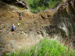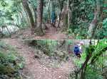 3 – La solution proposée ici. Rejoindre le sentier comme en 1, marcher jusqu'au gué puis remonter le Bras Creux en escaladant la falaise de la cascade à sec (Photo 25). Se frayer parfois un passage dans les cannes fourragères ou suivre simplement le fond basaltique jusqu'à la piste (Photo 26). Emprunter la piste vers la gauche et commencer une agréable descente dans les champs de canne (Photo 27). N'emprunter que les chemins bien tracés par les roues des tracteurs. On côtoie des cases abandonnées, de beaux camphriers, des eucalyptus avant de parvenir au stade du 12e (Photo 28). Ce jeu de piste amène au gué déjà rencontré à la montée. Poursuivre simplement sur le sentier pour arriver en 5 minutes à la Rue Saint-Vincent de Paul.