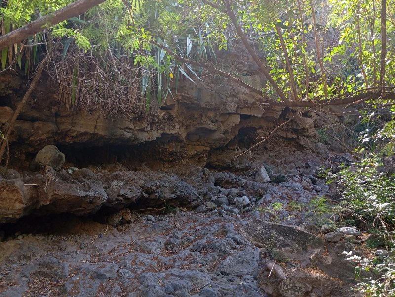 La randonnée peut débuter n'importe où dans Saint-Leu en fonction du programme prévu à la fin du dernier sentier. La présente boucle débute au parking situé au plus près de la Ravine de la Fontaine. Si l'on commence par la visite de la ville, partir vers le port en s'approchant de l'église dans son écrin de verdure, de la mairie en pierre de taille volcanique, du monument dédié à la révolte des esclaves ou du monument aux Morts au milieu de son rond point (Photo 1). Passer ensuite vers le port avant de poursuivre en direction de la Rue de la Croix pour entamer la partie randonnée nature. Un très vieux sentier commençant par quelques marches se trouve légèrement sur la gauche en arrivant à la Rue Haute. Il disparaîtra bientôt sous les immeubles mais permet encore de rejoindre le Chemin Dubuisson. Partir à droite sur la route et marcher jusqu'au lacet. Le quitter pour pénétrer dans une ruelle bordée de quelques habitations. La ruelle, très courte, se poursuit par un sentier facile à repérer dans les acacias. Le sol est recouvert de pierres inégales, comme tous les sentiers autour de la ville (Photo 2). La descente est rapide en direction de la Ravine des Poux qu'on ne quittera guère des yeux tout au long de la boucle. La disposition des pierres ou des murets près des petites grottes montre que le sentier a eu de l'importance à une époque. Il franchit la ravine à sec à quelques mètres d'un cassé de cascade. Il remonte sur l'autre versant dans les mêmes conditions et rencontre très vite le sentier Canal bordé de gros tamarins centenaires (Photo 3). La végétation est toujours aussi pauvre de chaque côté du sentier et les lianes corail, de plus en plus nombreuses, recouvrent presque tout (Photo 4). La montée régulière n'est pas très forte. Le parcours longe plusieurs habitations où l'odeur des biquettes l'emporte sur celle des fleurs. Il coupe la fin du Chemin Canal (Photo 5) puis se poursuit en direction de la Route des Tamarins dans les cassisLeucaena leucocephala : originaire d'Amérique du Sud, a été importé par M. Desbassyns comme fourrage pour les animaux. Il envahit désormais tout l'Ouest. et les zépinardsAcacia farnesiana : Originaire d'Amérique, il porte des épines et fleurit en pompon jaune. Très envahissant et impossible à éradiquer en longeant une ancienne canalisation (Photo 6). Un long détour parallèle à la RN1 est nécessaire pour se diriger vers le viaduc surmontant la Ravine des Poux (Photo 7). Passer sous l'ouvrage, délaisser l'escalier et partir vers la falaise pour y dénicher le sentier permettant de rejoindre l'autre rive en franchissant le gué sur la Ravine des Poux (Photo 8). La jonction est courte mais assez technique sur les grosses roches qui bordent la ravine (Photo 9). Une fois sur l'autre rive, longer la RN1 sur quelques dizaines de mètres, rejoindre la D22, marcher jusqu'au pont et emprunter les sentiers qui mènent à la Rue des Cotonniers (Photo 10). Longer cette petite rue bétonnée puis filer tout droit dans le premier grand virage à droite (Photo 11). Marcher en direction de la RN1 qu'on aperçoit avant de la dominer (Photo 12). Partir à gauche près des prochaines cases et poursuivre dans les herbes, épineux et cailloux. On rencontre également plusieurs sentiers. Suivre les marques et flèches blanches, principalement quand on traverse des pierriers peu évidents (Photo 13). Rejoindre le bord de la RN1 et marcher en direction du pont (Photo 14). Descendre par l'escalier pour atteindre le bas de l'ouvrage. Trouver facilement le sentier qui descend dans les chocas vers la Ravine de Petit Etang en-dessous du viaduc. On retrouve le même paysage que pour la traversée de la Ravine des Poux (Photo 15). La montée caillouteuse assez raide finit au pont. Partir à gauche, passer dessous et rejoindre le sentier de Grand Etang (Photo 16). Ce sentier dans les hautes herbes est facile et agréable. Il oblique plus loin sur la gauche et se dirige vers Saint-Leu. Le prochain sentier part sur la droite pour franchir la Ravine de Grand Etang. Si on ne l'a pas repéré, on arrive aux barrières entourant les minuscules champs de maïs (Photo 17). Faire alors demi-tour sur moins de 20 m pour retrouver à gauche la bifurcation et poursuivre vers la ravine sur un sentier très bien entretenu (Photo 18). Son excellent état est dû à Monsieur Nativel qui effectue plusieurs fois par jour l'aller-retour jusqu'à la ravine pour y puiser l'eau nécessaire à ses petites cultures (Photo 19). Ne pas hésiter à rejoindre la ravine pour la remonter jusqu'à la cascade à sec près de la RN1 (Photo 20). La promenade sur le basalte érodé est très plaisante. Sinon (ou après la visite), franchir le gué sur la Ravine de Grand Etang. Pour cela, suivre les flèches blanches vers l'aval dans le lit de la ravine. A moins de 10 mètres du départ du sentier en rive droite, un grand cassé doit accueillir une belle chute en cas de fortes pluies (Photo 21). Le sentier grimpe ensuite le rempart rocheux en longeant de hautes falaises (Photo 22). Il est assez rocheux mais se pratique aisément. On y rencontre un bel affouche rouge tentant vainement d'étouffer un gros rocher (Photo 23). La falaise est un véritable gruyère qui offrira aux amateurs quelques belles grottes, cavités et sculptures de vieilles laves (Photo 24). Le sentier remonte une dernière fois pour parvenir dans une savane herbue (Photo 25). Suivre les balises blanches sur le sentier principal qui se termine à la petite route de la Salette. Partir à gauche, marcher vers Notre Dame de la Salette, repérer un antique réservoir d'eau de 1903 sur la gauche (Photo 26), emprunter les escaliers (Photo 27) et terminer la descente à la Rue Haute en passant devant la chapelle (Photo 28). La partie sentier étant terminée, rejoindre le véhicule directement ou flâner dans la ville à la recherche de nouvelles curiosités.