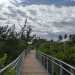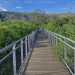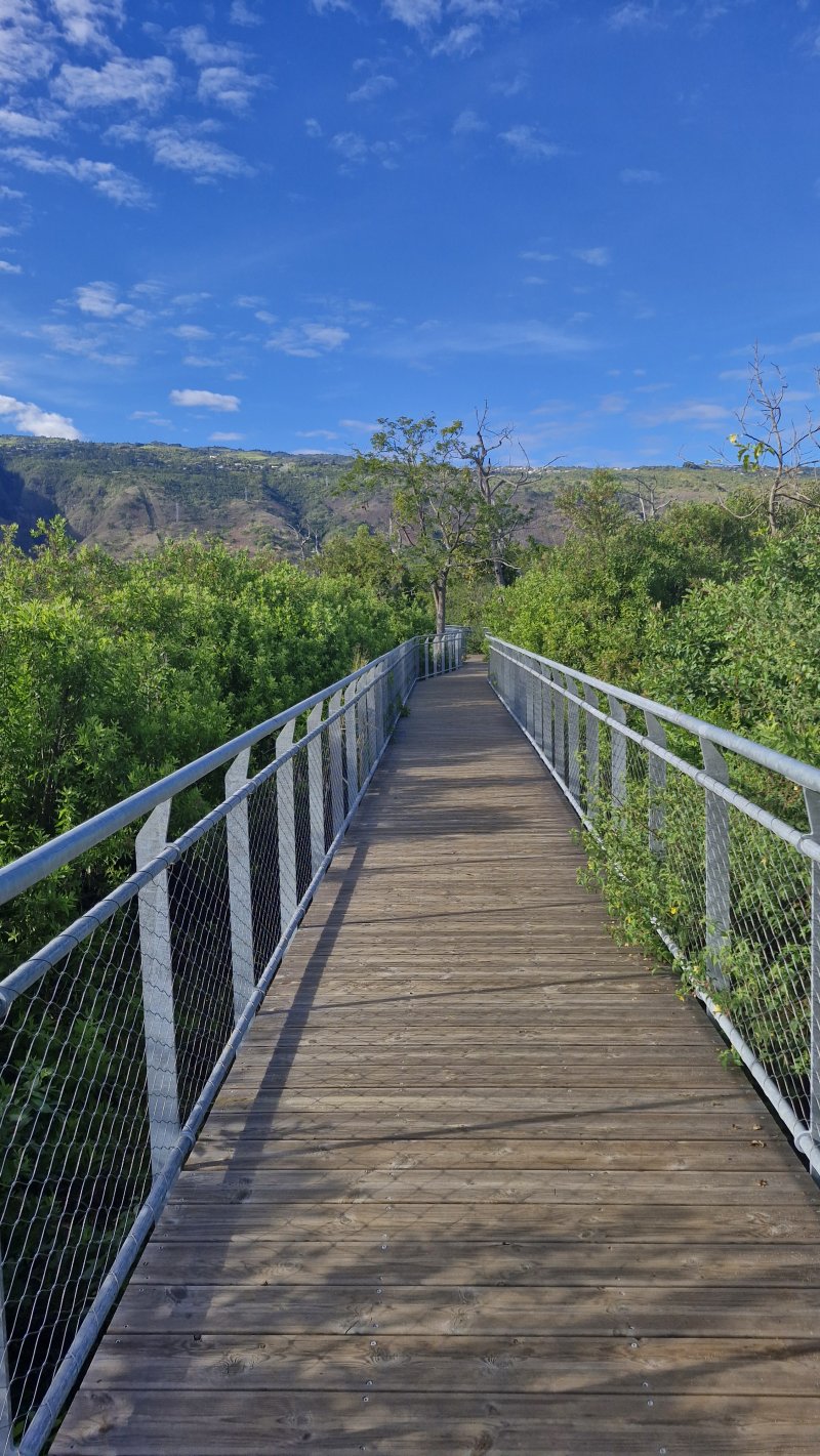 La randonnée débute près d'une zone grillagée au coin du boulodrome. Le panneau de la réserve a presque disparu dans la végétation. Passer entre le grillage et le fossé encombré de détritus provenant sans doute des fêtes organisées lors des tournois de pétanque puis franchir par un gué très sommaire fait d'une demi-palette (Photo 1). S'il y a trop d'eau ou trop de détritus, préférer un départ du parking situé à la fin de la Rue Jules Thirel. Partir à droite sur le sentier qui longe au plus près ce fossé qui se transforme plus loin en ravine dans laquelle viennent boire les bovins (Photo 2). Si, de loin, l'aspect est agréable, il n'est pas très intéressant de s'en approcher de trop près (Photo 3). La prairie toute proche abrite souvent les troupeaux qu'on peut également côtoyer dans les zones marécageuses de l'étang (Photo 4). De l'autre côté, on a de belles vues sur les falaises proches de Macabit et du Ruisseau (Photo 5). Le sentier se termine sur la longue digue qui isole les installations des possibles inondations. La piste caillouteuse menant à l’Étang Saint-Paul peut encore se parcourir mais les plantes, souvent piquantes, ont envahi le passage. Partir donc à gauche et entamer une longue ligne droite sur des milliers de cailloux instables constituant la digue (Photo 6). On peut cette fois profiter des mêmes paysages sans aucune végétation pour masquer (Photo 7). Des zones marécageuses recouvertes de roseaux bordent la piste de chaque côté (Photo 8). Certains petits sentiers, souvent créés par les bovins qui viennent paître ici, traversent des friches en bordure d'étang. Plus loin, la digue oblique presque à angle droit en direction du Tour des Roches, toujours sur les cailloux où les invasives tentent leur chance entre deux défrichages (Photo 9). Plus on s'approche du stade, plus les pistes et sentiers sont fréquentés. On y repère donc plus de signalisations que le long du parcours déjà fait (Photo 10). Repérer sur la droite la belle allée fermée par une grille qui se dirige vers la zone d'aquaculture (Photo 11). Suivre les flèches situées près du portail et laisser quelques habitations sur la droite. Poursuivre sur la piste bordée de cocotiers en direction du stade qu'on aperçoit dans les trouées. On arrive rapidement au départ de la longue passerelle aménagée au-dessus des zones marécageuses. Elle recouvre le sentier longeant quelques canaux et arbres morts. Laisser la piste et entamer la boucle métallique sur plancher de bois (Photo 12). L'ouvrage, très récent, est de bonne facture et justifie à lui seul une balade avec enfants qui seront protégés de la chute par les grillages (Photo 13). Elle est parfois rectiligne ou sinueuse entre les futaies d'une végétation assez banale procurant un peu d'ombre (Photo 14). Des points d'observation ont été aménagés le long de la barrière ou dans des chicanes. Elles incitent par un symbole à s'intéresser aux oiseaux, plantes ou poissons (Photo 15). Plus loin, elle tourne à angle droit pour épouser la forme de l'ancien sentier qu'on devine encore (Photo 16). On retrouve aussi les arbres morts et hauts cocotiers qui bordaient le sentier (Photo 17). Le large passage s'effectue totalement à plat et convient très bien à un fauteuil roulant (Photo 18). L'arbre mort recouvert de cactées est toujours là même si l'on devine une fin imminente (Photo 19). Au dernier virage, la passerelle passe près de bassins envahis de tilapias peu farouches, heureux de savoir que la pêche est ici interdite (Photo 20). Suivre les derniers 50 mètres en pente douce vers la piste quittée 15 minutes avant (Photo 21). On retrouve la large piste bordée de cocotiers en direction de l'aire de pique-nique de la zone. Le canal est plus propre que le précédent ; il est bordé de taros et les tilapias, plus craintifs, s'enfuient à toute vitesse au passage des randonneurs. La piste finit à l'aire de repos et aux tables disséminées sous le couvert des arbres (Photo 22). Avant de poursuivre dans la réserve, traverser la route et repérer la Maison de la Réserve pour une visite durant les heures d'ouverture (Photo 23). En face, un bâtiment abandonné aux ouvertures obturées ne résistera guère à l'urbanisation s'il n'est pas classé aux Monuments Historiques (Photo 24). L'usine sucrière, construite par la famille Lemarchand a produit du sucre jusqu'en 1985 puis a fermé ses portes en 1992. Une grande partie a été transformée en bureaux que l'on peut voir tout près de ce bâtiment. Rejoindre le parking, le traverser puis l'aire de repos en frôlant un vestige de l'usine constitué de grandes roues dentées rouillées. Partir sur la droite, quitter la pelouse et entamer la fin de la boucle sur le sentier qui débute sous les arbres (Photo 25). La progression s'effectue tout d'abord sous quelques arbustes et épineux sur un large sentier très visible (Photo 26). Plus loin, il traverse la prairie humide. Il est moins évident à suivre s'il n'a pas été entretenu mais il ne faut pas craindre le hors sentier si l'on s'écarte des herbes tassées par les semelles (Photo 27). En arrivant à la piste, ne pas hésiter à partir sur la gauche pour une centaine de mètres et se diriger vers l'étang. Les multiples traces de sabots indiquent qu'on ne pourra pas s'embourber. On peut ainsi se rapprocher au plus près de l'eau et des hectares de roseaux (Photo 28). Faire demi-tour et poursuivre vers le gué, le grillage et le boulodrome sur un sentier de bonne qualité dans les épineux.