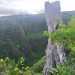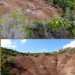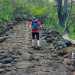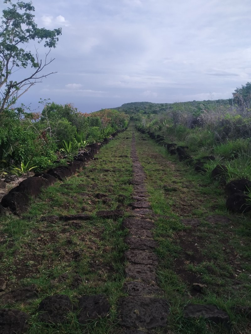 La randonnée débute à deux pas de la gare de la Grande Chaloupe. La première partie, facultative, emprunte la piste en terre longeant la falaise et la longue muraille de gabions empilés sur près de 10 mètres (Photo 1). La route est interdite en cas de fortes pluies ou d'alerte cyclonique. La falaise est impressionnante par endroits et certains blocs ont éventré les gabions, donnant ainsi une idée de la force d'une roche détachée du rempart. On parvient très vite au pont de chemin de fer et au tunnel de la Ravine à Jacques. Un sentier discret commence à droite. En le suivant sur 50 mètres, on s'approche du lazaret qu'on distingue à peine (Photo 2). Plus loin, près d'un "parc bef" où ruminent bœufs Moka et cabris, un sentier descend en rive droite en direction de la mer. De là, on a une vue originale et plongeante sur la Nouvelle Route du Littoral (Photo 3). Les pêcheurs traquent les poissons de roches entre les tétrapodes usés par les vagues. Après cette visite, reprendre le chemin de la Grande Chaloupe puis poursuivre vers le début du Chemin Crémont. Il débute sur la droite près de quelques cases par une assez forte pente qui donne très vite le ton (Photo 4). La végétation de cette colline, surtout constituée de basalte, est pauvre hormis quelques grands tamarins qui bordent le chemin empierré (Photo 5). Les lacets sont courts et la pente forte par endroits. On pense alors aux bœufs ou chevaux qui l'empruntaient au 19ème siècle pour tirer les charrettes. Certaines portions sont défoncées et aucune pierre plate n'est à sa place. Il faut alors lever le pied pour les enjamber ou trouver le meilleur passage (Photo 6). On s'élève rapidement. Les paysages s'élargissent vers la mer et de l'autre côté de la ravine de la Grande Chaloupe (Photo 7). La piste est parfois très étroite en raison des éboulis (Photo 8) ou large et encore très bien pavée (Photo 9). Il faut près de 25 minutes pour atteindre le belvédère donnant sur la Grande Chaloupe (Photo 10). "L'autoroute" est finie et il va falloir poursuivre sur un sentier étroit, non marqué sur la carte, qui longe le rempart de la Ravine de la Grande Chaloupe. Une fois repéré, juste en face du belvédère, le suivre ne pose jamais d'hésitation. Les hautes herbes, les chocas, faux poivriers, avocatiers marrons constituent l'essentiel de la végétation (Photo 11). On parvient en moins de 10 minutes au premier réservoir DFCI entouré de planches. Le sentier s'élargit. On marche sans grands efforts entre les herbes sur une pente faible (Photo 12). Plus on monte et plus le passage est visible, sans doute emprunté plus souvent par les 4x4. Il s'éloigne un peu du rempart qu'on ne perd pas de vue (Photo 13). Plus haut, le sentier fait place à une piste en terre tout en s'approchant d'une seconde réserve d'eau (Photo 14). La végétation, touffue mais assez rase, ne cache aucun panorama en direction de la mer (Photo 15). Dans un lacet, un sentier emprunte le tracé d'une très ancienne piste et se dirige vers le rempart, occupé par des pylônes électriques. Ce n'est pas une grande aventure que de le suivre pour admirer le fond de la vallée (Photo 16). La piste se poursuit en direction de la RD41. Les raccourcis de la carte ne sont pas toujours visibles sur le terrain. Inversement, des pistes n'apparaissent pas sur la carte. Ne pas manquer, à l'altitude 560 m, le sentier qui débute dans un grand lacet de la piste (Photo 17). Il chemine en faible descente entre les fougères, les chocas et quelques rares bois de couleurs (Photo 18). On rencontre, en bordure de sentier, de plus en plus de petites zones occupées par des terres rouges (Photo 19). L'une d 'entre elles, plus importante, impose une halte photo si le soleil éclaire la terre pour en faire ressortir les couleurs chaudes (Photo 20). Tout comme à Fleurié à quelques kilomètres de là, la promenade est agréable tant par la pente faible que par ces traversées de terres (Photo 21). Il est alors préférable de suivre le GPS pour ne pas quitter cet itinéraire naturellement balisé de orange, jaune ou rouge car les croisements sont nombreux (Photo 22). On frôle ainsi les installations d'entraînement de motocross avant de poursuivre vers le nord sur un sentier étroit qui descend rejoindre la Chemin des Anglais à travers les faux poivriers de plus en plus nombreux (Photo 23). Plus bas, le sentier longe et emprunte une petite ravine où il n'est pas rare de rencontrer quelques hautes marches (Photo 24). Après une heure de descente assez facile, le sentier rencontre la piste pavée surchauffée (Photo 25). Partir à droite et longer ces plaques basaltiques avec une pensée pour les esclaves en charge de les casser et de les aligner sous le soleil du nord. Descendre pour franchir la Ravine de la Petite Chaloupe et remonter, parfois fortement, vers le début de la boucle (Photo 26). Cette pente est la dernière difficulté de la randonnée. On repasse devant le belvédère avant d'entamer la descente sur les portions empruntées en montée 4 heures auparavant (Photo 27). La descente est beaucoup plus facile que la montée même lorsque les pierres sont disjointes (Photo 28). La jonction avec le parking est rapide. Ne pas manquer une visite au lazaret ruiné mais rénové abritant expositions et musée ou une balade près du cimetière et son énorme banian aux centaines de racines.