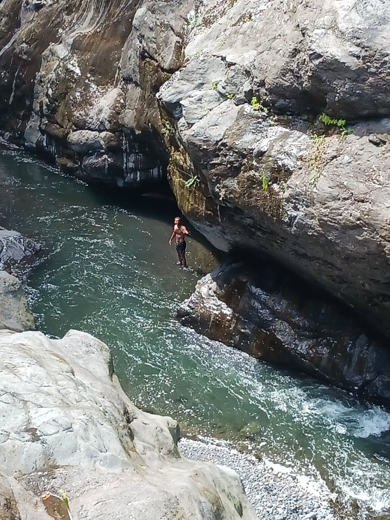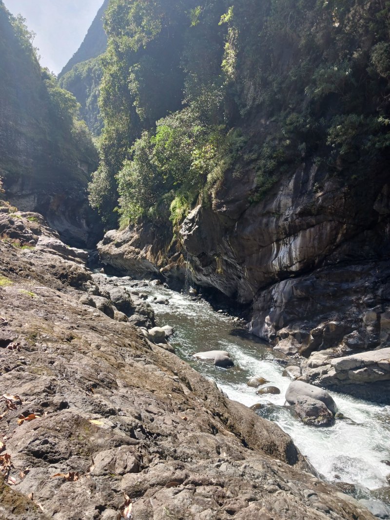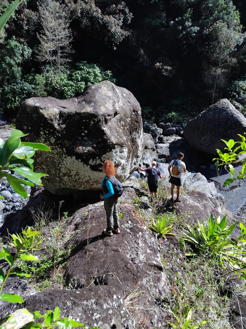La randonnée débute en face de l'école de Bois de Pomme où un grand parking peut accueillir une douzaine de véhicules. Poursuivre à pied sur le Chemin Jean Albani et bifurquer rapidement au Chemin Paille en Queue. On bénéficie de superbes vues sur le Grand Plate, les plateaux que l'on visitera en milieu de boucle et la vallée de la Rivière des Fleurs Jaunes (Photo 1). La descente sur piste est régulière le long des dernières cases isolées du village parmi quelques cultures. Plus bas, moins utilisée, la piste se transforme en sentier dans les cannes fourragères mais la trace reste facile à suivre (Photo 2). D'un seul coup, tout s'arrête et l'on pense que l'aventure va cesser ici. La piste, qui contournait quelques serres et une zone couverte pour stabulation du bétail est à l'abandon et la végétation a largement pris le dessus. Traverser ce fouillis de 20 mètres qui sera le seul écueil de la boucle. Se méfier des galaberts qui griffent et des arceaux de l'ancienne serre pour atteindre le local. Contourner le petit bâtiment puis poursuivre vers la gauche. On se retrouve immédiatement dans le sous-bois qui domine la très profonde gorge de la Rivière du Mât rugissant dans le fond. Attention au ravin de 50 mètres car la marche s'effectue sur une violente descente couverte de feuilles mortes qui peut impressionner (Photo 3). Après quelques lacets on devine un sentier menant à la passerelle sur la Rivière des Fleurs Jaunes qui a disparu depuis longtemps. Faute de passerelle, poursuivre vers le confluent et remonter pour retrouver l'ancien itinéraire emprunté au siècle dernier par les habitants des îlets oubliés. On parvient rapidement au milieu du Y formé par les deux rivières qui se rejoignent (Photo 4). L'endroit est une merveille de la nature avec ces deux canyons qui s'unissent pour un lit commun près d'une petite ravine terminant en chutes d'eau (Photo 5). A première vue, il semble difficile de rejoindre le cours d'eau mais une corde à nœuds pend sur la gauche. La descente est courte, ludique quoique sportive en raison d'un cassé glissant (Photo 6). Avant de poursuivre, ne pas hésiter à investir les lieux pour une agréable visite en partant vers l'aval (Photo 7). Les berges de la rivière sont assez larges pour les suivre sans danger. On a ainsi une belle vue sur le confluent rocheux (Photo 8) et les deux arrivées de rivières sortant respectivement de leur canyon (Photo 9). On voit bien qu'il faudrait attendre un niveau très bas pour s'engouffrer dans ces goulets étroits de toute beauté. L'addition des trois débits d'eau crée très vite une belle Rivière du Mât à l'important débit (Photo 10). S'il est facile de s'approcher des canyons lorsque le niveau d'eau est bas, il en est tout autrement lorsque le courant est plus violent. Renoncer ou prendre des précautions en cas de glissade en ayant une corde qui sécurise (Photo 11). Malgré la corde la glissade est possible, rapide et sans appel (Photo 12). Il est bon, pour une fois, de ne pas partir trop tôt afin de bénéficier du meilleur ensoleillement. Un gros rocher-grotte permet de se mettre à l'ombre tout en profitant de magnifiques vues sur la partie aval de la rivière (Photo 13). La deuxième partie de la boucle débute à la petite ravine tombant en quelques chutes. Grimper en rive gauche de la Rivière des Fleurs Jaunes et en rive droite de la ravine (Photo 14). La petite cascade un peu plus haut se franchit aisément en suivant les restes du sentier un peu abîmés par le temps (Photo 15). Le sentier, également envahi de végétation s'évite tout simplement en longeant la ravine (Photo 16). Marcher au plus facile, soit sur les berges lorsqu'elles sont dégagées, soit dans le lit (Photo 17). Quelques pisse en l'air égayent le trajet assez facile malgré la mousse et les flaques d'eau (Photo 18). Le sentier, lorsqu'on l'emprunte est assez aisé à deviner dans les longoses (Photo 19). Se préparer à quitter le lit du ruisseau quand arrive une zone pentue, rocheuse, bordée d'une petite falaise glissante (Photo 20). Repérer à gauche le sentier qui file en direction de l'Îlet Fleurs Jaunes qu'on prendra au retour. Partir à droite et retrouver le sentier de l'Île Micot. Il est assez bien marqué, bordé de magnifiques filaos, jamrosats ou camphriers, soutenu parfois de marches anciennes indiquant surtout les lieux de bifurcation vers les autres îlets de l'époque (Photo 21). C'est la partie aventure de la boucle, sans réel danger à condition quand même de prendre garde aux ravins qui bordent le passage. Les trois visites proposées ici s'effectuent à l'envie. En partant plein est, on parvient, après de belles pentes assez raides, des touffes de bambous énormes et de beaux camphriers, à un plateau où se devinent ça et là des vestiges de cultures. Plus haut, en bordure de parc national, on rencontre même une vaste étendue de curcuma délaissée depuis des décennies qui est devenue vivace (Photo 22). Partout, des murets plus ou moins alignés confirment que le lieu était habité et cultivé. A la descente, obliquer à droite à trois marches en pierre et trouver plus haut une case encore debout entourée de bananiers et de quelques fleurs (Photo 23). Il faudrait un sérieux nettoyage de la petite bâtisse en bois sous tôle pour y bivouaquer (Photo 24). Une nouvelle case se trouve au dernier embranchement après avoir suivi longuement un mur d'enceinte. La case est détruite mais l'émotion demeure lorsque l'on voit les pierres taillées, les fleurs ou les objets oubliés (Photo 25). Reprendre une dernière fois le sentier emprunté à l'aller qui finit au ruisseau remonté précédemment (Photo 26). Traverser au gué, trouver la trace encore assez bien marquée qui chemine plein ouest dans les goyaviers et bois de couleurs (Photo 27). Le sentier ondule au grès de la végétation ou du relief et pose parfois questionnement : garder à l'esprit que l'on 