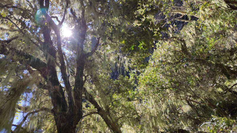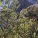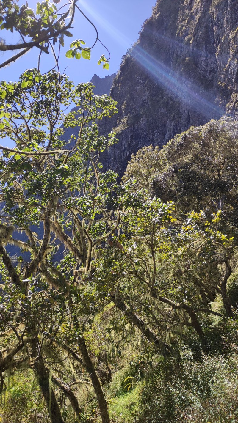 La randonnée débute à la route de l'Îlet à Cordes par la très classique montée du GRR1/2 vers le Col du Taïbit. Sans échauffement, inutile de partir trop vite pour cette longue ascension parfois technique. Les marches succèdent aux marches tout comme les lacets aux lacets avec deux seuls endroits plus plats vers l'Îlet des Salazes et la Plaine aux Fraises (Photo 1). Ce sentier très fréquenté est une entrée prisée pour pénétrer dans Mafate par le Sud. En garder dans les jambes pour la descente vers Marla et la remontée au Kerval. Deux heures après le départ, on s'approche du col pour bénéficier des premiers panoramas sur Mafate à partir du promontoire (Photo 2). Peu de changements pour la descente qui emprunte également de nombreux lacets et quelques belles pentes (Photo 3). Des portions glissantes et un peu vertigineuses se passent avec précautions et l'on parvient en 45 minutes aux premières cases de Marla à plus de 1600 m d'altitude. La traversée de l'îlet verdoyant s'effectue en légère descente facile en passant près de quelques vaches, de chèvres attachées, de gîtes et d'épiceries où il est possible de se ravitailler. Ne pas manquer le troupeau de biches aux alentours de la chapelle avant de parvenir à la Ravine Kerval (Photo 4). Le sentier débute en rive droite dans le sous-bois, quelques mètres après la ravine. Très vite, la pente s'accentue et les roches encombrant le fond de la ravine servent de hautes marches (Photo 5). Pas de sentier officiel mais des traces de passage et des petits cairns permettent de rassurer sur l'itinéraire. Après le franchissement d'une vieille porte en bois délabrée empêchant le bétail de s'échapper, poursuivre vers le plateau dans la ravine ou sur ses berges (Photo 6). Ne pas chercher à quitter le lit tant que les cairns ou la disposition du terrain facilitent la montée (Photo 7). Les 200 m de montée se terminent sur un sol plus dénudé où bouses et empreintes de sabots confirment que le plateau est habité par les bovins (Photo 8). On bénéficie de quelques panoramas en direction du cirque pour apprécier le chemin parcouru (Photo 9). Le paysage de cette zone de pâturages d'altitude est magnifique avec les trois Salazes qui dominent toute la région (Photo 10). Marcher dans la prairie caillouteuse en direction du rempart. Le Gros Morne domine également tout le plateau recouvert par endroits de magnifiques tamarins des hauts (Photo 11). Le sol est un peu vallonné, couvert par endroits de roches ou de tamarins (Photo 12). On atteint très facilement la mare abritant quelques petits poissons et servant d'abreuvoir au troupeau de vachettes vivant dans ces lieux (Photo 13). L'endroit est charmant sous le soleil (Photo 14). Il attire fréquemment les campeurs venant y passer une nuit. Les vachettes vivent ici paisiblement en profitant de l'herbe rase. On peut les approcher sans grand danger à condition de ne pas les effrayer par des gestes brusques (Photo 15). Un rocher isolé permet de profiter de ce coin bucolique en reprenant des forces avant d'entamer la montée au rempart (Photo 16). C'est de ce rocher que l'on a le meilleur angle pour apprécier la suite du trajet qui débutera près de la petite cascade alimentant le lac (Photo 17). Se diriger vers la fine chute puis obliquer à gauche vers la ravine presque à sec venant du rempart. Pas de sentier à cet endroit. Il faut choisir le meilleur passage entre les roches et surtout les jouvences qui recouvrent le sous-bois, cachant quelques pièges entre les pierres (Photo 18). La solution la plus facile consiste à suivre cette ravine au plus près, soit le long des rives soit en empruntant le fond moussu et glissant (Photo 19). En marchant plein est pour se rapprocher du rempart, on parvient facilement sur de vastes pierriers moussus où poussent de magnifiques bois de couleurs dont mahots, mapous et bois de nèfles (Photo 20). Les jouvences sont petit à petit remplacées par le persil et pourpier marrons, fraises d'lo ou des bois, oseilles sauvages ou chasse vieillesse (Faujasia salicifolia). Les barbes de Jupiter ont envahi toutes les branches (Photo 21). Le sol se dénude graduellement à l'approche des falaises constituées d'orgues basaltiques (Photo 22). Il est surtout constitué d'un immense pierrier moussu assez stable. Suivre longuement la falaise entre hautes roches et bois de couleurs (Photo 23). Si jusque là la montée était un hors sentier technique, la suite est autrement plus sportive, tant pour les bras que pour les jambes. Ne pas manquer l'étroit passage à la fin de la falaise verticale pour s'en échapper. La rude grimpette sur un sol recouvert de jouvence doit se pratiquer avec beaucoup de prudence jusqu'à une première corde vieillissante (Photo 24). Plus haut un câble en acier rassure pour franchir un passage vertical barré par un énorme arbre mort. L'effort est intense pour y parvenir et le passage étroit entre tronc et roche pour passer corps et sac à dos. Une corde apportée pour l'occasion peut aider à monter le sac une fois l'écueil franchi. L'arête approche et les panoramas sur le plateau du Kerval se multiplient (Photo 25). Ne jamais baisser la garde pour les derniers franchissements parfois étroits et dominant le vide. L'effort est récompensé en franchissant les branles moussus bordant l'étroite arête des Salazes (Photo 26). La montée prend fin à quelques mètres d'une dent rocheuse repérée depuis le rocher dans la prairie des bovins 300 m plus bas (Photo 27). Les difficultés ne sont pourtant pas encore terminées car il faut affronter la rude descente vers le sentier de Cap Bouteille. La pente y est très forte, les roches glissantes mais quelques cordes facilitent des passages (Photo 28). Après tous ces efforts, la pente paraît interminable mais on parvient enfin au sentier de Cap Bouteille qui semble une autoroute après ces trois heures plus aventureuses. Partir sur la droite puis poursu