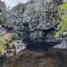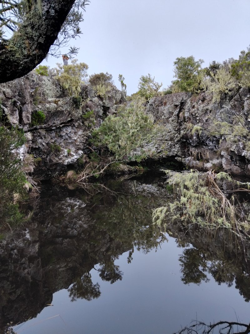 La randonnée débute à 30 m mètres du panneau indiquant le Pare-Feu Chemin de Bout, juste en face de la barrière bois fermant la piste VTT n° 11. L'étroit sentier qui n'est plus utilisé par les cyclistes attaque par une courte ascension du talus (Photo 1). Connu de certains randonneurs, il ne se perd jamais dans les hautes fougères du départ qui ont colonisé le sous-bois de tamarins des hauts (Photo 2). La traversée est un vrai plaisir au milieu de ces centaines d'arbres tous inclinés du même côté. La pente faible est régulière. Plus haut, les tamarins cessent et sont remplacés par les branles verts sur une trace creusée par des années de pneus à crampons (Photo 3). A l'approche de la Piste Forestière des 1800, on rencontre le type de sol que l'on foulera une bonne partie de la randonnée. Les branles sont clairsemés et le sol de plus en plus basaltique (Photo 4). Seuls les cinquante derniers mètres deviennent plus aléatoires en raison de la présence de touffes d'ajoncs. Le sentier devient donc moins visible si l'on décide de le pratiquer à l'envers. Pour cela, se baser sur le seul tamarin penché à quelques mètres de deux radiers bétonnés de la piste des 1800 (Photo 5). Emprunter la piste caillouteuse en partant vers la droite pour moins de deux km (Photo 7). Le sol est plat et la marche s'effectue à bon rythme en profitant de larges panoramas sur la planèze ou en direction de l'océan (Photo 8). Même sans indications, la Ravine la Source est facile à repérer à son cassé et son bassin profond à deux pas de la piste. On peut visiter une partie de l'aval en partant en rive droite sur les plaques et en slalomant entre les touffes de branles verts (Photo 9). Sur les 200 premiers mètres, on distingue peu le fond de la ravine mais on ne peut manquer la véritable forêt de tamarins. Quand ils cessent, il est possible de traverser le cours d'eau par un gué rocheux en prenant garde aux glissades si le sol est humide (Photo 10). Profiter des beautés et curiosités minérales le long de la ravine (Photo 11). Elle est constituée d'une succession de petits bassins au fond d'un canyon beaucoup moins profond que la partie amont qu'on visitera bientôt (Photo 12). Marcher ainsi à l'envie en fonction du paysage, des curiosités et faire demi-tour lorsque la végétation empêche de marcher sereinement. Traverser par un des gués puis entamer un retour en se dirigeant vers l'ancienne piste Bernica, piste VTT n° 9, de moins en moins empruntée par les sportifs. On devine pourtant encore quelques vestiges de la piste qui monte en pente douce (Photo 13). Rejoindre la Piste des 1800 et entreprendre cette remontée de ravine en rive droite. Le canyon est très étroit et devient de plus en plus profond au fur et à mesure de la montée. Les bassins d'eau noire se multiplient. Certains sont profonds et inaccessibles, voire dangereux si l'on venait à y chuter (Photo 14). La faille dépasse le plus souvent les 10 m et impossible de trouver un passage pour traverser (Photo 15). Comme les rives sont la plupart du temps exemptes de végétation, on ne se demande jamais où passer (Photo 16). Les bassins, grottes, cassés, trous se succèdent avec toujours cette obligation d'être très prudent en s'approchant du bord (Photo 17). L'allure n'est ralentie que pour photographier ou profiter du spectacle de la nature. Les touffes d'ajoncs deviennent plus nombreuses et d'importants cassés risquent de gêner la remontée guidée par le mirador du Piton Bernica (Photo 18). Il est donc préférable de traverser sur le seul gué trouvé à 2040 m d'altitude nécessitant quand même de descendre de deux mètres (Photo 19). La rive gauche est comme l'autre. Le sol comporte les mêmes touffes de branles et les mêmes espaces désertiques où il fait bon poser le pied (Photo 20). Au cours de la montée la végétation s'intensifie mais il y a toujours un étroit passage entre les touffes pour retrouver une zone aride. A 2100 m, on frôle l'imposant cratère du Piton Bernica envahi de tamarins (Photo 21). Sur la droite, on aperçoit l'observatoire, viser alors le grillage et le haut mur situés au nord (Photo 22). L'aventure se termine après le grillage lorsque l'on parvient à la route de l'observatoire et que l'on contourne le bâtiment très bien intégré au paysage. Partir sur la gauche puis marcher jusqu'à la piste menant au mirador du Piton Bernica. Au pied du mirador débute le sentier permettant de descendre vers la route du Maïdo. La descente un peu raide comporte de hautes marches de rochers au milieu des ajoncs et autres plantes (Photo 23). On atteint très vite la plaine pour suivre un large chemin basaltique naturel marqué de traces de peinture blanche (Photo 24). A la route, une halte est possible près des tables de pique-nique. Poursuivre sur la très large piste VTT où les engins doivent atteindre des vitesses incroyables (Photo 25). La descente est longue mais facile. On parvient à nouveau à la Piste des 1800, à l'endroit franchi deux heures auparavant. Partir sur la droite et bifurquer après un virage sur le sentier Lygdamis qui débute près de la Piste Bolon. Ce sentier commence presque à plat dans les herbes sous de superbes tamarins (Photo 26). La pente s'intensifie ensuite sans jamais devenir difficile. Les vélos ont tracé de multiples passages dans l'herbe (Photo 27). Plus on s'approche de la route forestière, plus la pente devient forte. La marche s'effectue entre les troncs de tamarins et sur un épais tapis de feuilles (Photo 28). Il se termine à la route que l'on emprunte en partant à gauche pour retrouver le véhicule. Ce dernier kilomètre de béton est totalement plat et bordé de chaque côté de verdure. On rejoint le parking en moins d'un quart d'heure.