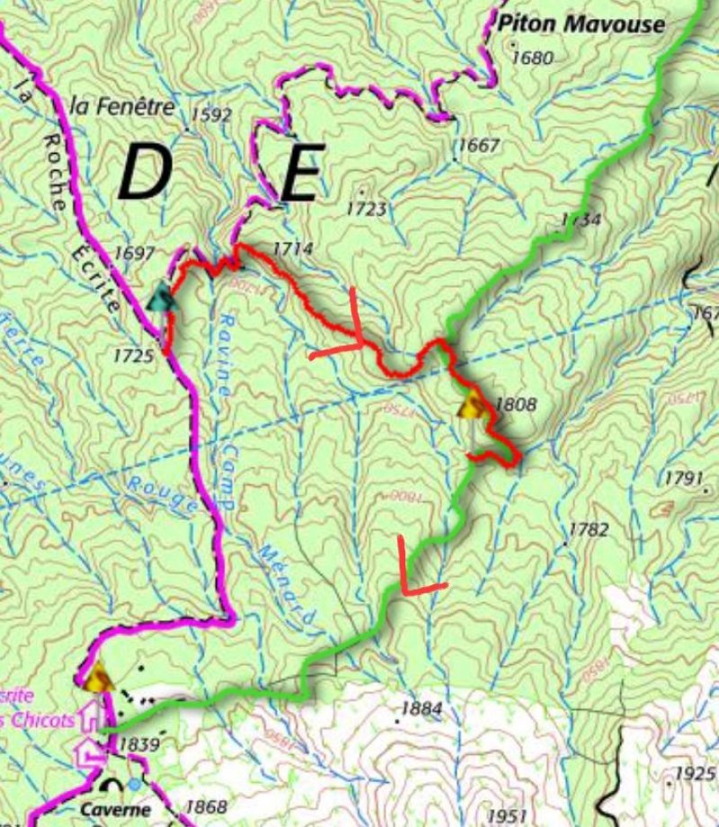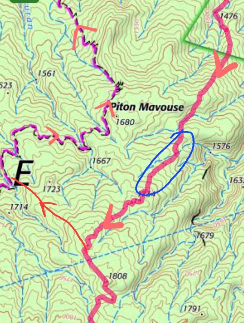 Bonjour, Je complète mon commentaire précedent. Partie inferieure du sentier parcouru ce jour depuis la boucle du Pic Adam jusqu'au sentier qui rejoint le trajet classique Pic Adam -Gîte de la plaine des Chicots (voir trace rouge carte jointe).