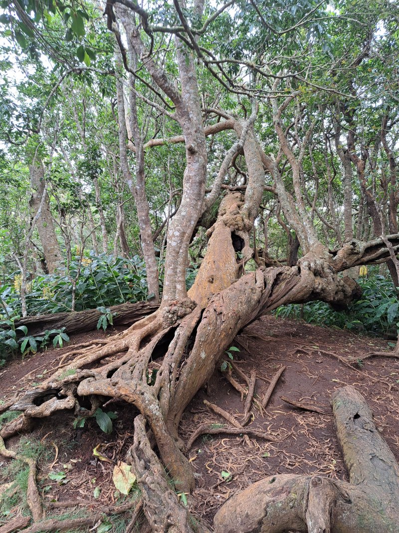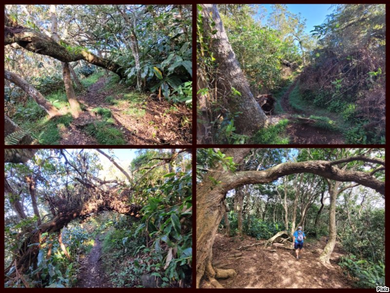 La randonnée débute au parking situé à la fin de la RF des Cryptomerias d'où partent de nombreux circuits vers les forêts, rempart ou Îlet Alcipe. Revenir vers la route du Maïdo pour emprunter l'ancien sentier Lebreton ou le raccourci que l'on peut emprunter dans un virage de la route, en face d'un tamarin esseulé (Photo 1). Les deux premiers kilomètres sont très faciles à décrire : piste en pente régulière, glissante, marquée en deux parties par les milliers de passages de pneus de VTT (Photo 2). Les 300 m de montée s'effectuent en cherchant toujours le meilleur passage le moins glissant. Les abords du large passage sont couverts de longoses et parfois de vigne marronne. Les derniers hectomètres sont plus agréables avec un sol moins creusé et recouvert d'herbe rase (Photo 3). On parvient en moins de 40 minutes à des travaux pour la construction d'une réserve d'eau. La fin de la route Oméga, d'ordinaire agréable, est désormais bordée de tous les monticules de terre ayant permis le creusement de la réserve. En quelques mois, ces talus artificiels seront heureusement recouverts de verdure. Dans le premier lacet rencontré, à la fin du Sentier de Cambour, chercher à quelques pas du panneau de l'ONF la trace discrète remontant vers l'est dans les longoses et bringeliers (Photo 4). La sente est peu fréquentée mais se perd difficilement des yeux malgré quelques fougères (Photo 5). La pente y est parfois forte mais il en est ainsi des sentiers de raccourci qui font gagner des hectomètres mais peuvent faire monter le palpitant (Photo 6). Le parcours s'éloigne d'une petite ravine profonde et arrive bientôt au lacet suivant de la route forestière. L'emprunter sur 200 m et repérer, à deux pas du poteau du Parc National, le nouveau sentier en direction du rempart qui pénètre sous les tamarins des hauts (Photo 7). Il est plus large, plus facile, moins envahi que le précédent et accueille de beaux arbres (Photo 8). Il se termine au sentier du Rempart de Mafate en direction du Maïdo ou de l'Îlet Alcipe, à une vingtaine de mètres du rempart. La végétation cache les points de vue sur le cirque. Partir à gauche sur ce très agréable sentier bordé de tamarins (Photo 9). Il se rapproche du vide pour de premières vues en direction du Grand Bénare (Photo 10). Il n'est pas totalement plat et effectue parfois des montées et descentes sans grande difficulté à travers une végétation constituée essentiellement de tamarins (Photo 11). Beaucoup ont souffert du passage de Batsirai en 2022 mais rares sont ceux qui ne survivront pas (Photo 12). Le sentier se poursuit dans les herbes et sous les tamarins à quelques mètres du vide (Photo 13). Les points de vue se multiplient sur l'ensemble du cirque pour des panoramas n'ayant rien à envier à ceux du Piton des Orangers ou du Maïdo (Photo 14). On domine les trois îlets des Orangers qu'on peut observer à loisir. Puis le sentier s'éloigne petit à petit du bord et pénètre dans la Réserve Biologique des Hauts de Bois de Nèfles. C'est une réserve biologique dont le but n'est pas de préserver les longoses qui recouvrent la totalité du sol (Photo 15). Heureusement, on rencontre à tout instant de magnifiques arbres méritant le respect et même une halte (Photo 16). La marche est toujours aisée, en légère descente (Photo 18). On bénéficie de nouveaux panoramas en direction du Cap Noir, de Dos d'Ane et de la côte près d'un majestueux tamarin (Photo 19). Le sentier domine le plateau de l'Îlet Alcipe. On distingue très bien l'emplacement de l'îlet envahi par la végétation et tous les pitons alentour (Photo 20). Prendre à gauche le sentier de Cambour, également fréquenté et en très bon état (Photo 21). Il effectue constamment des montées et descentes qui ne suffisent pas à couper les jambes (Photo 22). Délaisser ce sentier pour partir à la première bifurcation vers la RF des Cryptomerias. Le sentier est identique au précédent, peut-être un peu plus envahi de racines. On ne tarde pas à frôler le Roi des Tamarins qui, malgré une branche cassée, résiste plus facilement aux cyclones que ses congénères en bord de rempart (Photo 23). Le sentier, large et propre, passe au milieu de superbes bois de couleurs (Photo 24). Aucun espace n'est délaissé par les longoses qu'on ne quittera plus jusqu'au véhicule (Photo 25). Il faut encore franchir de nombreuses ravines plus ou moins encaissées pour de nouvelles montées et descentes. Certaines ont le fond plus rocheux que d'autres et peuvent même être glissantes (Photo 26). Après avoir franchi la plus importante d'entre elles, la Ravine la Plaine, la descente se poursuit avec les mêmes paysages de beaux arbres et de longoses (Photo 27). On ne tarde pas à rejoindre une table de pique-nique et le départ de nouveaux sentiers à la fin de la Route Forestière des Cryptomerias. Poursuivre à gauche sous les grands conifères puis rejoindre le rond-point servant de parking, fin de cette boucle de 10 km (Photo 28).