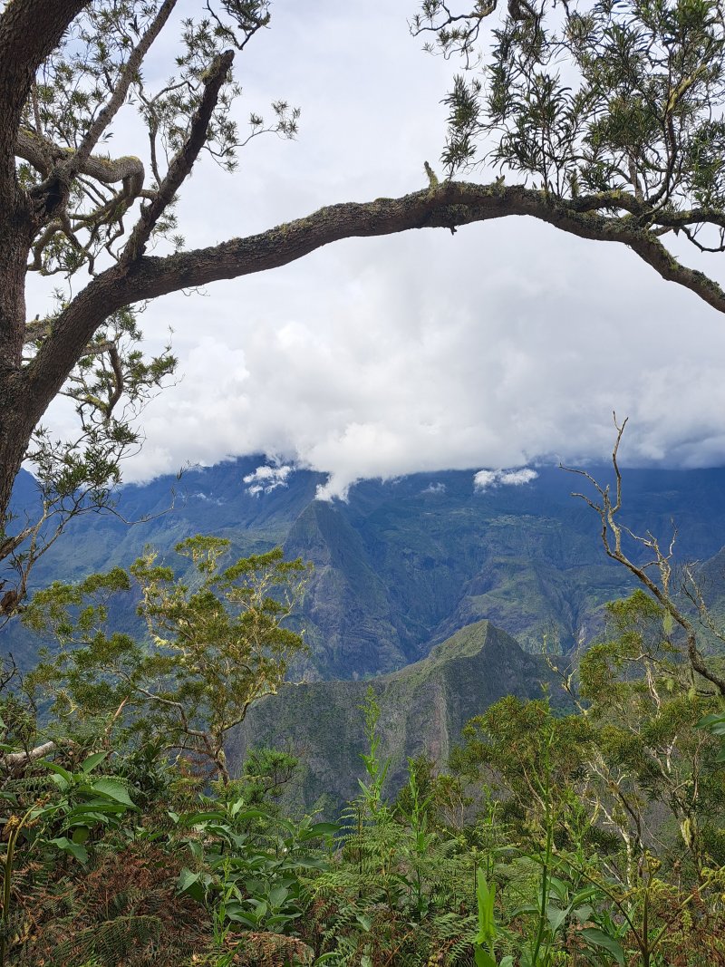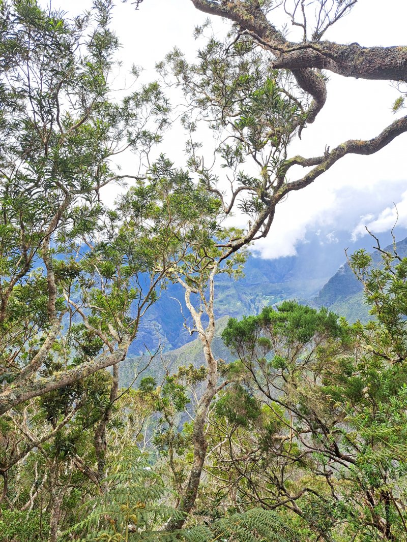 La boucle, dans le Bois de Sans Souci et la réserve Biologique des Hauts de Bois de Nèfles, emprunte certains sentiers déjà publiés sur le site. Cette boucle, à l'initiative de Marc, présente dans sa partie sud l'Ancien Sentier Lebreton, une piste connue des vététistes ainsi qu'un sentier étroit mais bien commode pour couper les longs lacets de la Route Forestière Oméga. Le cheminement s'effectue à moins de 200 m du Sentier Françoise Francia mais la forêt, le sol et l'attrait en général sont très différents. La boucle perd un cœur en raison de cette piste qui, heureusement s'effectue en début de boucle. La sommière Cresson a depuis longtemps disparu mais un sentier demeure entre les lacets ou le rempart pour grimper de manière rectiligne vers les superbes points de vue sur Mafate à la verticale des îlets des Orangers. Une manière de varier les façons de rejoindre l'Îlet Alcipe non prévu sur cette fiche. La montée effectuée, ce n'est que pur plaisir de marcher en bordure de rempart pour bénéficier de splendides panoramas si l'on a pris soin de partir assez tôt. Plus bas, ce seront d'immenses étendues de forêts de bois de couleurs, hélas totalement envahies de longoses. Quelques spécimens d'arbres (bois maigres, tans rouges, mahots, change écorce et bien évidemment tamarins des hauts) méritent fréquemment une petite halte pour les admirer. Comme la randonnée ne fait qu'une dizaine de km, ne pas hésiter à effectuer la courte boucle vers l'Îlet Alcipe qui prendra moins d'une heure et permettra de profiter de nouveaux points de vue sur Dos d'Ane et le Cap Noir.