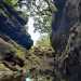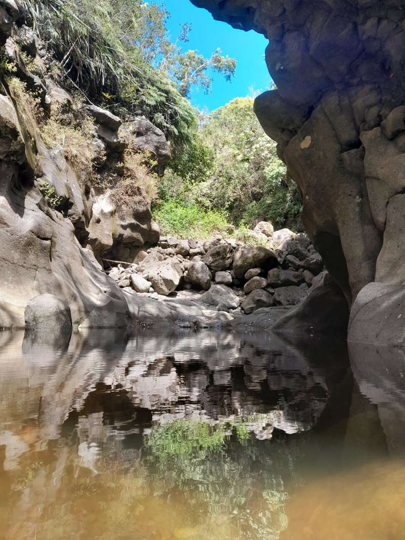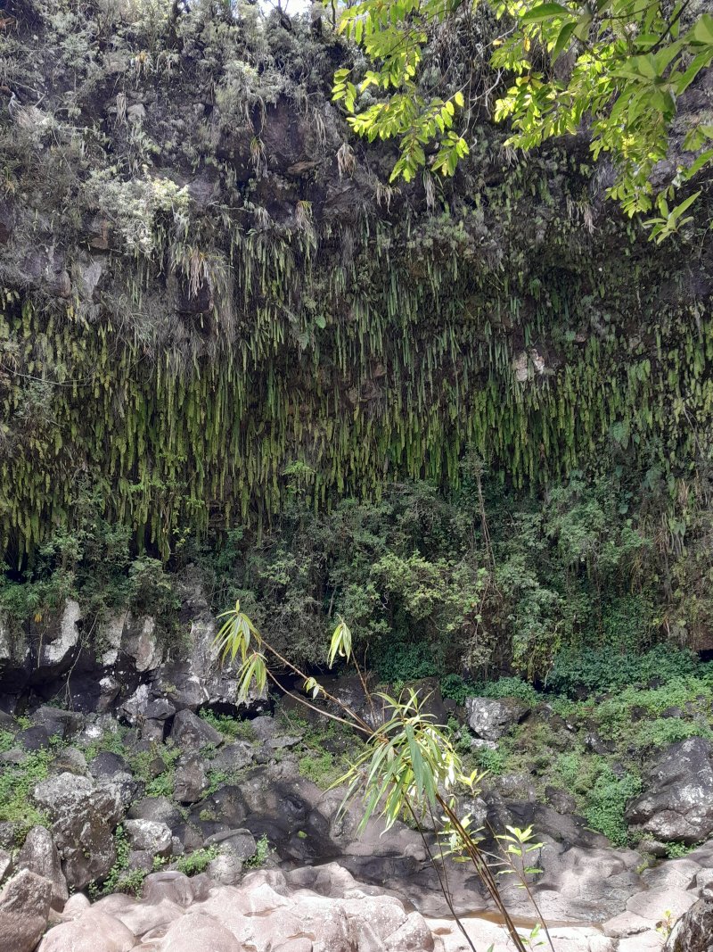 La randonnée débute au plus près de l'Ancienne Nationale pour éviter de trop marcher sur la RN3. Une aire de repos avec un grand kiosque est l'endroit idéal pour stationner. Partir vers Saint-Benoît en profitant du paysage sur le Piton Camp de Tête et les remparts vers la Cascade Biberon (Photo 1). L'Ancienne Nationale est étroite mais on trouve facilement le début sous les grands platanes laissant à l'automne une épaisse couche de feuilles mortes (Photo 2). On devine au sol des portions encore grossièrement pavées de pierres de lave. La végétation est très fournie entre les platanes lorsqu'ils sont verts. Les bambous et Tibouchina tentent de surmonter l'envahissement par les longoses (Photo 3). Après quelques virages, on domine au plus près le lit de la Ravine Sèche en profitant du paysage vers le Piton Camp de Tête (Photo 4). Un long lacet bordé d'azalées mène tranquillement vers la Maison Servaux (Photo 5). Juste avant l'ancienne case, repérer à gauche le début du sentier du point de vue sur Grand Etang. Le passage est devenu étroit mais se suit sans difficulté. On parvient à une clairière bordée de goyaviers et de platanes (Photo 6). Poursuivre la descente ombragée jusqu'à la Ravine Sèche. L e sentier se poursuit sur l'autre rive mais on oblique à droite pour marcher en direction du cassé que l'on devine plus loin. Le cheminement s'effectue sans danger sur de larges plaques de basalte (Photo 7). Comme au Bassin Cadet, le sol est usé par les crues, découpé en dentelle ou creusé de marmites parfois profondes (Photo 8). Un premier bassin se contourne sans mouiller les pieds (Photo 9). Un autre, plus large s'évite facilement pour s'approcher du cassé (Photo 10). Prudence en s'approchant du bord. La falaise verticale de 50 m domine un très grand bassin qu'on devine au pied (Photo 11). Profiter du spectacle et des Mornes de l'Etang couverts d'une végétation dense avant de faire demi-tour car réservé aux canyonneurs (Photo 12). En arrivant au sentier, il est possible de remonter jusqu'au bassin amont dans les mêmes conditions de marche et d'exploration (Voir carte). On retrouve facilement l'Ancienne Nationale près de l'escalier et du sol bétonné ayant accueilli la Maison Servaux. De la case il ne reste que quelques poutres et tôles rouillées. Depuis l'emplacement on imagine très bien les immenses cultures de café puis celles de thé, vite abandonnées dans de nombreuses concessions (Photo 13). Reprendre la piste vers la RN3. Pour les curieux, deux bouches de tunnels de lave se situent à quelques mètres des ruines, sous un platane (Photo 14). La jonction avec la route ne varie pas entre goyaviers, califons, bois de chandelles ou paille sabre (Photo 15). Traverser en prenant garde à la circulation parfois importante et marcher en direction d'une touffe de palmistes proche des premiers camphriers de la ligne domaniale, facile à repérer sur la carte (Photo 16). De la ligne domaniale, il ne subsiste que quelques clairières à l'ombre de grands camphriers (Photo 17). Poursuivre jusqu'à la petite ravine marécageuse et obliquer à gauche pour s'approcher au plus près de la nouvelle ruine du parcours (Photo 18). Sans être une aventure insurmontable, la suite du parcours est une immersion dans les fougères et les goyaviers où il faut constamment garder les yeux au sol pour rester sur le sentier boueux (Photo 19). On n'est jamais très loin des camphriers plantés par l'ONF au siècle dernier (Photo 20). Le sentier se termine à la ravine, à quelques mètres d'un premier cassé. Entamer la remontée de ce deuxième cours d'eau de la journée en retrouvant les rives basaltiques tourmentées (Photo 21). Rien de bien dangereux que ce cheminement entre roches usées, crevasses, marmites ou petits canyons étroits et sauvages (Photo 22). Si le premier se passe dans le lit, d'autres devront être contournés. Les paysages sont assez sauvages et originaux pour ne pas regretter d'être venu (Photo 23). Grottes, canyons, falaises couvertes de végétation luxuriante et basaltes se succèdent (Photo 24). Un magnifique canyon très tourmenté doit se contourner par la rive droite pour réduire les dangers (Photo 25). La pente est parfois forte, les blocs rocheux imposants, obligeant à quelques acrobaties pour les franchir (Photo 26). Après 30 minutes de montée on parvient à une falaise de plus de 40 m de hauteur qui signe la fin du circuit proposé (Photo 27). Avant de faire demi-tour, admirer cette falaise couverte de longues fougères retombant vers le sol (Photo 28). Faire demi-tour, rejoindre la ligne domaniale, la ruine, la RN3, partir à gauche et rejoindre le parking en prenant garde à la circulation. Nous n'avons pas effectué le retour par la route puisque, poussés par le désir d'aventure à partir de la falaise aux fougères, nous avons poursuivi jusqu'au radier de la ligne des Deux Mille en Dessous (Voir § ci-dessous).