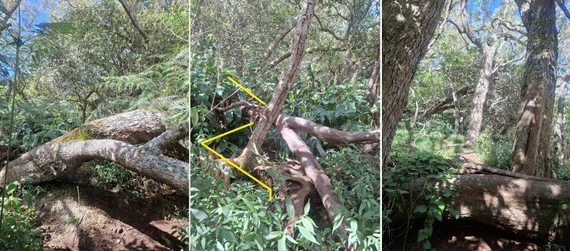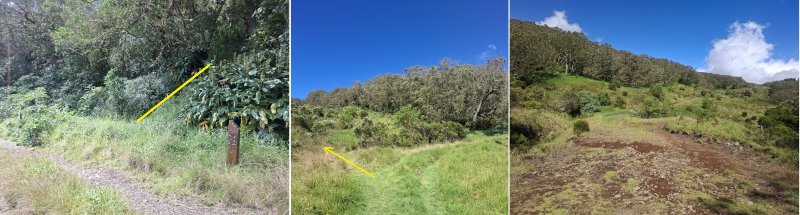 La randonnée débute au parking proche de la Piste Forestière des 1800 Nord. Descendre le court sentier menant à une table de pique-nique puis débuter la boucle sur la piste qui, en hiver, peut être couverte de givre (Photo 1). Marcher 300 m et repérer, sur la droite, le petit talus de départ du sentier remontant vers le Rempart de Mafate (Photo 2). Il grimpe sans difficulté vers les beaux bois de tamarins des Hauts (Photo 3). De hautes herbes et quelques fougères le bordent. Il n'est pas très large mais assez fréquenté pour demeurer toujours facile à suivre. Après une petite dizaine de minutes, il passe sur des plaques de lave très ancienne (Photo 4). Prendre à gauche de cette clairière et retrouver très vite le sentier. Les tamarins cessent, hormis quelques spécimens qui souffrent de maladies ou d'insectes ravageurs (Photo 5). Les ajoncs d'Europe sont de plus en plus fréquents. A l'approche du rempart, ils constituent même l'essentiel de la végétation. On aperçoit déjà la dent caractéristique du Maïdo ainsi que les sentiers qui y mènent (Photo 6). On rencontre d'ailleurs celui menant au Piton des Orangers. Partir à gauche mais ne pas hésiter à emprunter les petits écarts menant au bord pour profiter des vues plongeantes sur le rempart du Maïdo et une grande partie des îlets du Cirque de Mafate (Photo 7). Vers le nord, on distingue très bien Grand Place, Aurère et le principal îlet des Orangers (Photo 8). Situé à 2000 m, le sentier est très agréable avec d'un côté le vide et de l'autre les tamarins que l'on retrouve (Photo 9). Le spectacle est permanent, surtout le matin quand le soleil monte à l'horizon. Le parcours descend un peu et arrive à la fin de la piste Tête Dure, reconnaissable au large emplacement prévu pour faire demi-tour (Photo 10). Poursuivre jusqu'au Piton des Orangers que rien de particulier ne distingue. On a sous les yeux les mêmes panoramas que précédemment mais mieux répartis. Le Grand Bénare est presque en alignement avec le Maïdo (Photo 11). Sur la gauche, on s'est rapproché de l'îlet des Orangers sans pour cela apercevoir celui des Remparts (Photo 12). Pour y arriver, poursuivre sur le sentier toujours aussi facile sous les tamarins (Photo 13). Le virage à droite qu'effectue le sentier permet de voir les falaises dominant les Orangers. Le regard porte même jusqu'à la ville du Port (Photo 14). Les tamarins sont nombreux mais beaucoup ont souffert des violents cyclones. Ils tentent tant bien que mal de survivre en travers du passage (Photo 15). A 1800 m d'altitude, les longoses et vigne marronne ont pris possession des sous-bois. Les nettoyages fréquents permettent de marcher sans se griffer (Photo 16). On rencontre de très hauts tamarins qui ont bien résisté aux vents violents même s'ils ont parfois perdu quelques branches (Photo 17). Plus bas, on domine toute la vallée de la Ravine des Orangers. On aperçoit enfin l'îlet des Orangers Rempart dans son écrin sauvage de petits pitons qui l'entourent (Photo 18). La descente s'accentue dans les fougères. Les pieds peuvent glisser sur le sol sableux (Photo 19). Lorsque l'on retrouve le plat à 1770 m, on s'approche du sentier Cresson (Photo 20). Remarquer, sur la droite, le poteau du Parc National et le trait vert sur la carte IGN. C'est le point de repère pour trouver facilement le sentier de descente. Il débute au plus près d'un tamarin déraciné et d'un autre couché en travers (Photo 21). Les 300 m de sentier étroit permettent de rejoindre la Piste Oméga 60 m plus bas. Il ne comporte aucune difficulté même s'il est plus étroit que celui emprunté pour monter au rempart. La sommière Cresson, désormais invisible car très envahie, se termine dans les jouvences et les touffes de longoses dans un virage de la piste Oméga (Photo 22). Partir à gauche au milieu des tamarins sur une large piste en très faible montée (Photo 23). Très bien entretenue (le jour de la reconnaissance) on n'y rencontre plus les troupeaux qui pouvaient effrayer il y a encore peu. La balade, très critiquée sur la fiche 1313, est pourtant fort agréable et reposante. On bénéficie par moments de panoramas sur l'océan en direction de Saint-Paul et du Cap La Houssaye (Photo 24). Ne pas rejoindre la borne rouge à incendie sur son esplanade bétonnée mais prendre à gauche la sommière Tête Dure. On quitte très vite la piste bétonnée menant à la réserve d'eau pour emprunter les sentiers rectilignes servant de raccourcis (Photo 25). La pente est forte par moments mais la distance à parcourir est faible. Une fois au croisement de la Piste Forestière des 1800 Nord empruntée au départ, partir sur la droite. La balade se poursuit sans effort sur une piste presque totalement recouverte d'herbe. On ne quitte pas les tamarins toujours penchés du même côté (Photo 26). La piste suit la courbe de niveau dans de vastes clairières lentement envahies par les ajoncs (Photo 27). L'arrivée à un tamarin mort en bordure de piste annonce la fin proche de la boucle (Photo 28). Atteindre en quelques minutes la table de pique-nique, le petit sentier montant au parking et le véhicule.