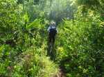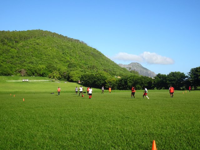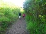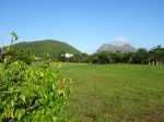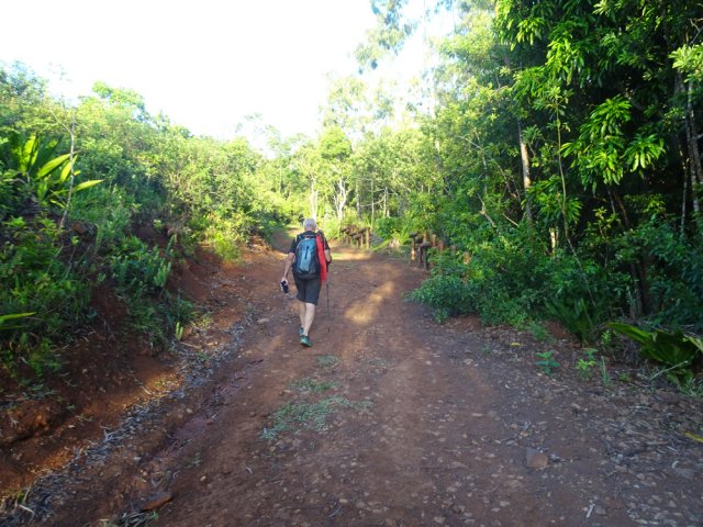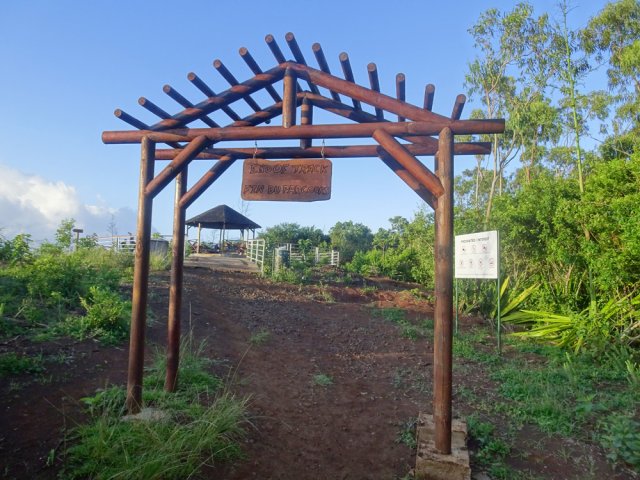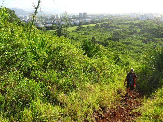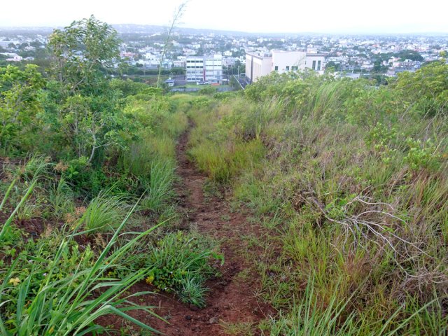 La randonnée débute ici au centre anti-cancer tout neuf de Quatre Bornes. Les gardiens, prompts à entamer la conversation, invitent même à stationner sur le parking du centre. Emprunter la petite route en quittant le centre par la droite et trouver très vite le sentier débutant sur la gauche qui évite de pousser plus loin vers le début de la piste (Photo 1). Le passage, moins utilisé que d'autres entrées, est tout de même très facile à suivre dans les friches (Photo 2). On récupère très vite la piste qui part à l'assaut de la colline. Elle est constituée de terre rouge volcanique (Photo 3). Repérer, en montant, de nombreux sentiers partant de tous côtés. Ils seront utiles au retour pour changer de la piste. Moins de 15 minutes après le départ, on parvient au sommet marqué par un grand kiosque et une porte symbolique en bois (Photo 5). Du kiosque, on bénéficie de quelques vues sur la région mais en partie masquées par les arbres (Photo 7). Reprendre le chemin inverse puis bifurquer à gauche au premier sentier qui s'enfonce dans la forêt (Photo 8). Tout aussi connu que la piste puisqu'il mène à un point de vue, le large sentier est agréable (Photo 9). On parvient à une barrière qu'il est aisé de contourner pour regagner le rocher que l'on peut repérer depuis Quatre Bornes. Toute la ville s'étale au pied de la colline et le Corps de Garde paraît solitaire au milieu de cette urbanisation forcée (Photo 10). Reprendre à nouveau le chemin inverse et retrouver la piste. Entamer la descente mais ne pas hésiter à emprunter les sentiers qui évitent la terre rouge de la piste (Photo 11). L'un d'entre eux, sur la gauche en descendant, sillonne les fourrés et bosquets. On devine de loin le parc Sodnac et même les arbres qui longent la piste (Photo 12). Cet itinéraire renforce l'idée de randonner puisque l'on est sur des sentiers. Une fois la piste retrouvée, repartir à gauche à nouveau sur un chemin empierré et ombragé où l'on rencontre de nombreux marcheurs et coureurs (Photo 13). Une porte du même acabit que celle du sommet est le point de départ pour les sportifs venant du grand parc (Photo 14). Franchir la barrière et pénétrer dans le Sodnac Wellness Park afin de poursuivre agréablement cette sortie urbaine. Partir à gauche et longer le grillage afin de tenter un tour complet. De l'autre côté, une halte permet de voir un canon pointant sur les terrains (Photo 15). Des travaux ont été entrepris pour fortifier les pentes et installer des équipements sportifs au pied de la colline (Photo 16). Poursuivre vers l'est sur des allées ombragées (Photo 17). Le contraste est souvent important entre les immeubles, la verdure et même une grande plantation d'arbres endémiques (Photo 18). Le parc est divisé en zones bien délimitées et indiquées par des panneaux (Photo 19). Il finit au milieu des immeubles à un grand parking dédié aux visiteurs. L'allée se poursuit donc pour repartir vers l'ouest (Photo 20). La colline, à cette distance, paraît bien petite même si elle domine de 100 m (Photo 21). Il doit faire bon habiter près de cette verdure bien entretenue (Photo 22). L'allée accueille autant de marcheurs et coureurs que de l'autre côté (Photo 24). Les équipes de foot se régalent sur cette pelouse digne des grands stades (Photo 26). Une fois le tour complet terminé, repartir derrière la clôture en reprenant à gauche après la porte. Tourner à droite au premier croisement puis suivre le sentier longeant des parcelles qui pourront par la suite être enfermées derrière des grillages (Photo 27). Rejoindre la Rue Sayed Hossen puis partir à droite en direction du centre anti-cancer. La route est un peu bruyante mais la jonction est courte. Marcher sur le trottoir (Photo 28). On peut rejoindre le véhicule par la petite rue ou traverser les installations du centre médical.