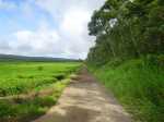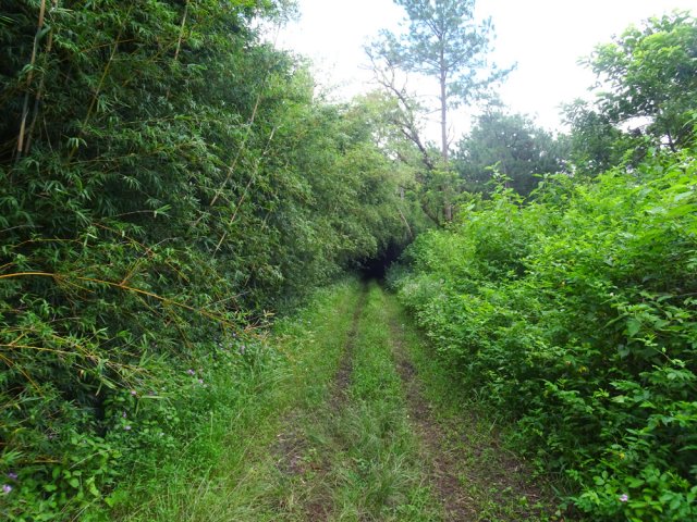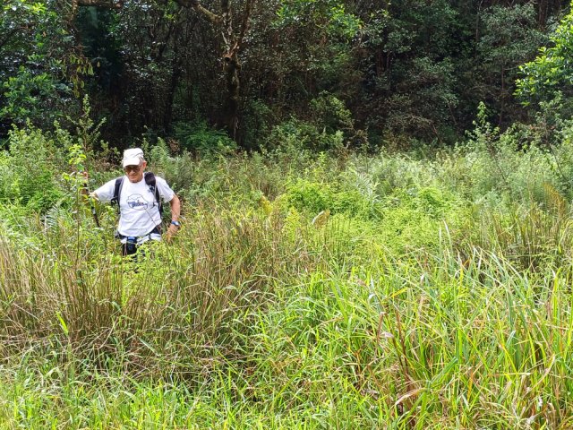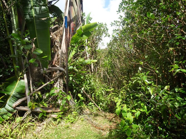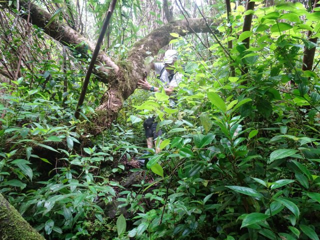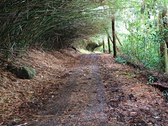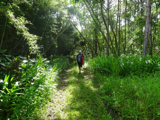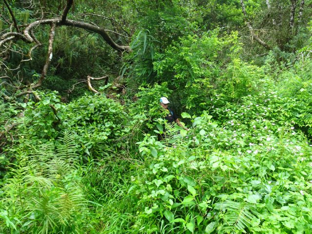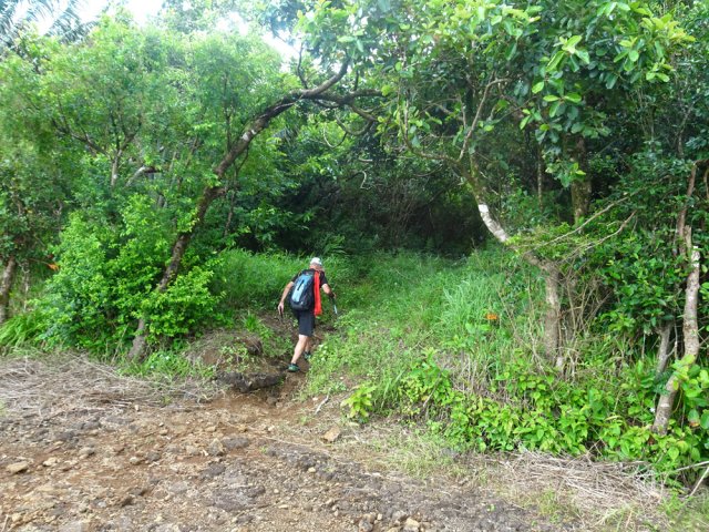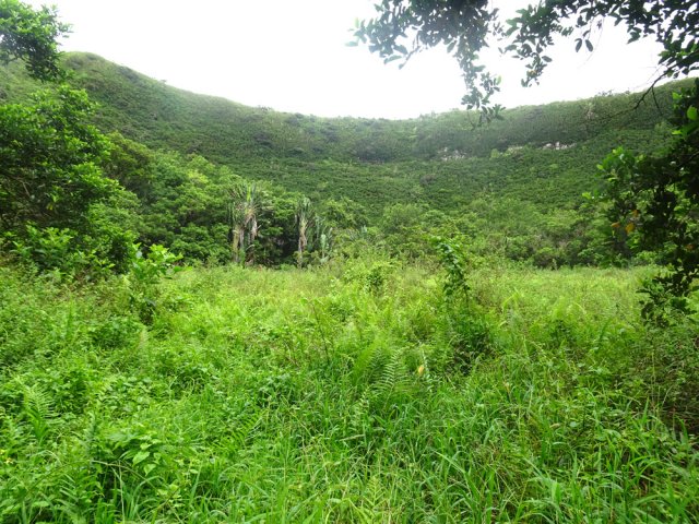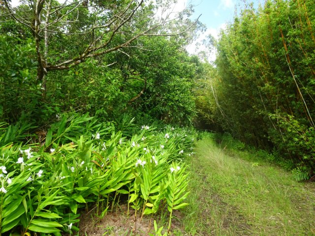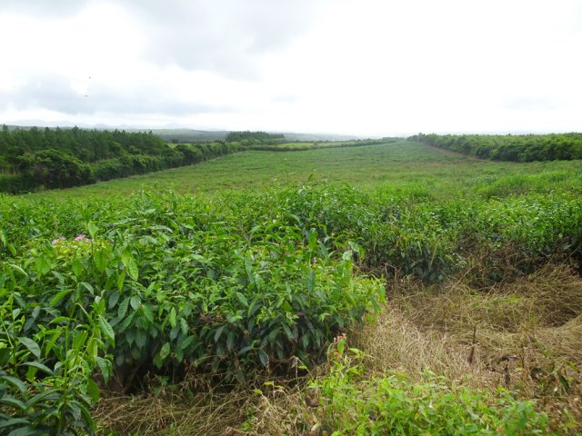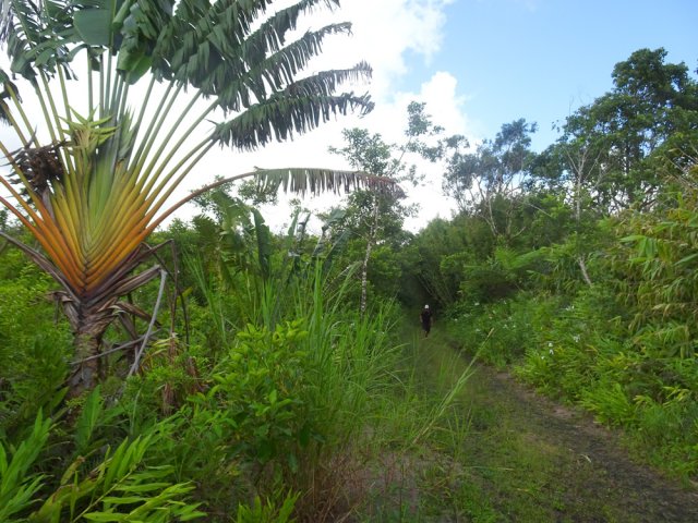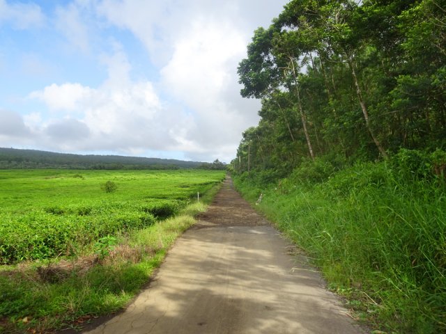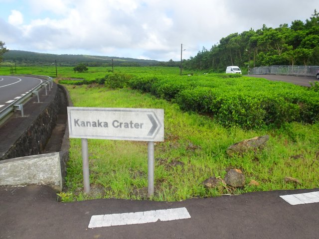 La randonnée débute sur la B88, entre Bois Chéri et Grand Bassin. Dans un virage vers la gauche, repérer le panneau "Kanaka Crater" à l'emplacement d'un ancien virage de la B88 (Photo 1). Quelques places de stationnement se trouvent aisément avant d’entamer la randonnée. Aucune indication pour trouver le départ, mais il n'y a qu'une piste qui s'enfonce vers l'ouest entre une forêt et d'immenses champs de thé (Photo 2). Il pousse ici à perte de vue sous un climat qui lui est favorable (Photo 3). A la première intersection, obliquer à droite puis emprunter un large chemin entre bambous et quelques arbres (Photo 4). La marche y est facile et rapide sur terre ou herbe verte (Photo 5). Sur la droite, le sous-bois clairsemé est humide (Photo 6). De l'autre côté, une épaisse haie de bambous cache la vue d'une grande prairie entourée de grillage (Photo 7). Les parties humides se contournent facilement (Photo 8). Après une longue traversée verdoyante, on parvient à la fin d'une petite route de desserte des champs de thé. Prendre à gauche et profiter des goyaviers de Chine qui remplacent momentanément les bambous (Photo 10). Le paysage change. On retrouve les grandes étendues de plantations de thé, quelques conifères et autres grands arbres (Photo 11). On a ainsi tout le loisir d'étudier la disposition des pieds de thé pour en faciliter la récolte (Photo 12). Quelques gros camphriers dépassent des sous-bois (Photo 13). On retrouve cependant les haies de bambous le long d'un chemin toujours aussi rectiligne et plat (Photo 14). Elles vont jusqu'à créer de véritables tunnels végétaux (Photo 15). On ne quitte guère les champs de thé. L'un d'entre eux sert de repère pour se rapprocher du cratère. Il est tout en longueur entre de hautes haies (Photo 16). Juste en face, côté lisière, on trouve très facilement le sentier qui pénètre dans la végétation (Photo 17). Il monte doucement entre goyaviers et tabac bœuf en direction du bord du cratère (Photo 18). On l'atteint très rapidement. Il se reconnaît à quelques ravenelles, un poteau avec de la peinture bleue indique le début de la descente (Photo 19). Auparavant, obliquer un peu sur la gauche et rejoindre un endroit dégagé servant de point de vue. On distingue assez bien l'ensemble de la grosse dépression malgré les arbres (Photo 20). Retrouver le sentier puis entamer la descente sur une trace très étroite et pentue. Les goyaviers aident à éviter les glissades (Photo 21). Le passage est discret mais ne se perd pas des yeux (Photo 22). Comme lors de la descente vers le fond du Trou aux Cerfs, on devine des vestiges de travaux. Le sol humide est glissant. Les pierriers sont instables mais sans danger (Photo 23). La descente est courte et l'on parvient en quelques minutes au niveau du fond de cratère également recouvert de végétation (Photo 24). Très vite, ce sont les joncs et de hautes herbes qui dominent (Photo 25). La sortie peut prendre fin ici puisqu'on distingue très nettement l'ensemble du cratère (Photo 26). Si on décide d'aller plus avant, il faut savoir qu'on sera obligé de mouiller les chaussures car le terrain devient de plus en plus marécageux (Photo 27). On est d'ailleurs très vite bloqué par des mares peu profondes mais aux eaux noires peu engageantes (Photo 28). Il est donc préférable de remonter vers les champs de thé ou vers les goyaviers avant de revenir par les pistes jusqu'à la route.