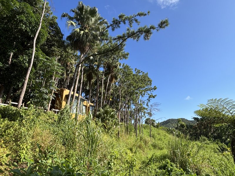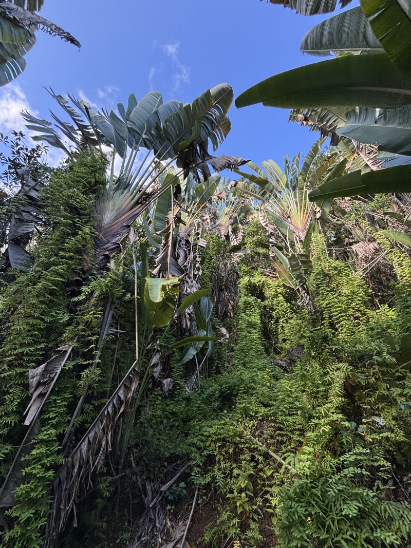 La randonnée débute au restaurant. Franchir la barrière puis entamer la descente en longeant quelques bungalows sous les arbres (Photo 1). La piste, transformée en sentier, descend d'abord légèrement. Elle se rapproche d'un bois de ravenelles occupant les flancs de la vallée (Photo 2). Puis on a du mal à distinguer la piste devenue un sentier encore très facile à suivre (Photo 3). Les points de vue sont rares en direction de la mer vers Souillac (Photo 4). On remarque à un moment la cascade à 300 m, un peu cachée par les ravenelles. Le sentier oblique à droite. Au premier embranchement, prendre à gauche près d'une souche indiquant la direction (Photo 5). Le sentier frôle un gros arbre étouffé par un ficus aux longues racines (Photo 6) avant d'atteindre la rivière dans une végétation assez fournie (Photo 7). La Rivière Savanne se caractérise par son lit très rocheux, facile à traverser ou à longer (Photo 8). On entend très bien la cascade. Remonter le cours d'eau en marchant au plus près sans sentier précis (Photo 9). On atteint très vite le bassin ombragé par les jamrosats (Photo 10). Escalader quelques rochers pour l'atteindre (Photo 11). Même quand le débit est faible, l'endroit est superbe. La cascade tombe en plusieurs chutes d'une quinzaine de mètres (Photo 12). En contournant le bassin en rive gauche il est assez aisé d'en atteindre le pied (Photo 13). C'est plus difficile par l'autre rive (Photo 14). La température de l'eau et la profondeur du bassin facilitent la baignade (Photo 15). Entamer ensuite le retour en partant vers l'aval sur les grosses roches (Photo 16). Remonter le sentier en direction du lodge et guetter sur la droite le départ d'un sentier plus étroit. Là aussi il s'agit d'une piste délaissée où seul un passage étroit subsiste au milieu des hautes herbes (Photo 17). Plus bas, les fougères remplacent ou se mêlent aux herbes (Photo 18). Marcher jusqu'au rocher sur la droite. Délaisser le sentier et partir à droite vers la rivière. On parvient en quelques pas à une retenue d'eau entourée de béton (Photo 19). La retenue forme un étang aux eaux sombres (Photo 20). La partie bétonnée est un barrage destiné à la récupération des eaux (Photo 21). On aperçoit sur l'autre rive le bout d'une route de servitude qui finit en pelouse bien entretenue (Photo 22). La traversée de l'ouvrage pour atteindre la route est très facile sur cette large digue en bon état (Photo 23). Depuis le haut, on domine les grandes marmites laissées par la rivière lorsqu'elle coulait avant la construction du barrage (Photo 24). Elles sont encore alimentées par des fuites dans la structure. La baignade est possible dans la plus grande marmite (Photo 25). On peut descendre assez facilement au pied de la construction pour s'approcher du précipice (Photo 26). Plus de 40 m plus bas, on distingue un grand bassin (Photo 27). Le spectacle devait être au rendez vous lorsque l'eau circulait librement. Actuellement, seule l'eau du trop-plein s'écoule si les canalisations aperçues en rive gauche en laissent un peu dans la réserve (Photo 28). Pour y voir une belle cascade, venir après de grosses pluies. Si aucune baignade n'est programmée dans la grande vasque, reprendre le sentier emprunté à l'aller et remonter au lodge.