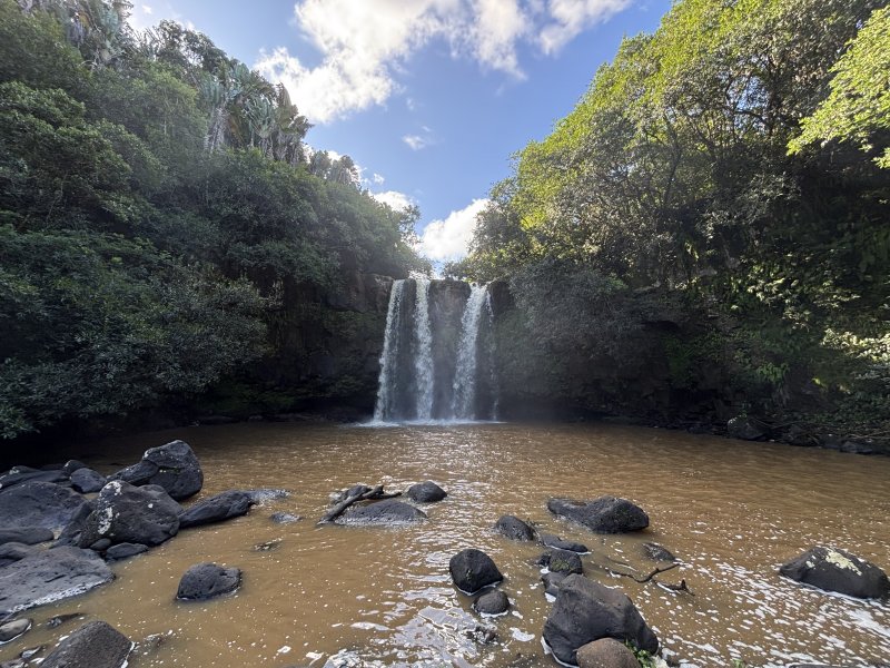 La cascade Léon coule de la Rivière Savanne dans un bassin assez profond pour y effectuer d'agréables baignades. Plus en aval, une retenue d'eau peut également se visiter. Comme souvent sur l'île, les cascades sont situées en domaine privé. Ici, c'est un lodge qui est implanté au départ. Il est composé de nombreux bungalows aux formes futuristes. Il ferme ses portes les 6 premiers mois de l'année mais l'accès y est toujours possible. Le parking est accessible à tous ou du moins aucun panneau n'en interdit l'entrée. La gardien mène gentiment au début du parcours si doute il y a. Au cas où on ne le verrait pas, le parcours est situé près du restaurant. La visite est payante durant l'ouverture mais gratuite lors de la fermeture. La balade familiale débute par la Cascade Léon se trouvant vers l'amont. Elle peut se compléter par une intéressante approche du barrage, des installations de recueil des eaux ou par le bassin situé au pied d'une impressionnante falaise avant de revenir au parking.