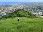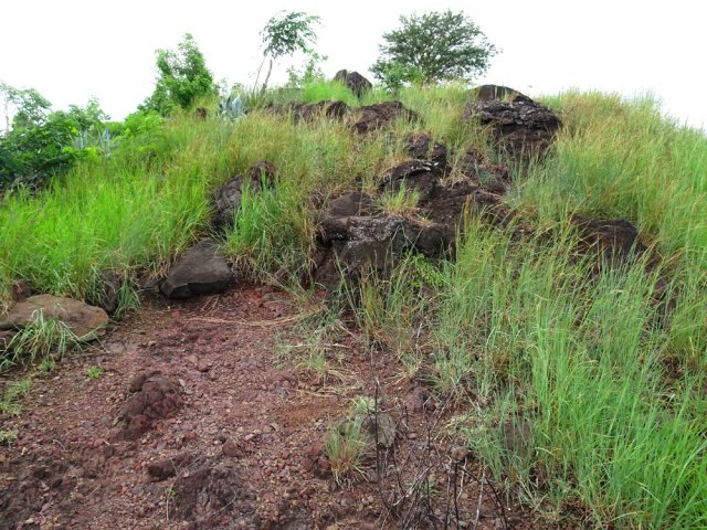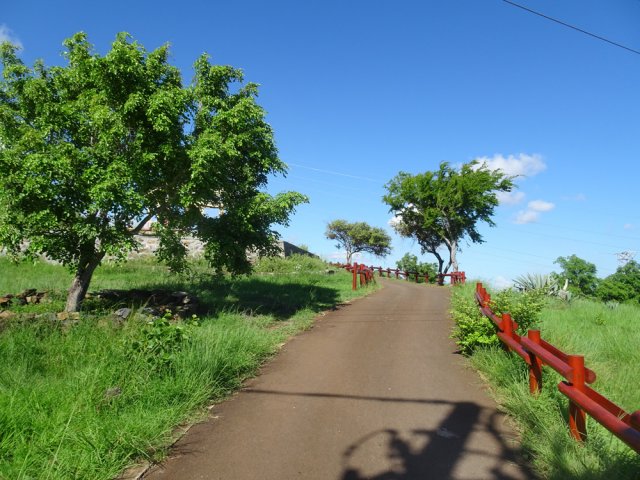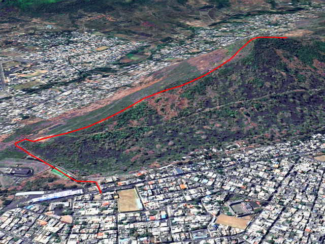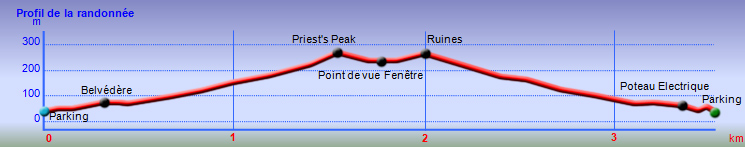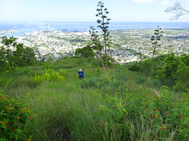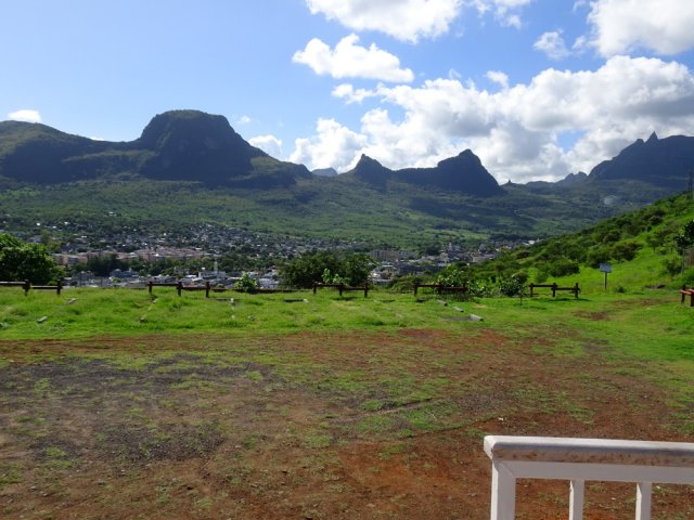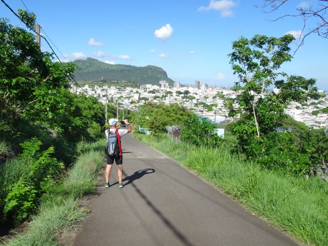 La randonnée débute le long de la Military Road et rejoint très vite un jardin paysager après avoir traversé un canal souvent à sec. Un panneau confirme la bonne direction après le canal (Photo 1). Lire, avant de partir, l'histoire de la fin de la Batterie Dumas lors de la guerre entre anglais et français en 1810 (Photo 2). Passer le jardin paysager et entamer la première partie de la montée sur une agréable petite route. On s'élève tranquillement au-dessus de Port Louis (Photo 3). Quelques arbres et des barrières en bois marquent la fin de la partie goudronnée (Photo 4). Le terrain devient très plat sur le plateau qui domine la ville. On a de belles vues sur le Pouce et les principaux sommets des environs. Repérer le belvédère construit au-dessus du plateau qui se rejoint par un escalier pour profiter du paysage (Photo 5). On devine le Priest's Peak qui semble tout proche (Photo 6). N'emprunter ni la piste partant à droite ni celle de gauche. Viser le premier pylône situé au bas de la pente (Photo 7). Le sentier n'est pas très évident à trouver mais on remarque la trace dans les herbes près de ce pylône. La montée débute rectiligne, comme toujours sur l'île. On domine maintenant les quartiers Nord de Port Louis (Photo 8). Les traces du sentier sont par endroits très faciles à suivre (Photo 9). D'autres fois, il est plus étroit et envahi d'herbes mais le passage historique demeure (Photo 10). Sur la gauche, le quartier de Sainte-Croix et la Cité la Cure donnent une idée de l'habitat de la banlieue (Photo 11). La montée n'est jamais très forte à travers les hautes herbes et quelques arbustes vivant chichement sur un sol pauvre (Photo 12). Les chocas bleus et bois noirs des bas se multiplient (Photo 13). A 200 m d'altitude, les panoramas se multiplient sur la capitale (Photo 14 et 15). La pente cesse sur une centaine de mètres pour reposer un peu les jambes mais avec la chaleur et le manque d'ombre, il vaut mieux poursuivre vers le sommet (Photo 16). La trace, plus ou moins facile à suivre, est toujours située sur la ligne de crête (Photo 17). Aucune végétation ne vient gêner les vues sur les pitons et Port Louis (Photos 18 et 19). La montée est rapide malgré la chaleur sur un sentier très facile à suivre par endroits ou caché par les herbes à d'autres (Photo 20). Après 45 minutes de montée, on s'approche du sommet abritant de plus en plus de chocas (Photo 22). Les galaberts se multiplient sur la dernière centaine de mètres (Photo 23). Le sommet est surmonté des ruines d'anciennes constructions (Photo 24). Très peu d'ombre pour se protéger après cette montée qui fait perdre beaucoup d'eau (Photo 25). Tout autour d'autres vestiges subsistent, mais plus aucun n'a de mur. Il est donc possible de faire demi-tour après avoir admiré le paysage à près de 360°. Après avoir traversé un bosquet, le sentier se poursuit vers le sud. On profite de nouveaux paysages en direction du Pouce et de la barre rocheuse de la Fenêtre (Photo 26). On voit très peu la Fenêtre, cette grande cassure qui se remarque très bien depuis la capitale. On doit la repérer au rocher isolé qui la domine (Photo 27). Le sentier qui y mène est du même acabit que celui qui vient de se terminer. Il ne faut donc pas s'y rendre seul, prévoir beaucoup d'eau et de temps. Le retour s'effectue par le même itinéraire que celui emprunté dans la montée avec, cette fois, la capitale toujours devant soi (Photo 28).
