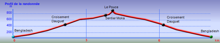 La randonnée débute au quartier Bangladesh. Stationner aux alentours de Pouce Street puis rejoindre à pied le début du parcours en frôlant quelques modestes cases (Photo 1). Une fois cette première centaine de mètres peu incitatifs, on se retrouve sur un chemin grimpant en pente douce en direction du Pouce sous quelques grands arbres (Photo 2). Les roches sont peintes en blanc pour confirmer le bon itinéraire. Le manque d'entretien par endroits a facilité l'implantation de grandes herbes et autres plantes. On longe la chaîne du Snail Rock sur la droite. Jamais la montée n'est difficile (Photo 3). Après une vingtaine de minutes, on parvient à une bifurcation marquée par quelques panneaux qui indiquent distances et temps de marche (Photo 4). Prendre à droite du panneau et délaisser le sentier de gauche. La montée au Pouce débute dans des sous-bois très touffus envahis de lianes papillon assombrissant fortement le parcours (Photo 5). Ces lianes sont si touffues qu'il est impossible d'y repérer un sentier qui les traverserait. La marche s'effectue sur des lits de feuilles mortes en évitant les pierres et roches encombrant le sentier (Photo 6). Il n'y a pas à réfléchir pour trouver son chemin. La montée est régulière entre de hautes haies de lianes et des bosquets de goyaviers (Photo 7). Une demi-heure après la bifurcation, le chemin s'éclaire en arrivant aux premières clairières. On aperçoit enfin l'horizon et les pitons entourant Port Louis (Photo 8). Le sentier oblique sur la droite. Le sol est désormais recouvert de longoses à perte de vue. On ne les quittera guère jusqu'au sommet (Photo 9). La suite de la montée est facile dans une végétation qui a changé. Les palmiers se multiplient et les califons bordent le sentier parfois humide (Photo 10). On a gagné en altitude donc en panoramas sur les montagnes et villes du centre (Photo 11). On s'est élevé de 500 m depuis le départ et la ville de Port Louis a rapetissé (Photo 12). On s'approche très vite du sentier le plus utilisé depuis Moka. Le Pouce est désormais bien visible au-dessus des longoses (Photo 13). Fini l'étroit sentier, humide ou caillouteux. On entame cette dernière montée sur un large parcours usé par les dizaines de marcheurs quotidiens (Photo 14). Quelques promontoires rocheux du côté de Moka permettent d'apercevoir le parking et de mieux comprendre pourquoi les randonneurs sont plus nombreux à venir de là, la distance est plus courte (Photo 15). Par beau temps, profiter des vues dégagées sur une bonne partie de l'île (Photo 16). Tout en repérant le prochain promontoire, repartir à l'assaut du Pouce en longeant la falaise (Photo 17). La montée s'intensifie légèrement. De nouveaux sentiers parallèles ont été créés lorsque l'affluence est forte (Photo 18). La profondeur de la terre creusée témoigne de l'intérêt que portent les randonneurs à ce sommet (Photo 19). On voit de mieux en mieux les grimpeurs sur l'arête (Photo 20). Ne pas manquer la longue chaine montagneuse qui abrite le très caractéristique Pieter Both (Photo 21). Après un dernier petit plateau donnant sur le nord, entamer la montée dans les longoses et goyaviers (Photo 22). Très vite, on parvient à de véritables murs, parfois glissants. Il faut s'aider des mains pour les franchir (Photo 23 et 24). Sur la droite, une grande forêt abrite des singes. Ne pas hésiter à observer la cime des arbres pour tenter de découvrir les macaques crabiers qui se délectent des fruits (Photo 25). La fin de l'ascension est tout aussi éprouvante, surtout pour les randonneurs occasionnels (Photo 26). Une fois au sommet, les difficultés prennent fin, du moins pour un temps. On peut à loisir observer les points caractéristiques de l'Île Maurice,  même si aucune table d'orientation n'y est installée (Photo 27). Le sommet est encombré de roches mais assez plat pour ne courir aucun risque (Photo 28). Entreprendre la descente par le même sentier en prenant garde aux parties verticales et humides. Si un véhicule a été prévu à Moka, il est possible d'y redescendre une fois atteint le croisement. Sinon, reprendre l'itinéraire emprunté à l'aller et regagner le quartier de Bangladesh.